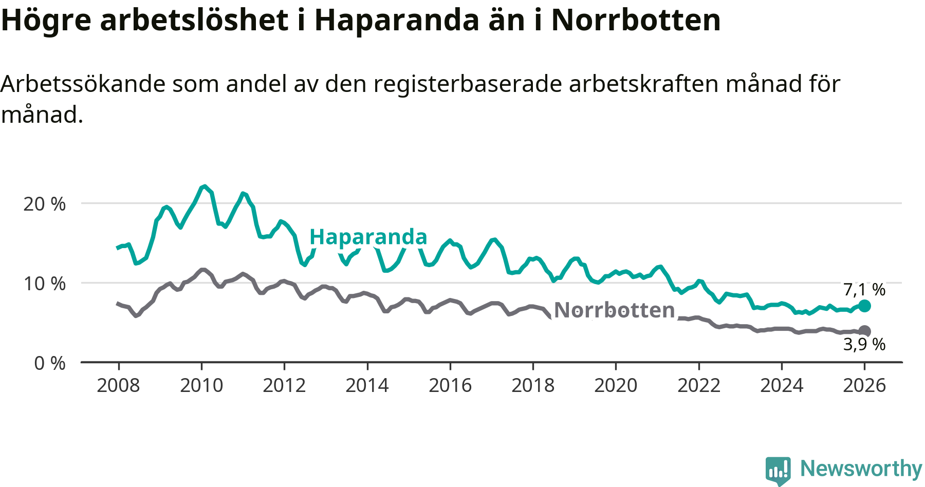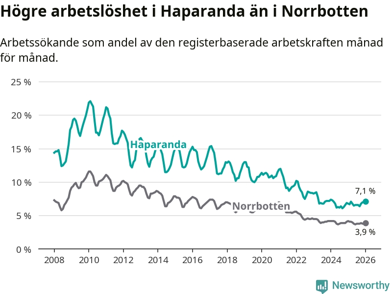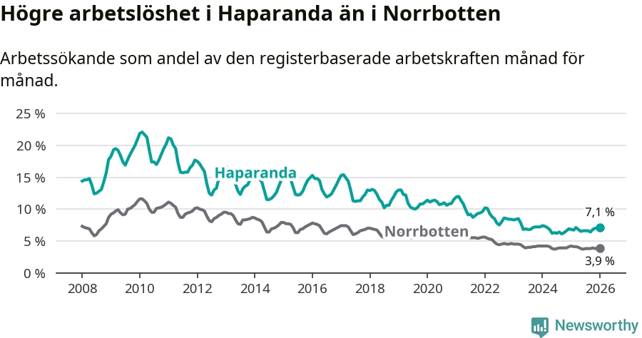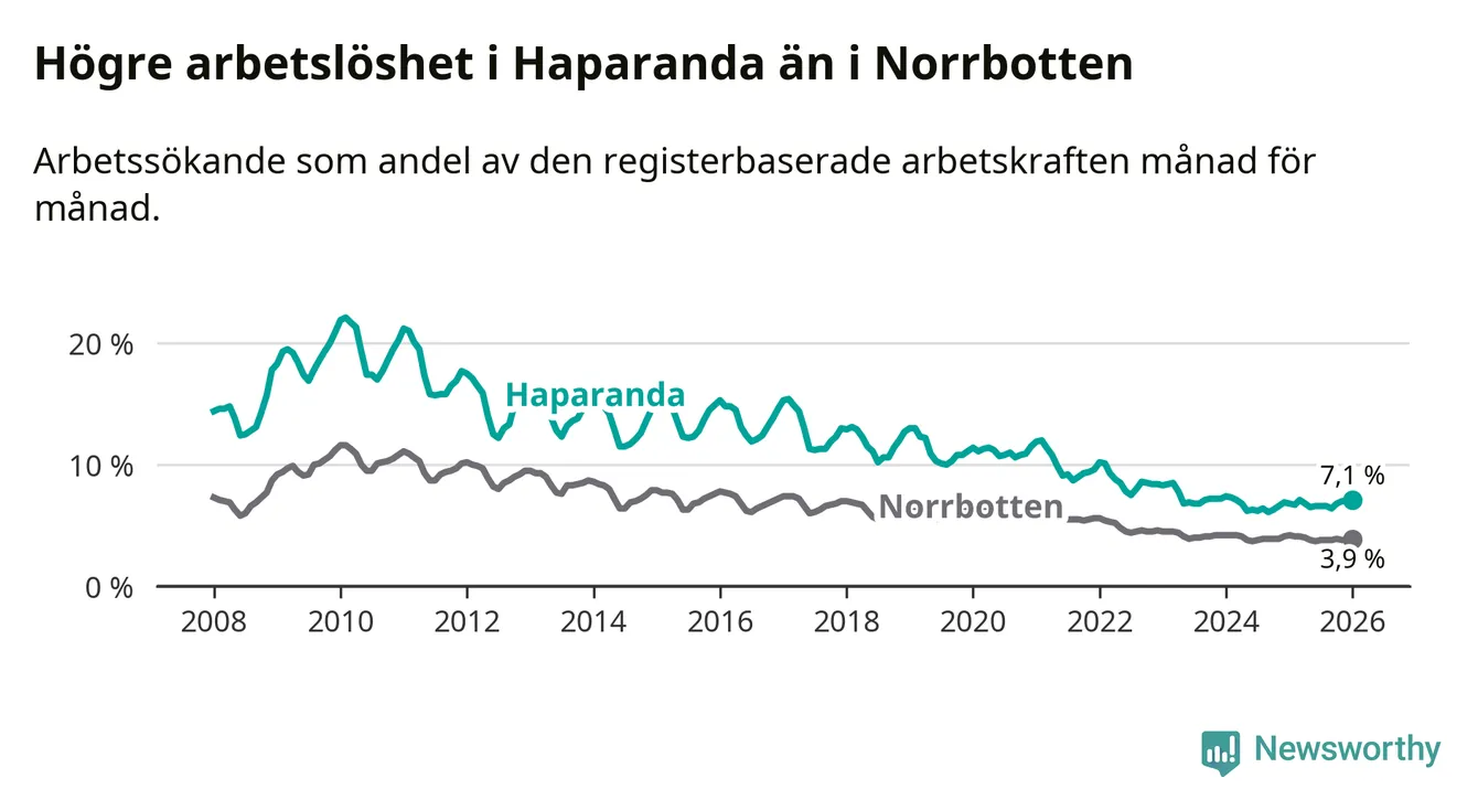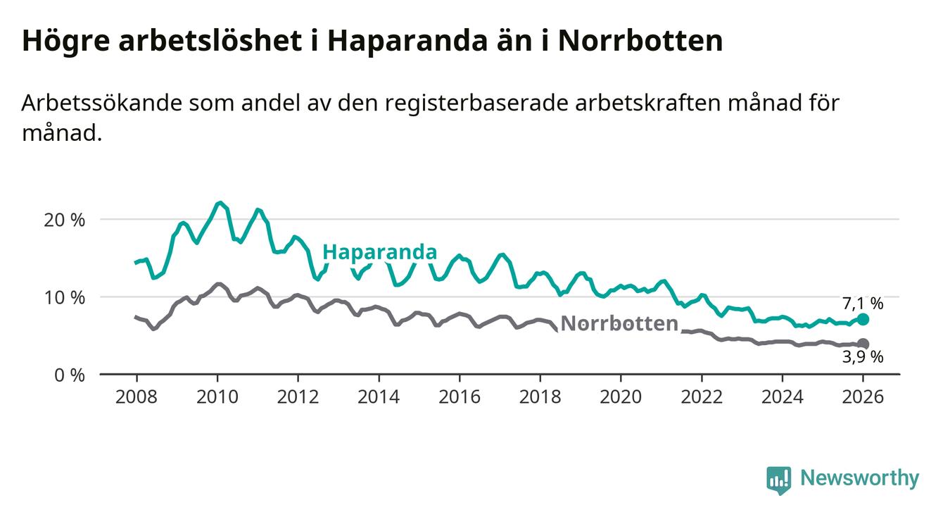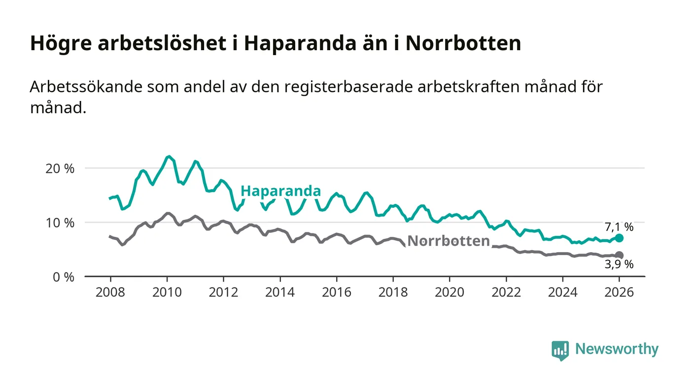 Anmärkningsvärt är att arbetslösheten nu, för första gången sedan mars 2023, är högre i Haparanda än snittet i Norrbotten, även om skillnaden bara är 0,1 procentenheter.