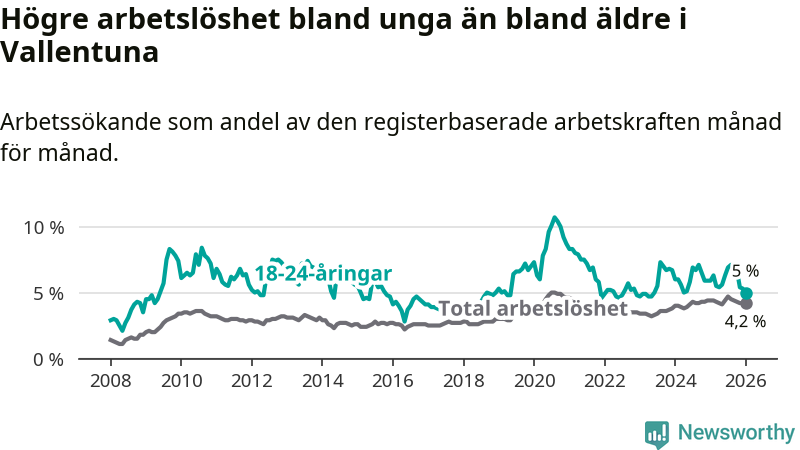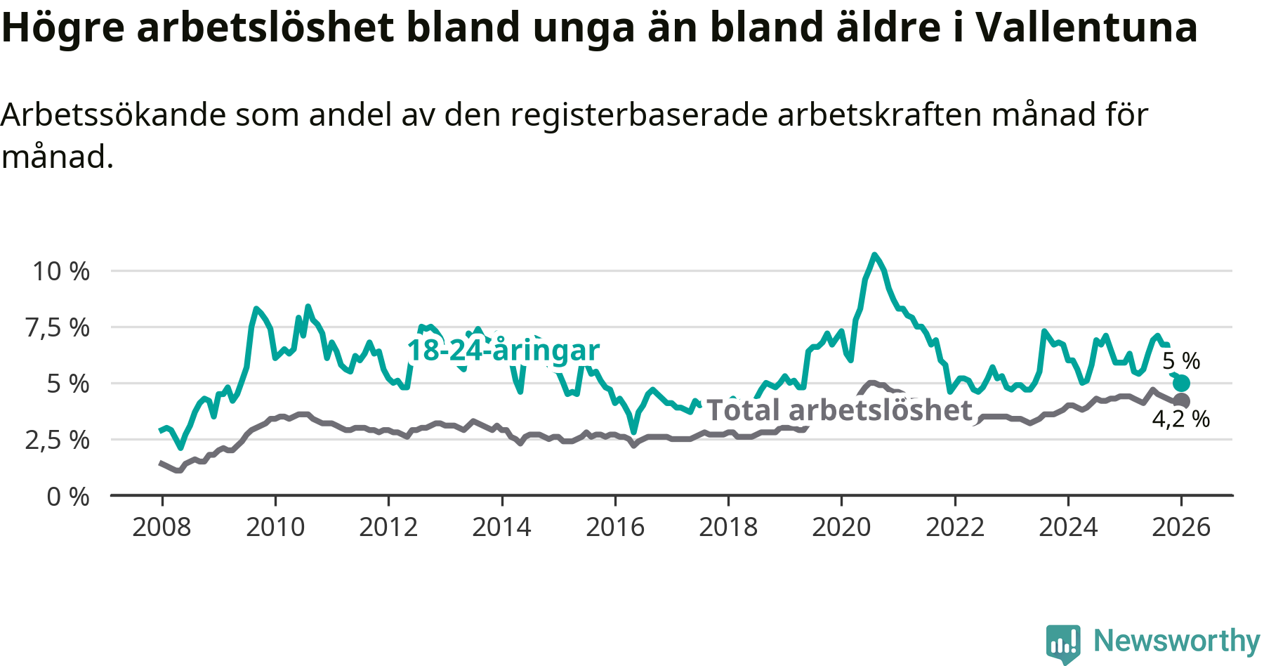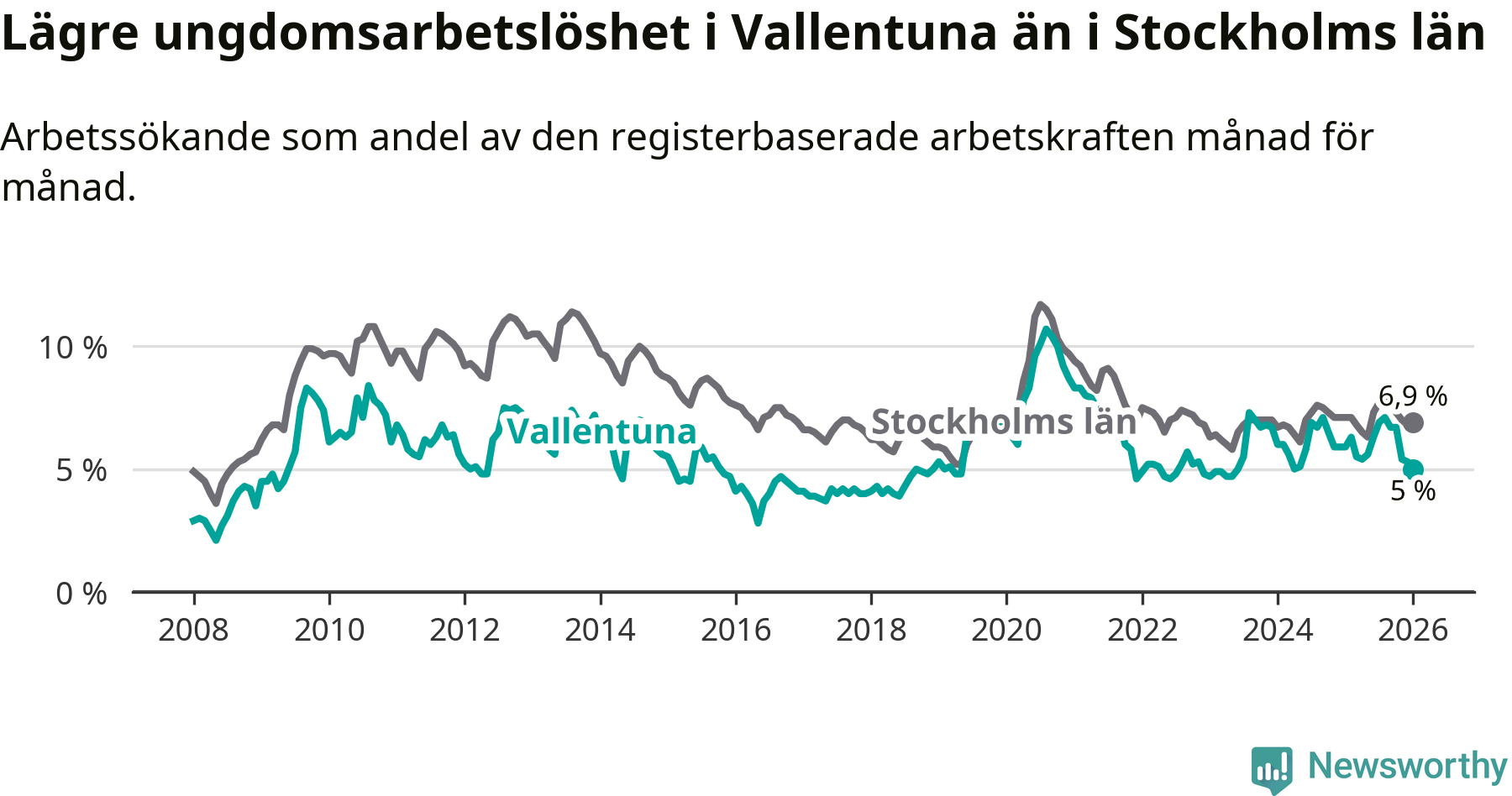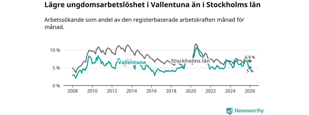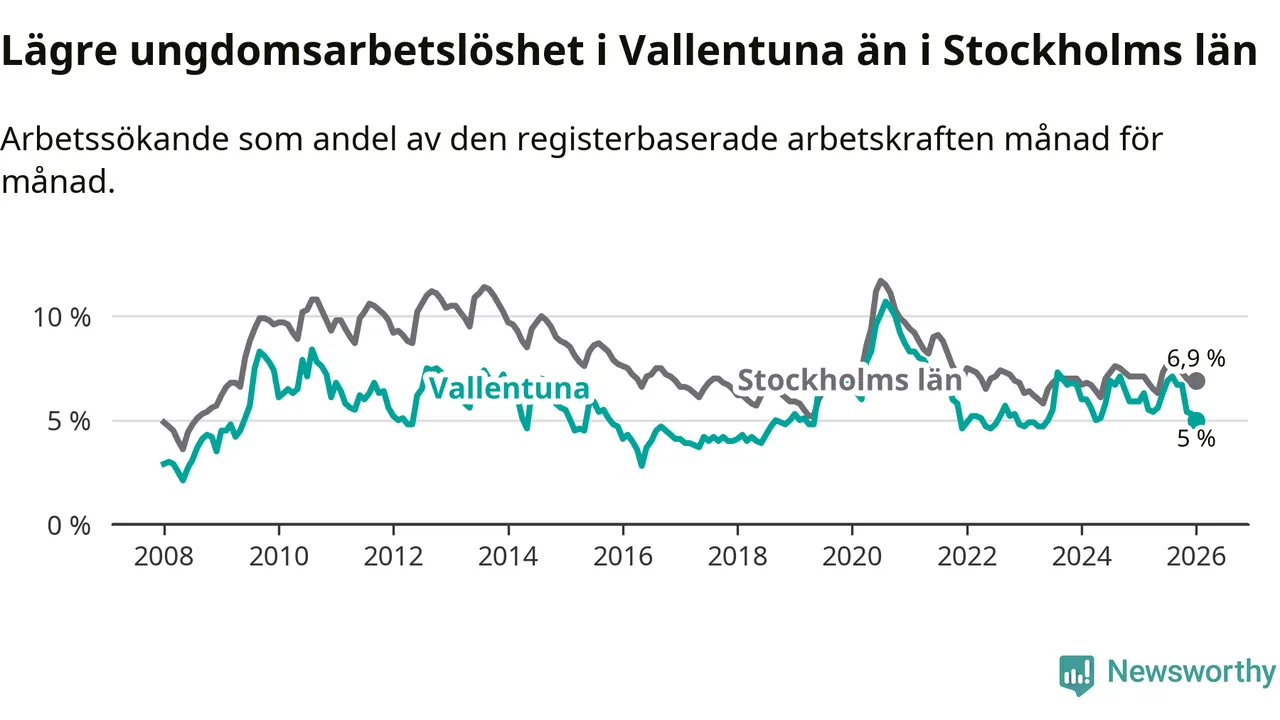 Precis som den totala arbetslösheten ligger ungdomsarbetslösheten i Vallentuna lägre än i Stockholms län som helhet. Skillnaden mellan kommunen och länet är 1,9 procentenheter.