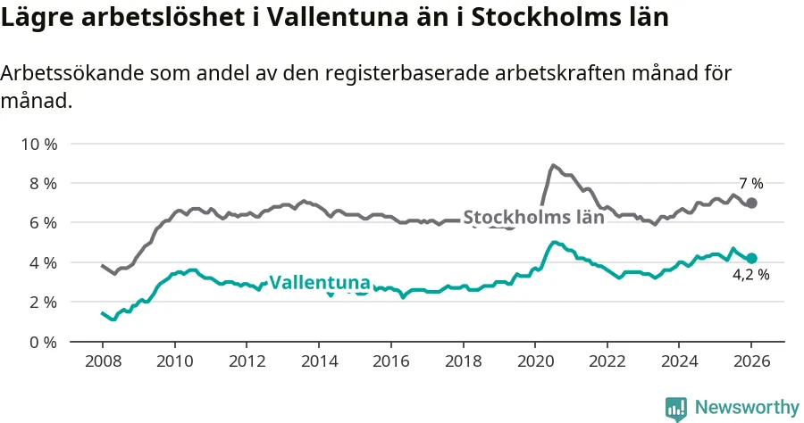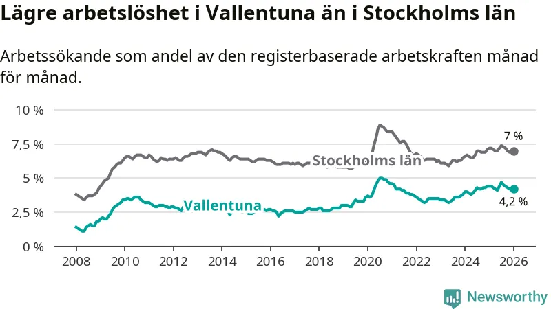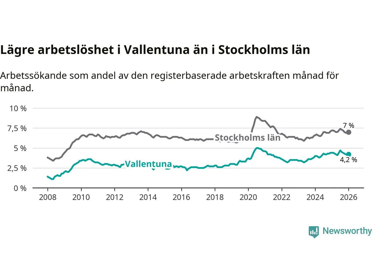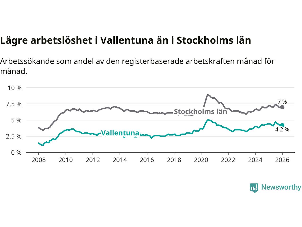 Under januari månad rapporterade Vallentuna kommun en total arbetslöshet på 4,2 procent. Det är en minskning jämfört med samma tidpunkt i fjol (−0,2 procentenheter). Även i Stockholms län sjunker arbetslösheten något.