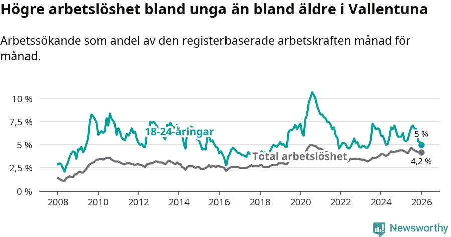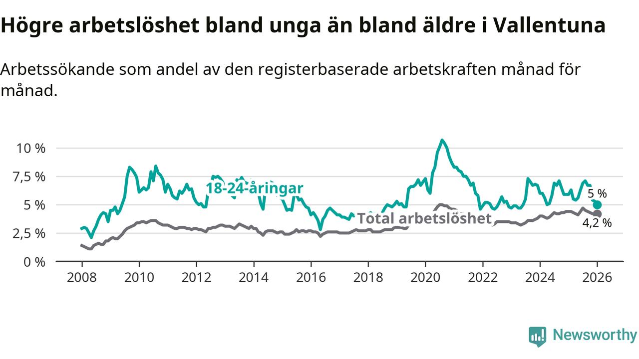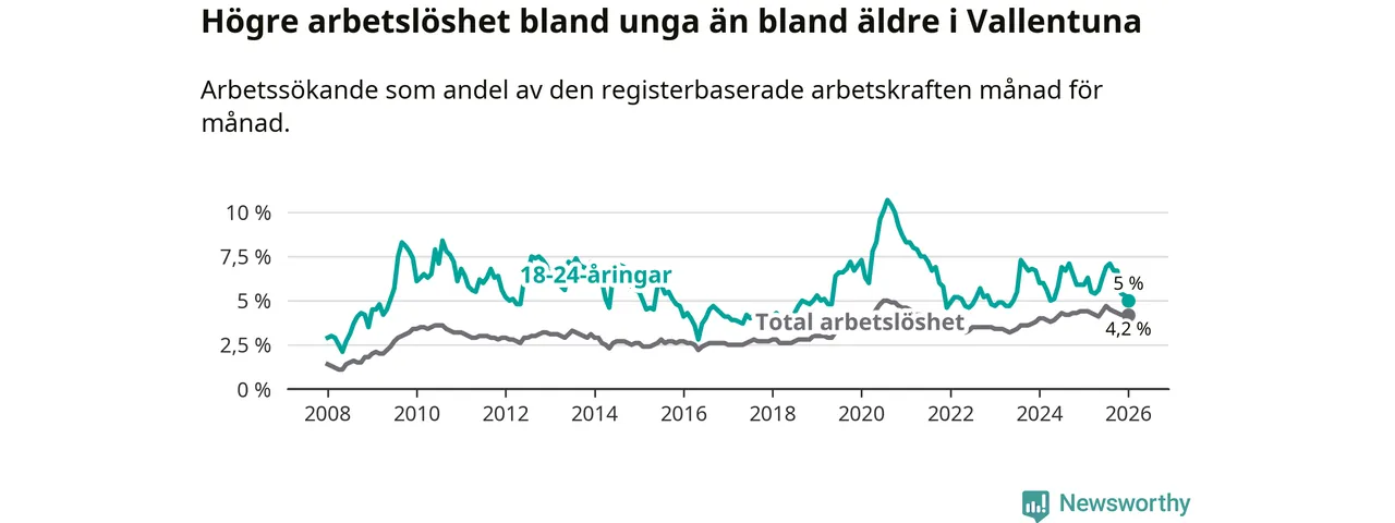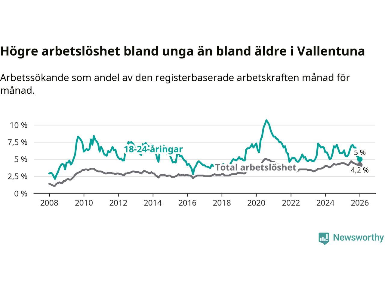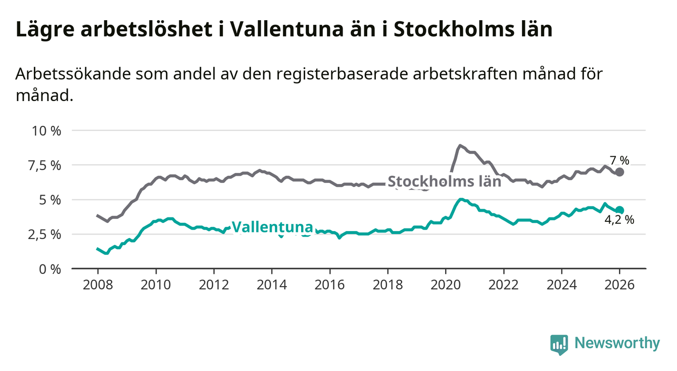 Under januari månad rapporterade Vallentuna kommun en total arbetslöshet på 4,2 procent. Det är en minskning jämfört med samma tidpunkt i fjol (−0,2 procentenheter). Även i Stockholms län sjunker arbetslösheten något.