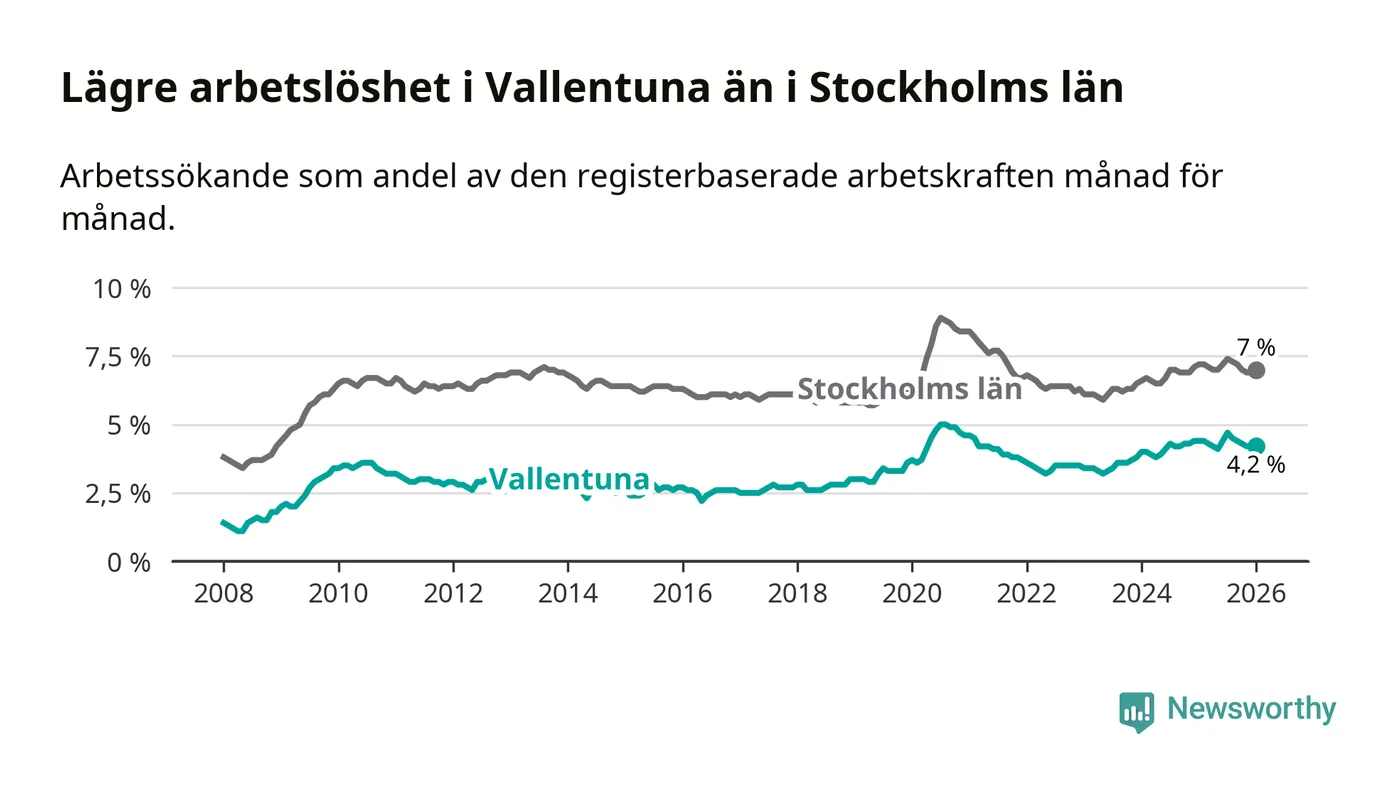 Vallentuna hade redan tidigare lägre arbetslöshet än snittet i hela Stockholms län och nu växer klyftan (4,2 procent i kommunen, jämfört med 7,0 procent i hela länet). Ekerö har den lägsta arbetslösheten i länet (3,7 procent), medan Södertälje har den högsta (10,9 procent). För att Vallentuna skulle komma ner i samma arbetslöshetsnivå som Ekerö skulle 91 personer behöva sysselsättas.