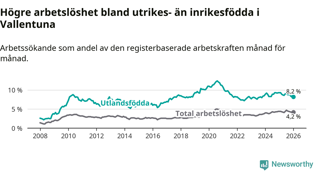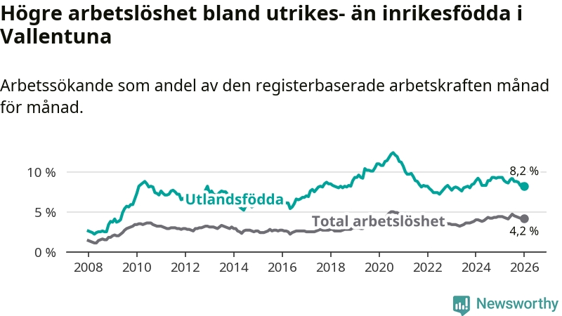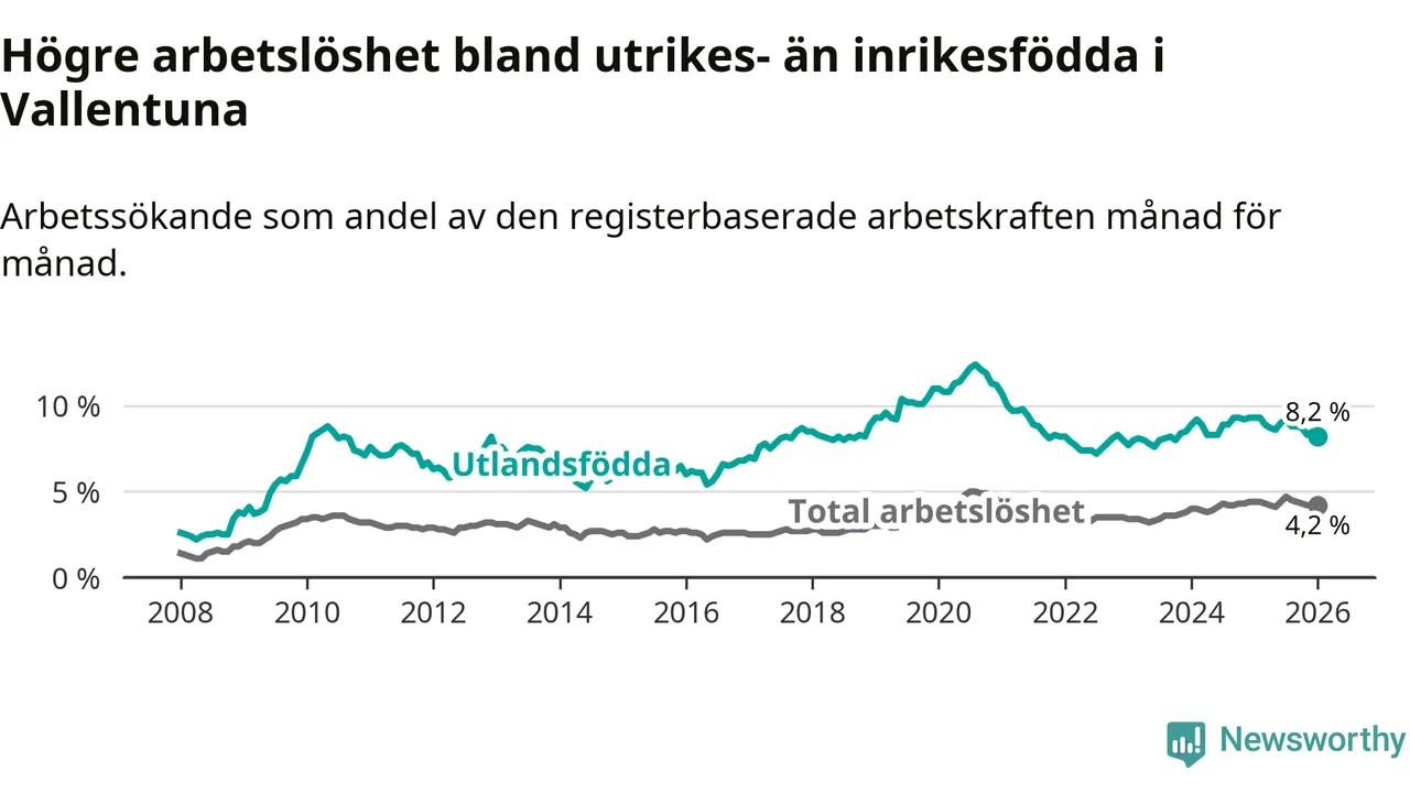 Arbetslösheten bland utlandsfödda var 8,2 procent i Vallentuna under januari månad, motsvarande 295 av 3 598 personer. Det är 1,1 procentenheter färre än vid samma tidpunkt i fjol (−32 om man räknar personer). Därmed är de utlandsföddas arbetslöshet lägre än vid samma tidpunkt i fjol för sjätte månaden i följd.