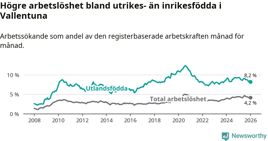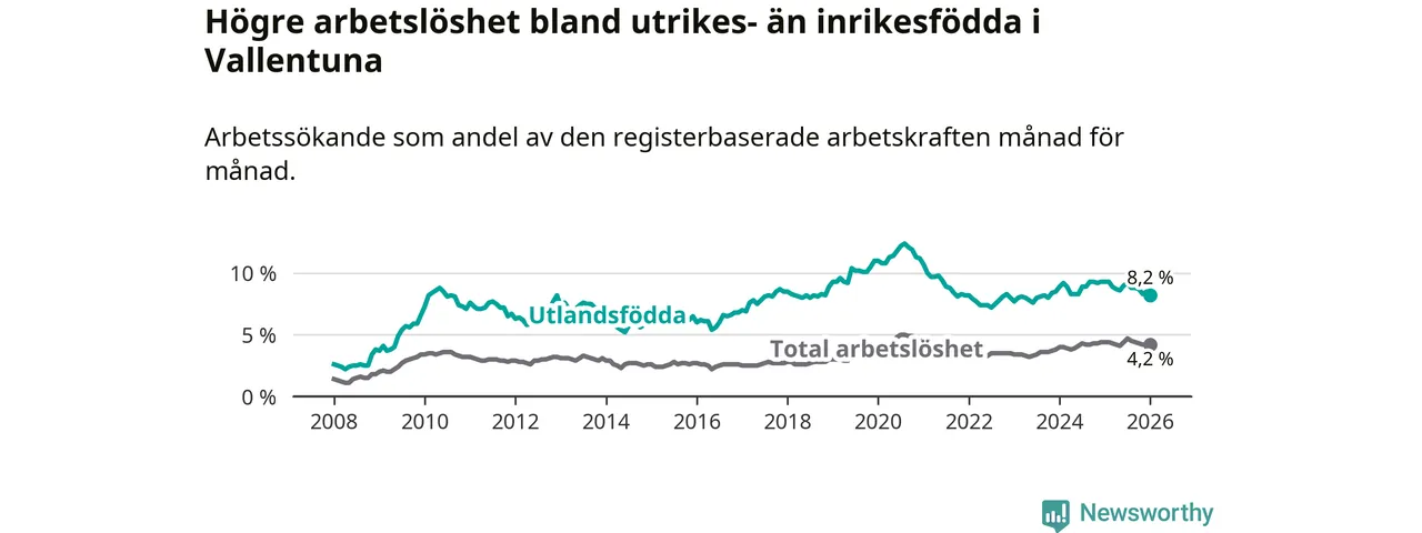 Skillnaden i arbetslöshet mellan utrikesfödda och hela befolkningen är 4,0 procentenheter i Vallentuna. Det är en mindre skillnad än för ett år sedan (−0,9 procentenheter).