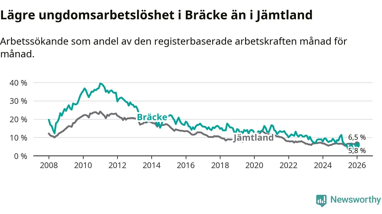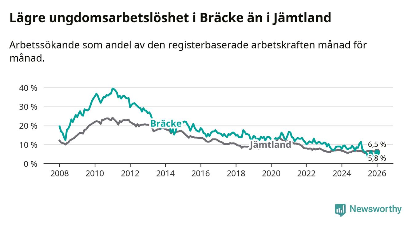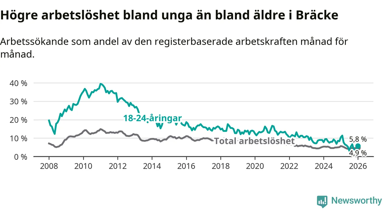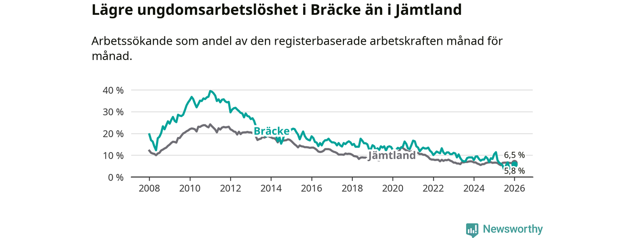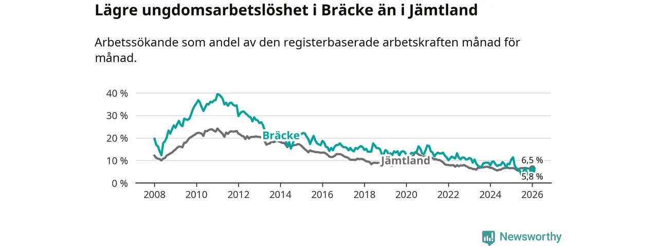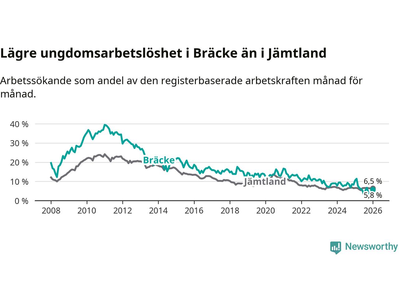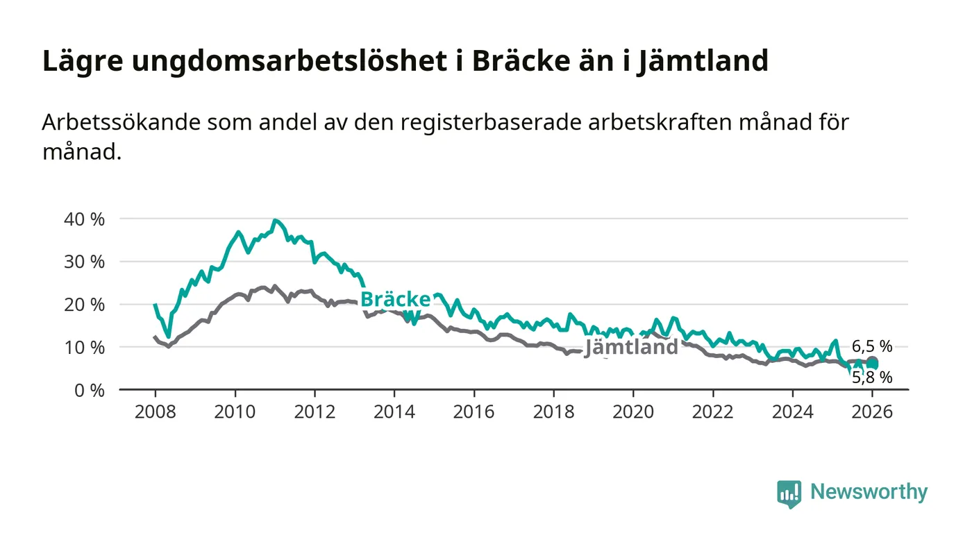 I och med den senaste månadens nedgång har de ungas arbetslöshet i Bräcke sjunkit elva månader i följd (ner från 11,4 procent i februari 2025 till 5,8 procent nu).