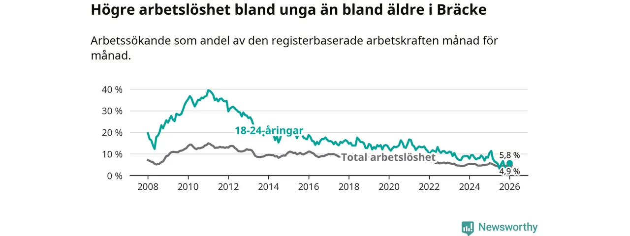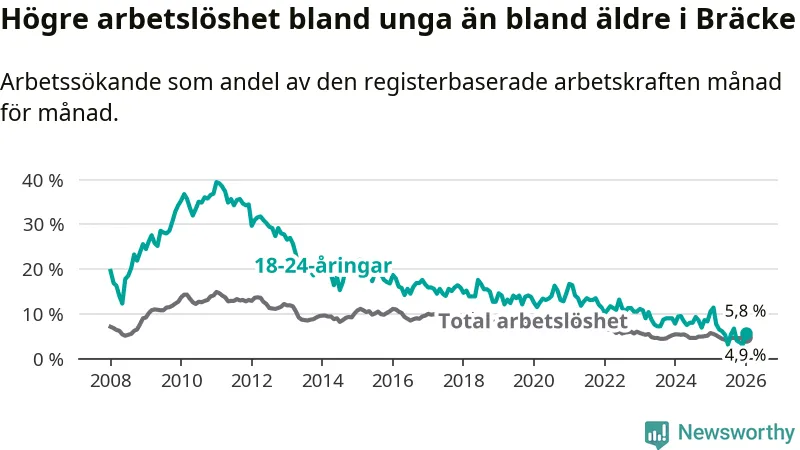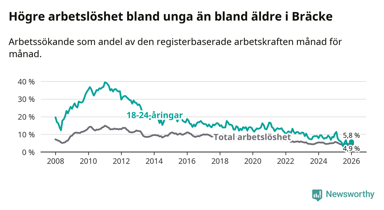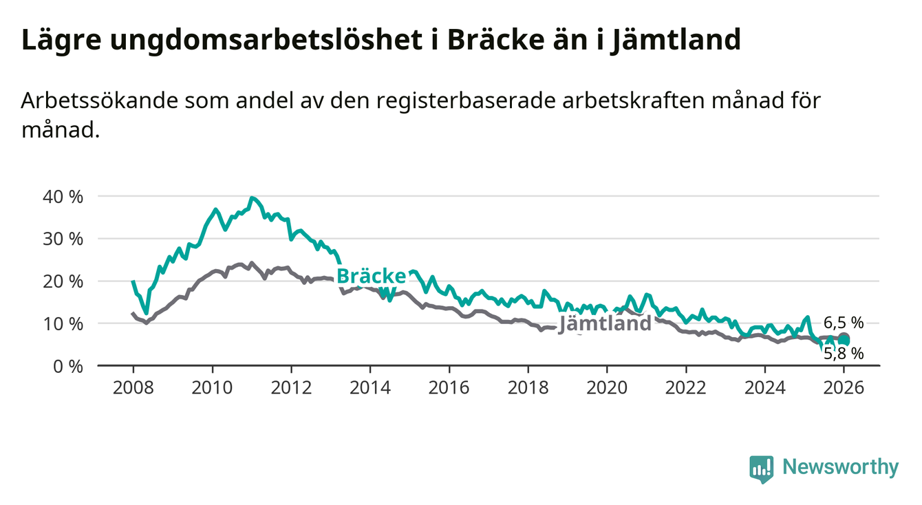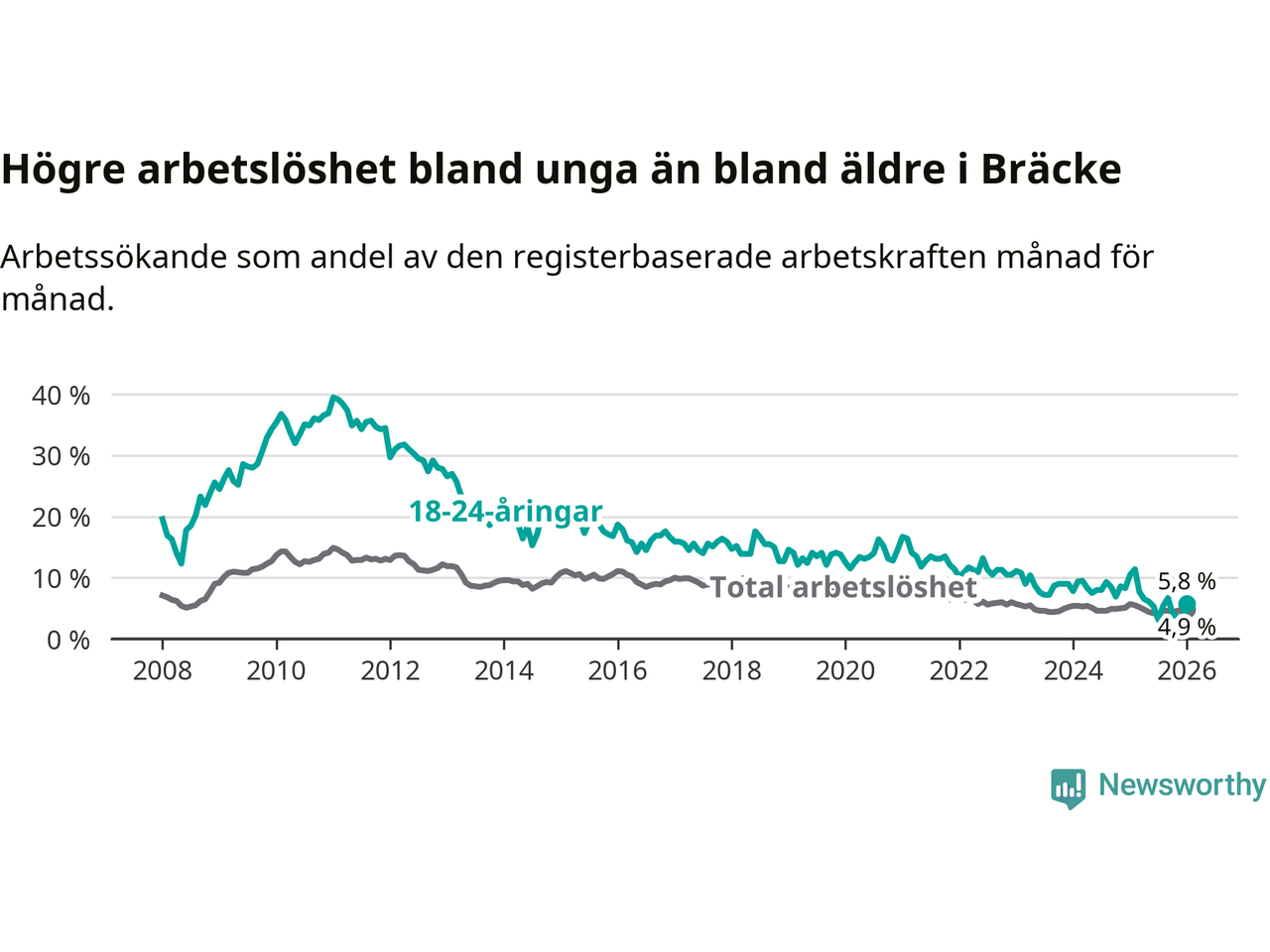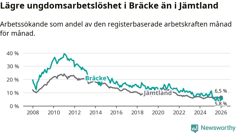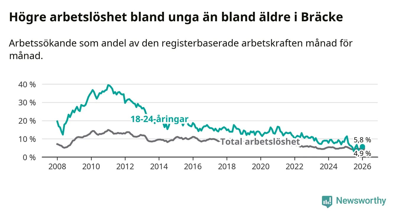 I och med den senaste månadens nedgång har de ungas arbetslöshet i Bräcke sjunkit elva månader i följd (ner från 11,4 procent i februari 2025 till 5,8 procent nu).