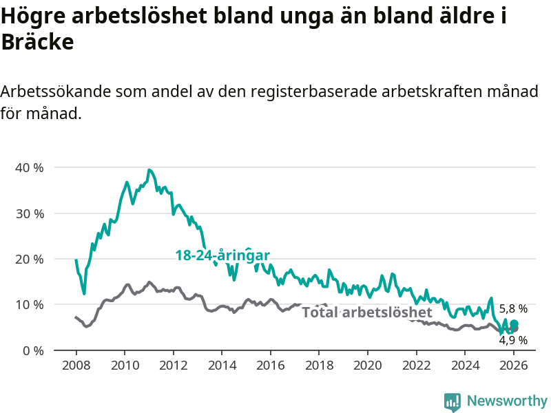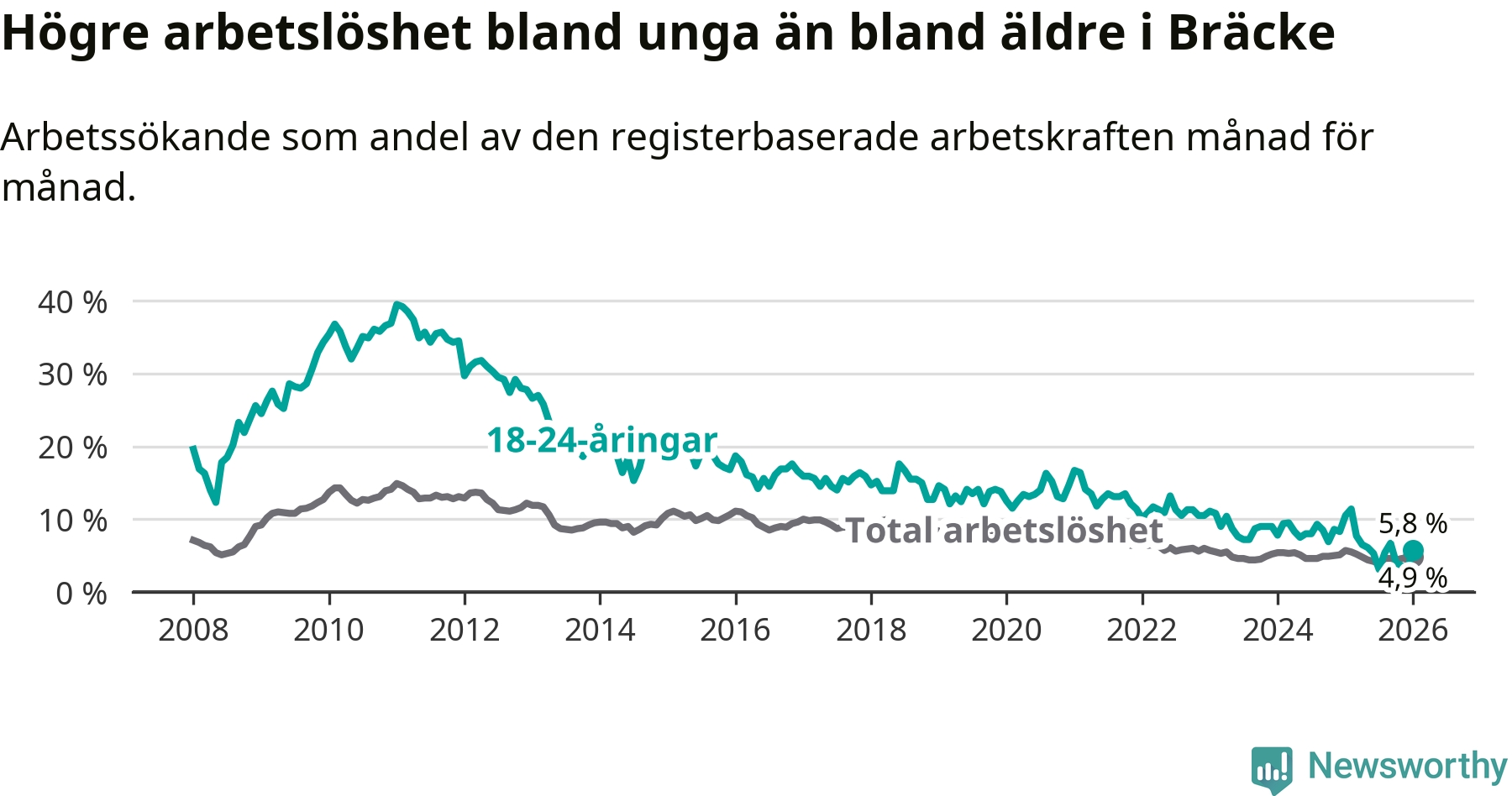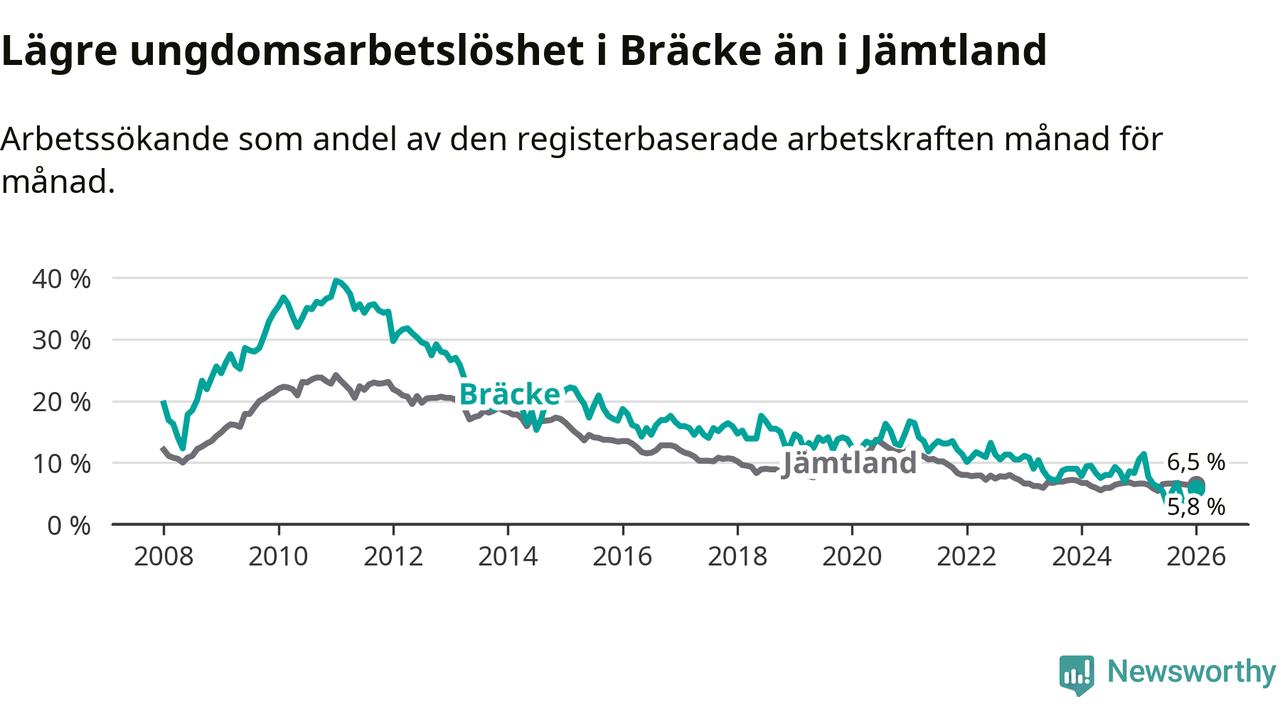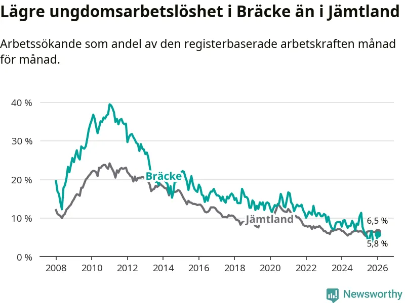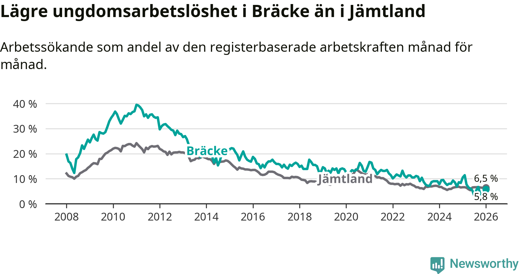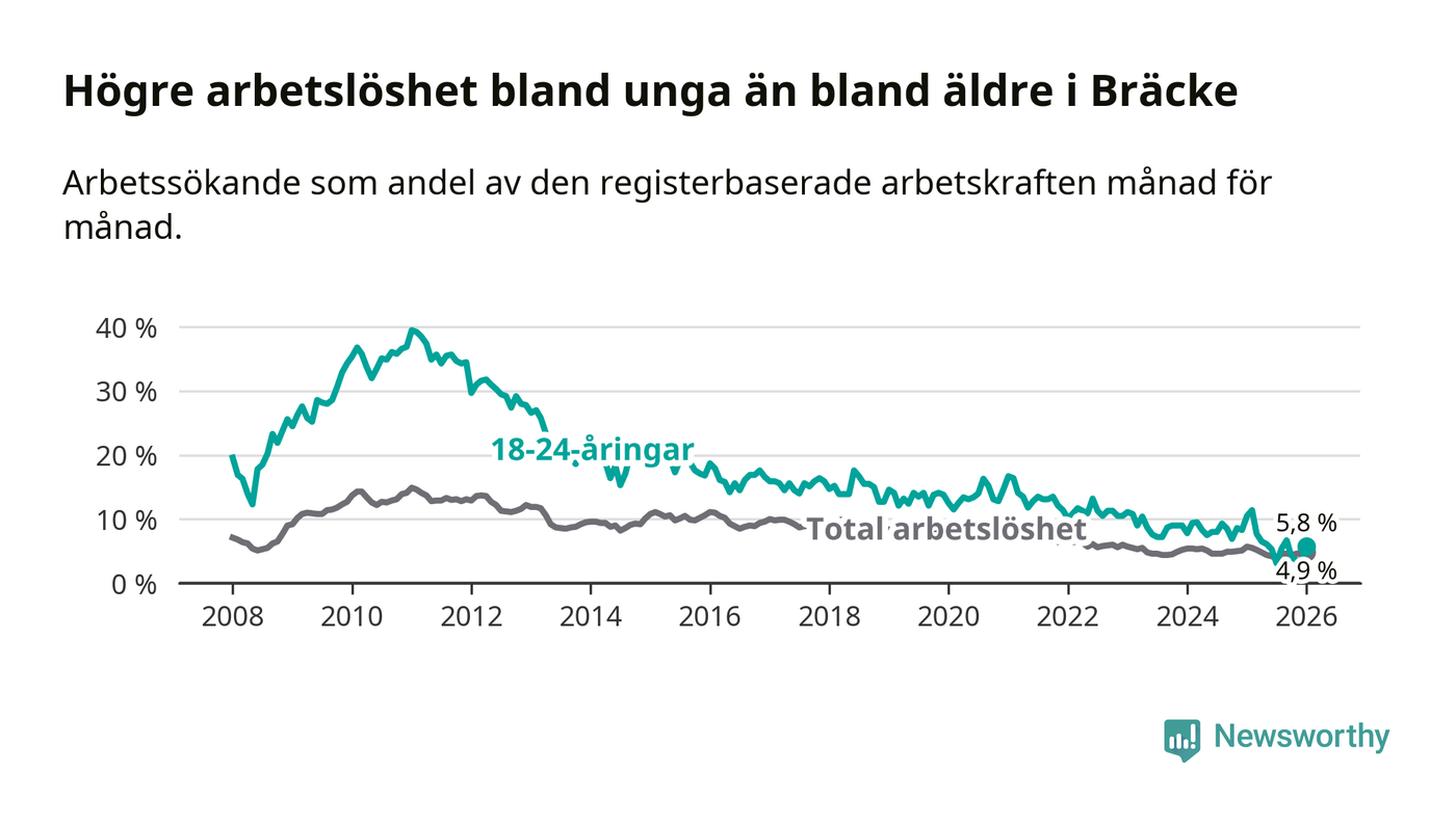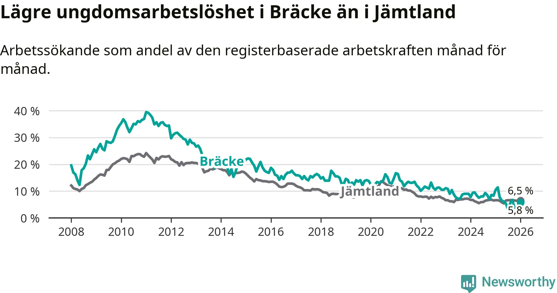 I och med den senaste månadens nedgång har de ungas arbetslöshet i Bräcke sjunkit elva månader i följd (ner från 11,4 procent i februari 2025 till 5,8 procent nu).