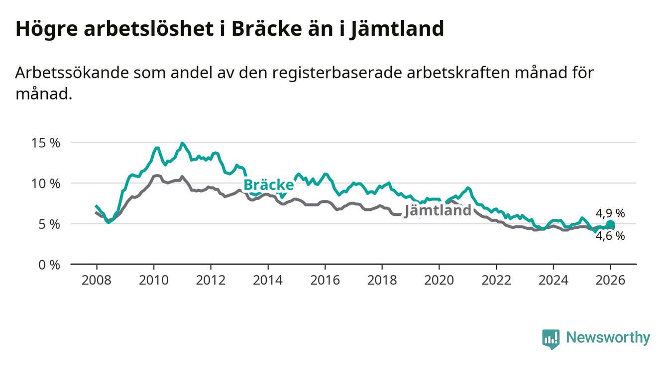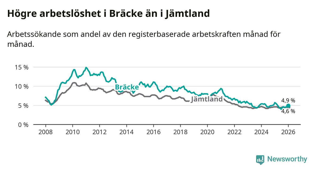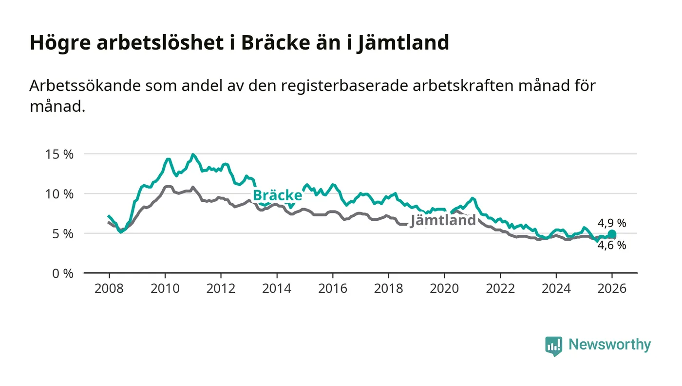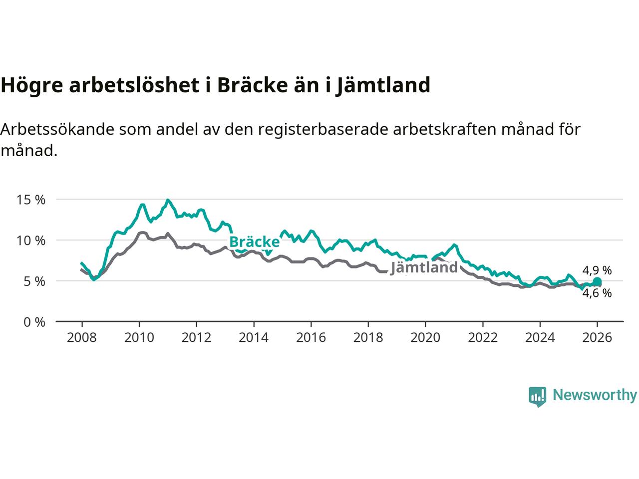 Under januari månad rapporterade Bräcke kommun en total arbetslöshet på 4,9 procent. Det är en minskning jämfört med samma tidpunkt i fjol (−0,8 procentenheter). I Jämtlands län däremot står arbetslösheten stilla.
