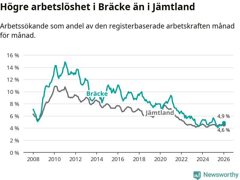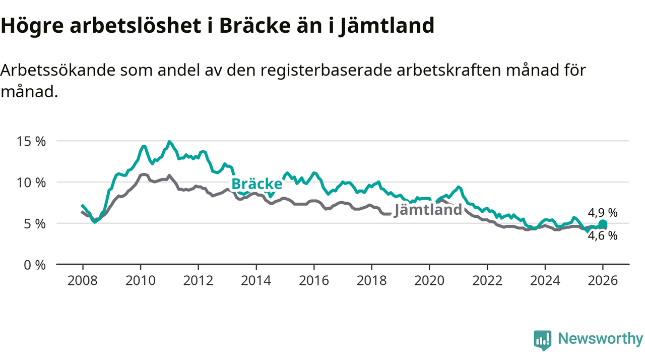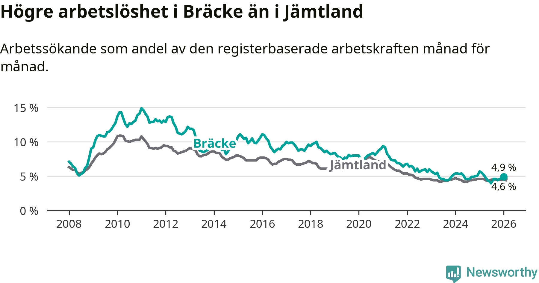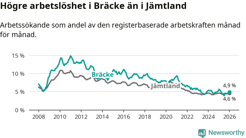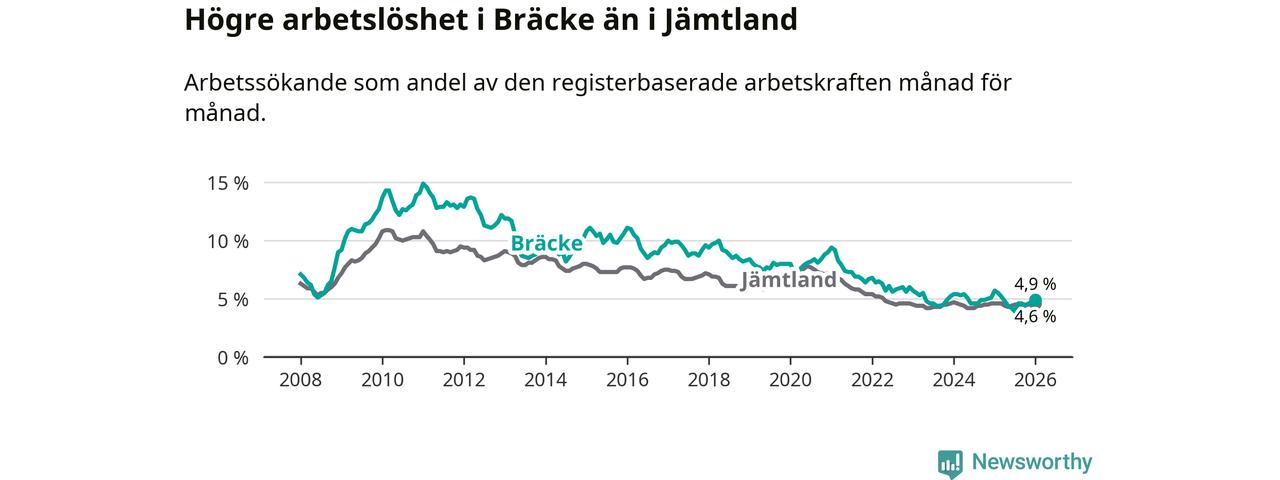Under januari månad rapporterade Bräcke kommun en total arbetslöshet på 4,9 procent. Det är en minskning jämfört med samma tidpunkt i fjol (−0,8 procentenheter). I Jämtlands län däremot står arbetslösheten stilla.