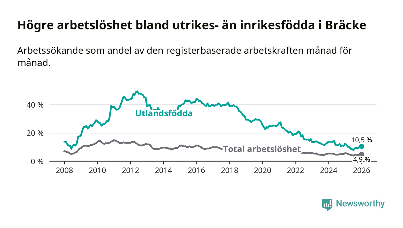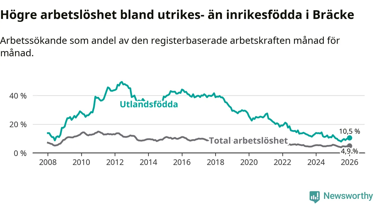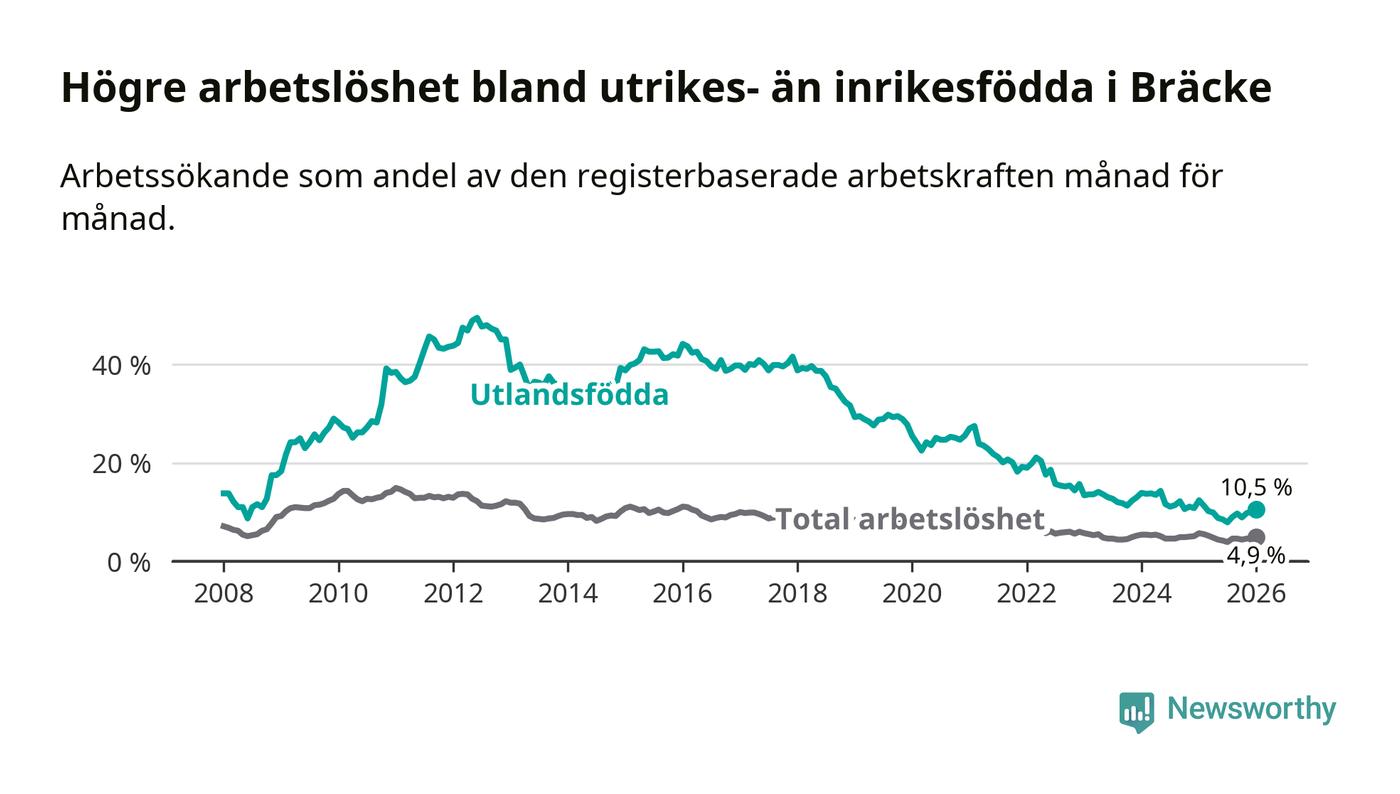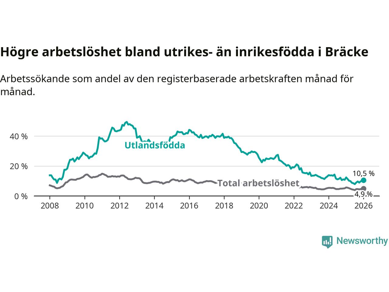 Arbetslösheten bland utlandsfödda var 10,5 procent i Bräcke under januari månad, motsvarande 41 av 390 personer. Det är 1,9 procentenheter färre än vid samma tidpunkt i fjol (−5 om man räknar personer). Därmed är de utlandsföddas arbetslöshet lägre än vid samma tidpunkt i fjol för 16:e månaden i följd. Sedan september 2024 har arbetslösheten bland utlandsfödda minskat från 12,2 till 10,5 procent.
