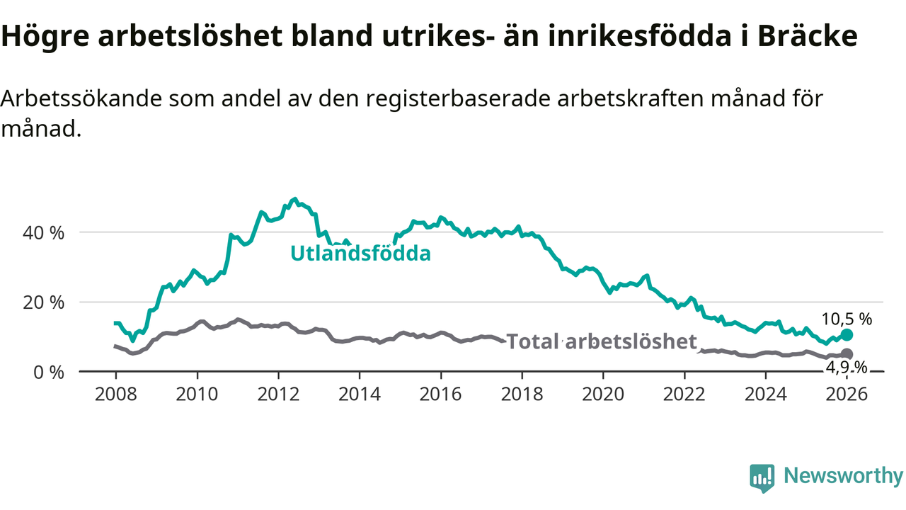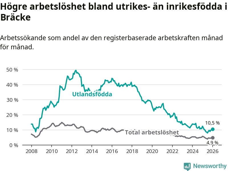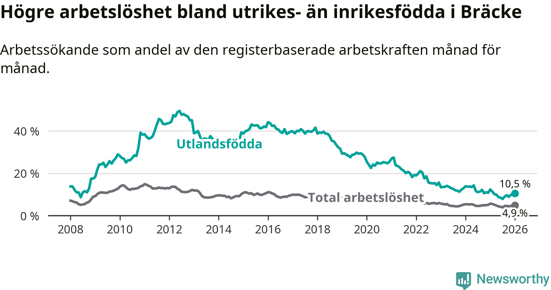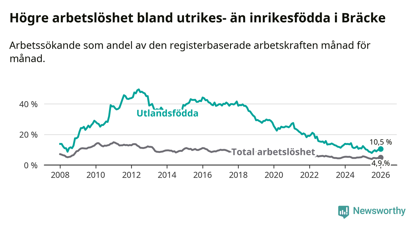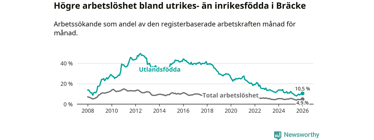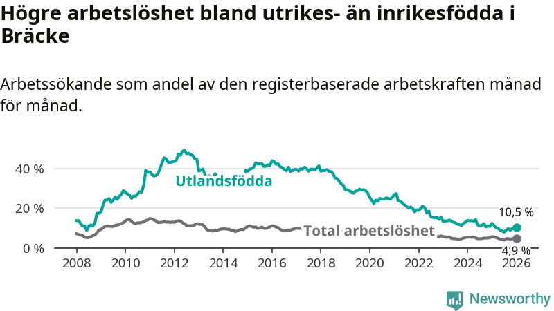 Arbetslösheten bland utlandsfödda var 10,5 procent i Bräcke under januari månad, motsvarande 41 av 390 personer. Det är 1,9 procentenheter färre än vid samma tidpunkt i fjol (−5 om man räknar personer). Därmed är de utlandsföddas arbetslöshet lägre än vid samma tidpunkt i fjol för 16:e månaden i följd. Sedan september 2024 har arbetslösheten bland utlandsfödda minskat från 12,2 till 10,5 procent.