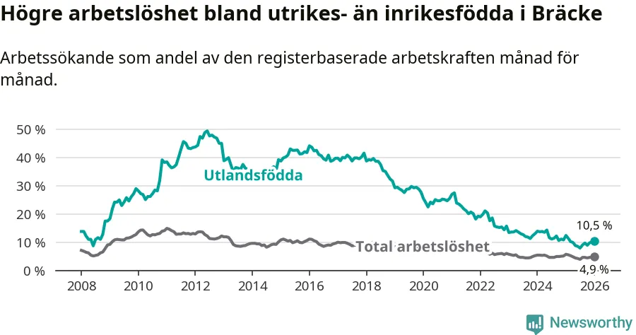Skillnaden i arbetslöshet mellan utrikesfödda och hela befolkningen är 5,6 procentenheter i Bräcke. Det är en mindre skillnad än för ett år sedan (−1,1 procentenheter).