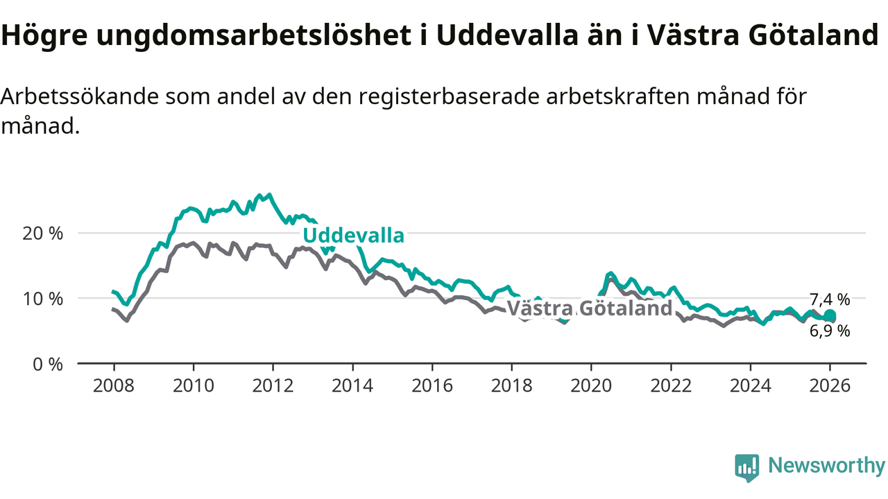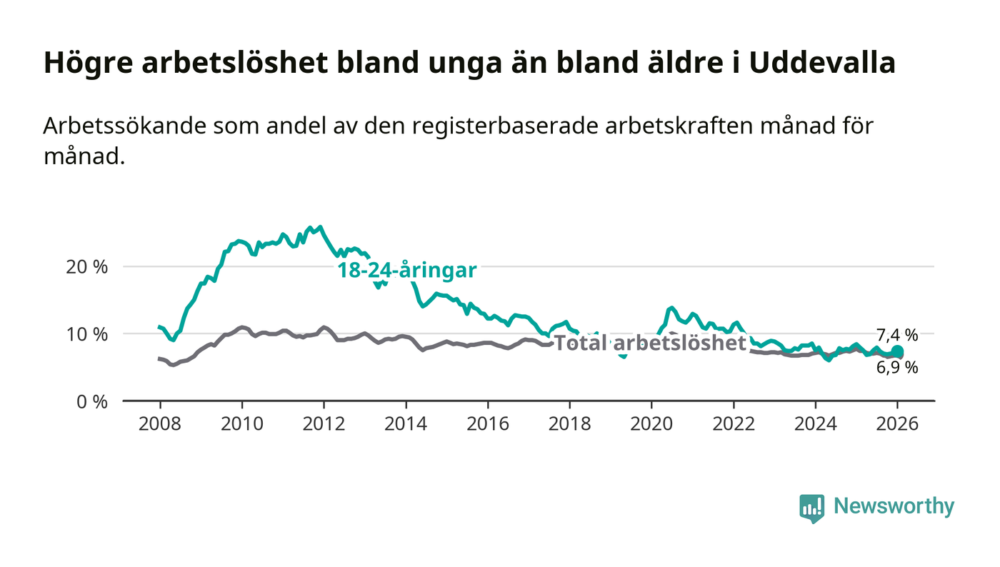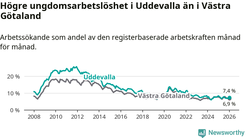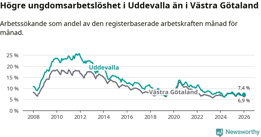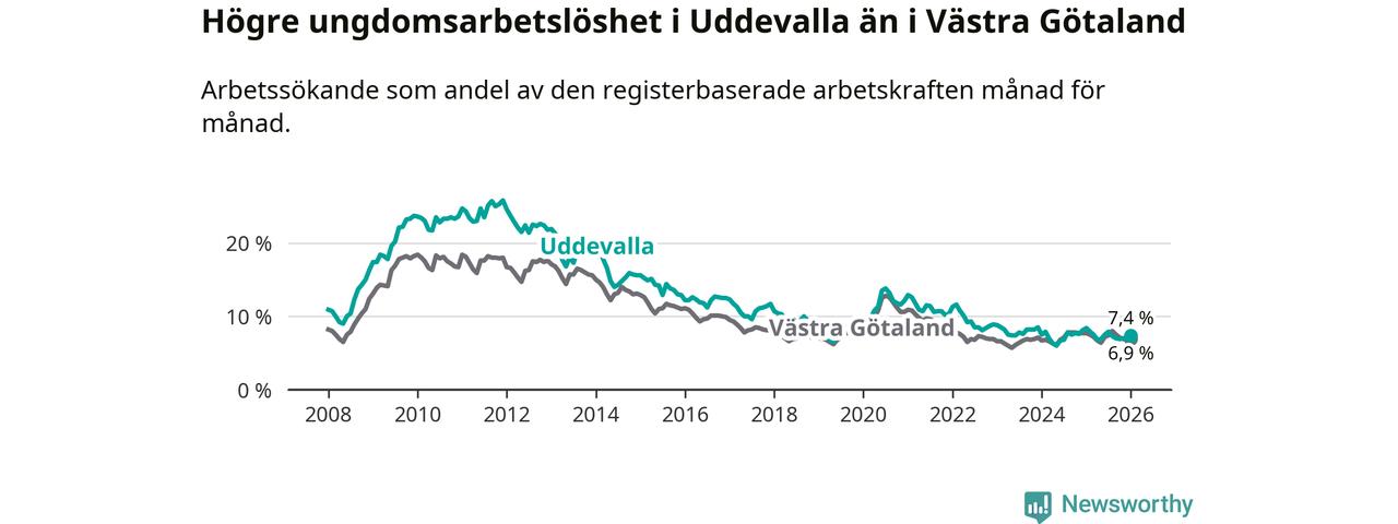 Precis som den totala arbetslösheten ligger ungdomsarbetslösheten i Uddevalla högre än i Västra Götaland som helhet. Skillnaden mellan kommunen och länet är 0,5 procentenheter.