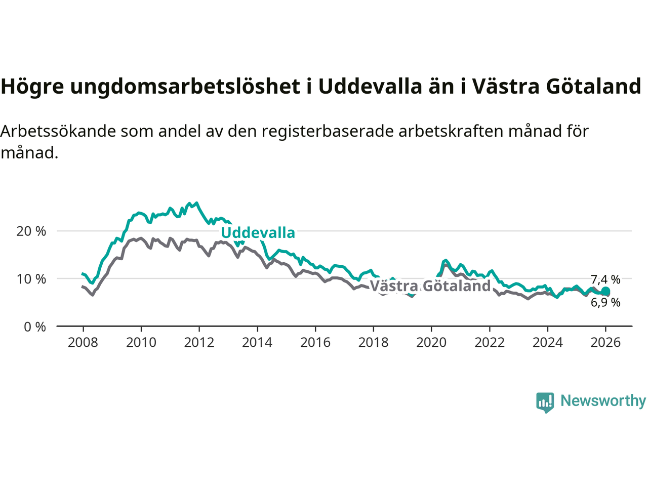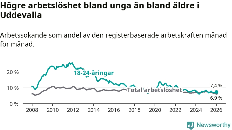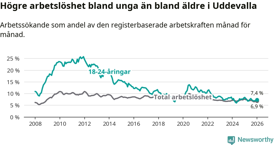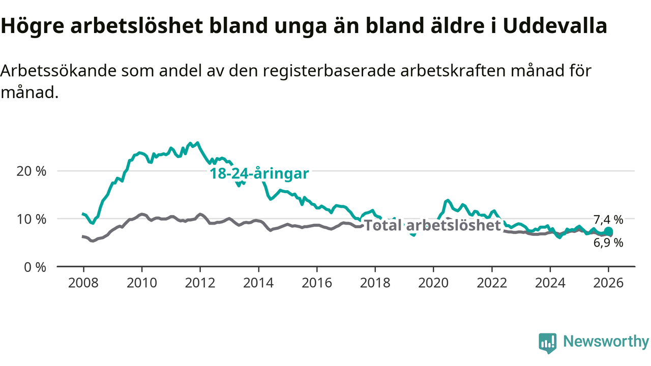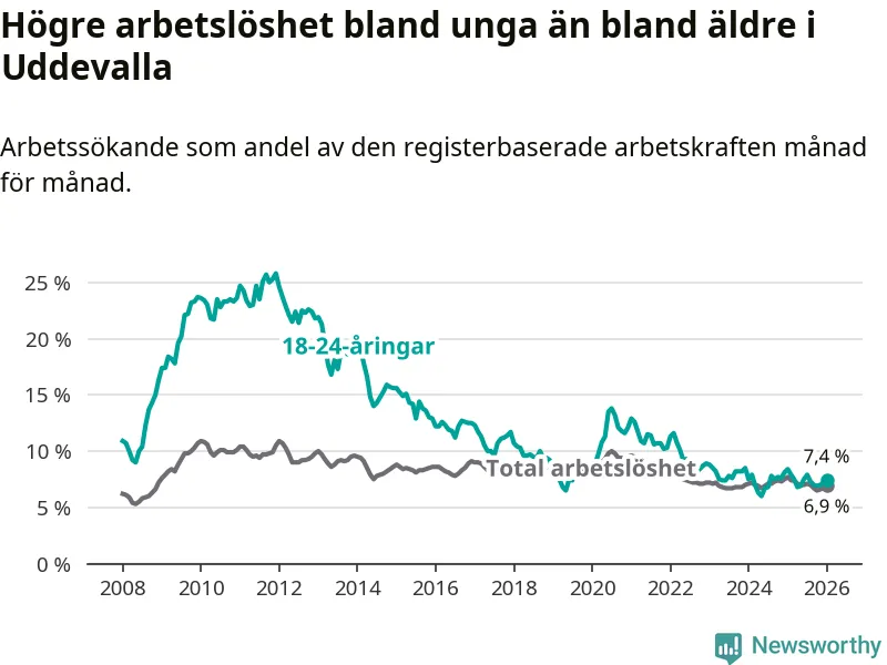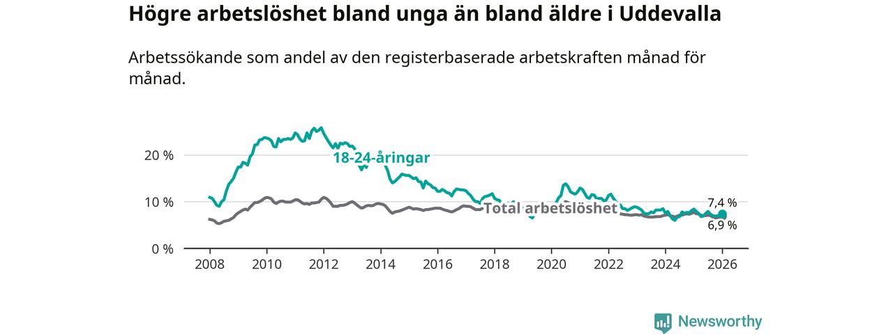 Precis som den totala arbetslösheten ligger ungdomsarbetslösheten i Uddevalla högre än i Västra Götaland som helhet. Skillnaden mellan kommunen och länet är 0,5 procentenheter.