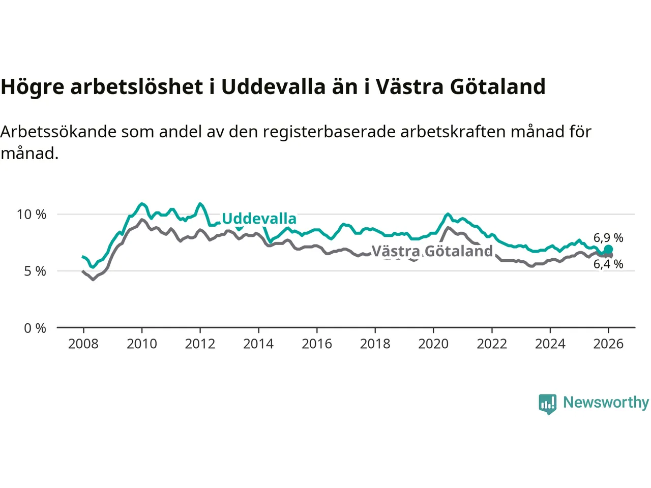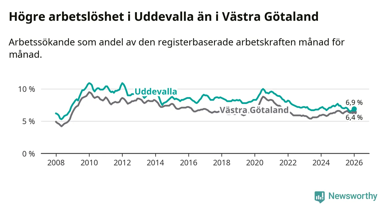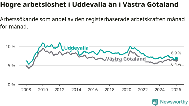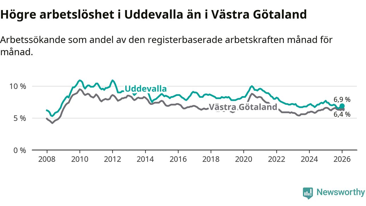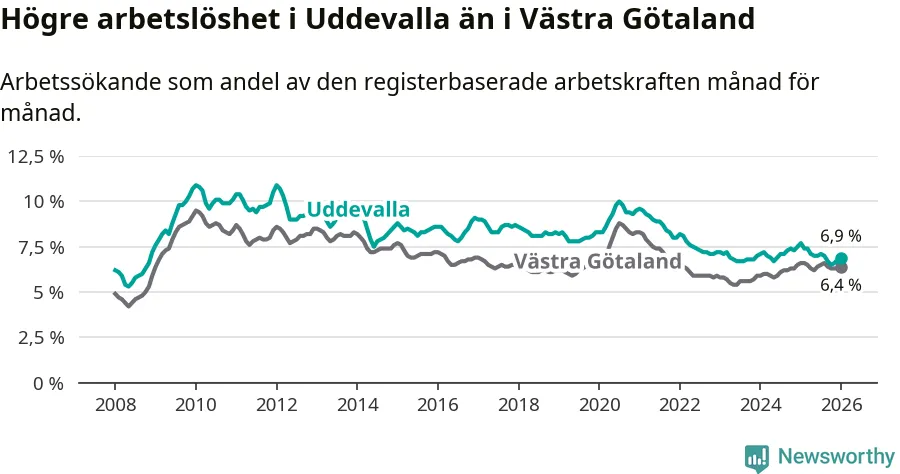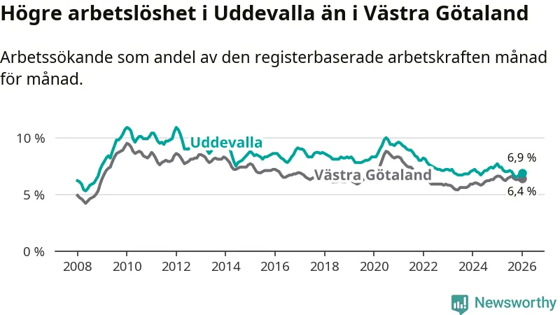 Under januari månad rapporterade Uddevalla kommun en total arbetslöshet på 6,9 procent. Det är en minskning jämfört med samma tidpunkt i fjol (−0,8 procentenheter). Även i Västra Götalands län sjunker arbetslösheten .