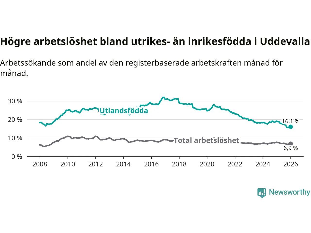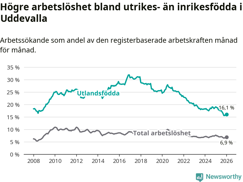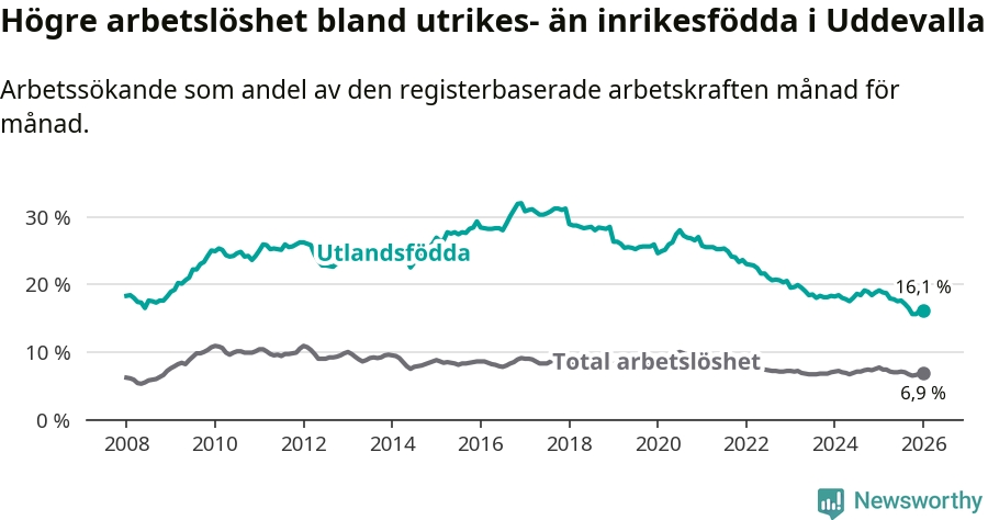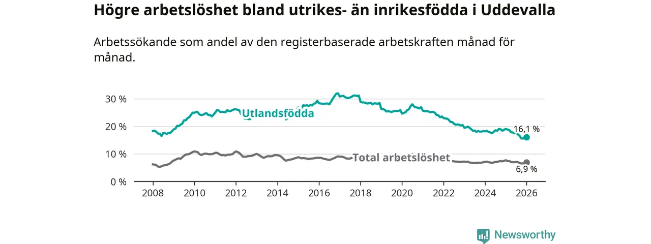 Arbetslösheten bland utlandsfödda var 16,1 procent i Uddevalla under januari månad, motsvarande 997 av 6 193 personer. Det är 3,0 procentenheter färre än vid samma tidpunkt i fjol (−173 om man räknar personer). Därmed är de utlandsföddas arbetslöshet lägre än vid samma tidpunkt i fjol för åttonde månaden i följd. Sedan maj 2025 har arbetslösheten bland utlandsfödda minskat från 17,8 till 16,1 procent.
