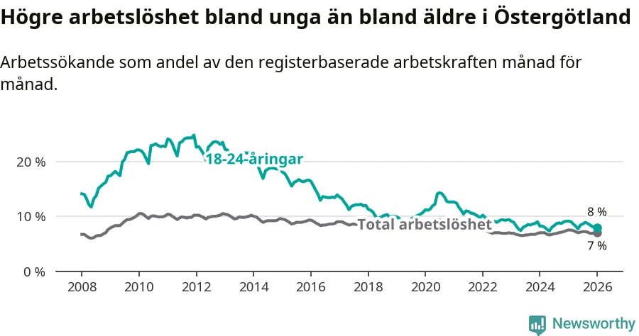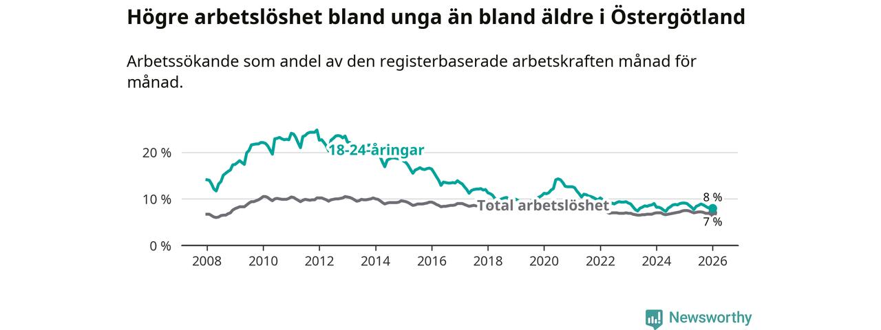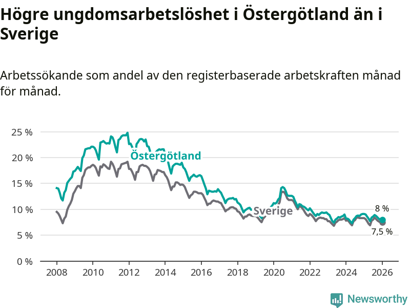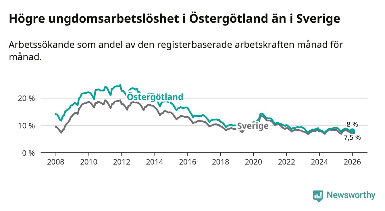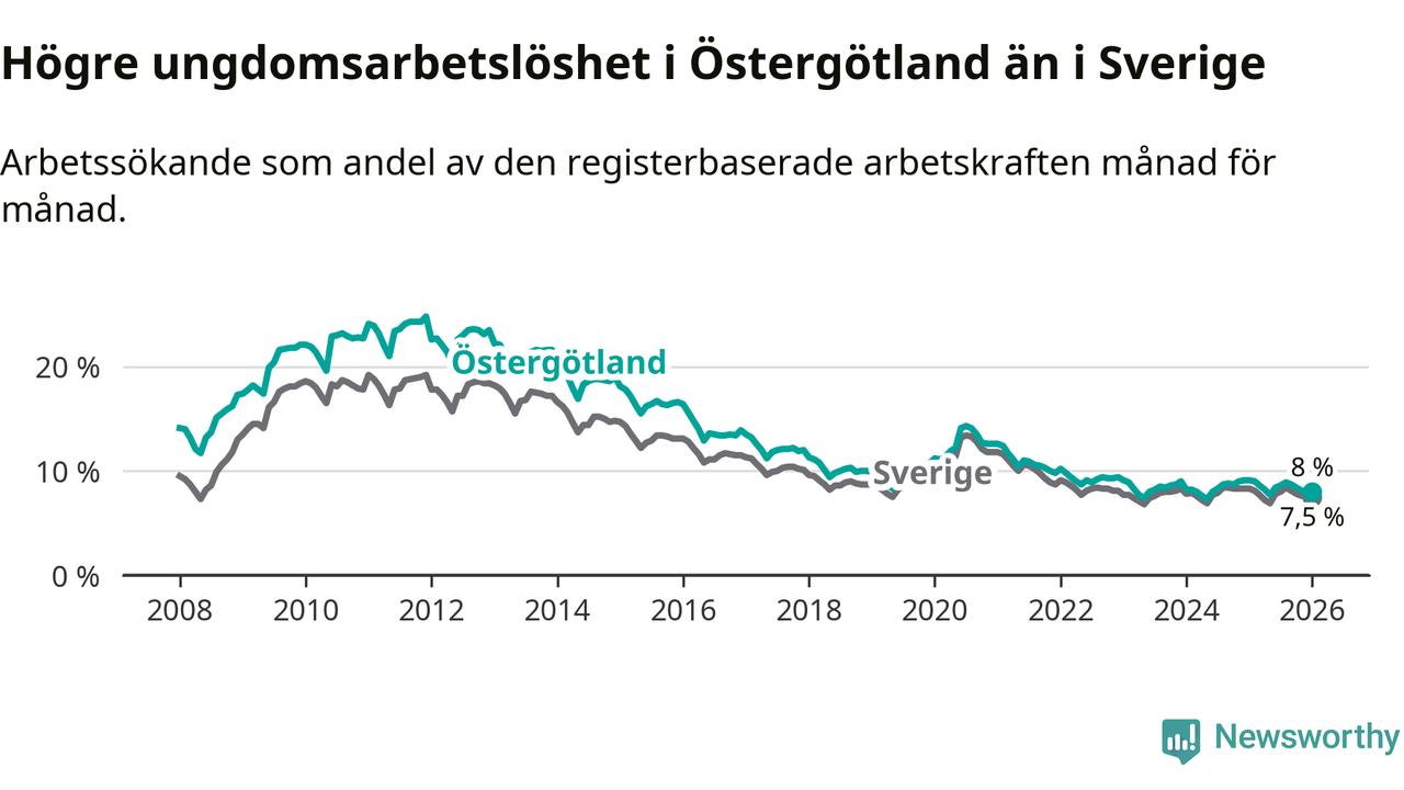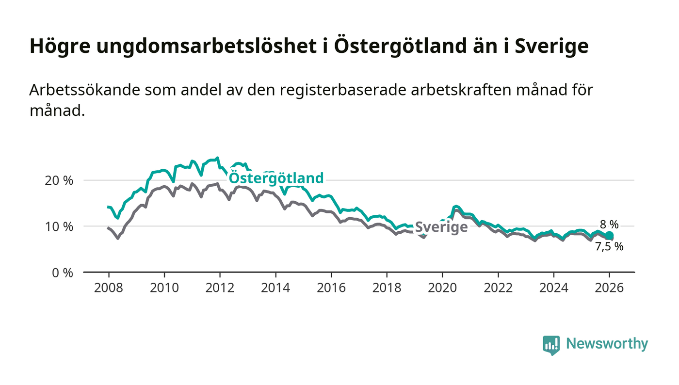 Precis som den totala arbetslösheten ligger ungdomsarbetslösheten i Östergötland högre än i Sverige som helhet. Skillnaden mellan länet och riket är 0,5 procentenheter.