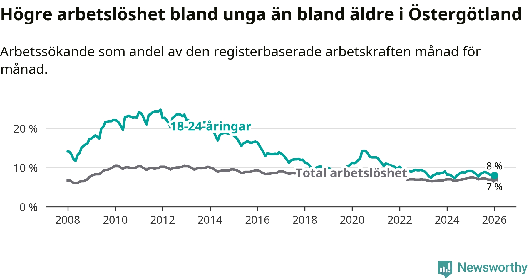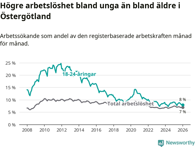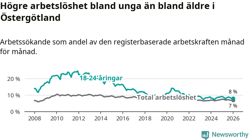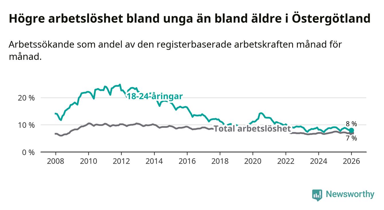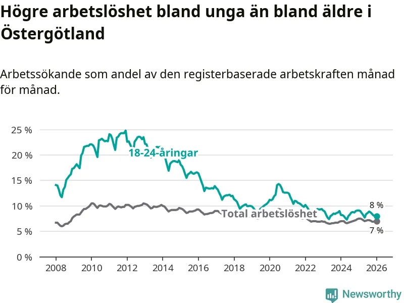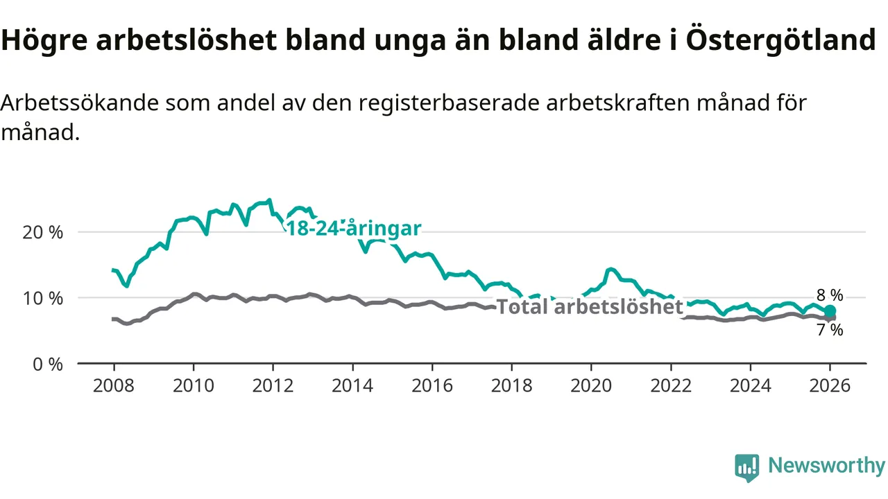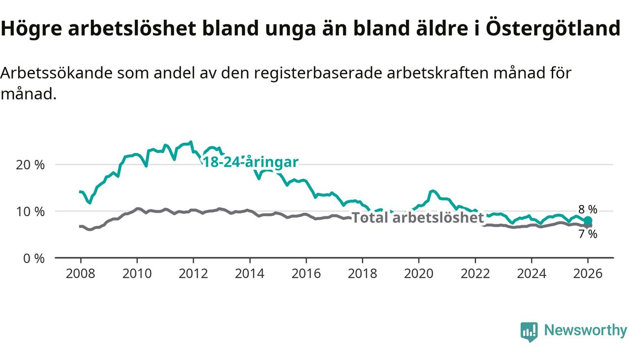 Precis som den totala arbetslösheten ligger ungdomsarbetslösheten i Östergötland högre än i Sverige som helhet. Skillnaden mellan länet och riket är 0,5 procentenheter.