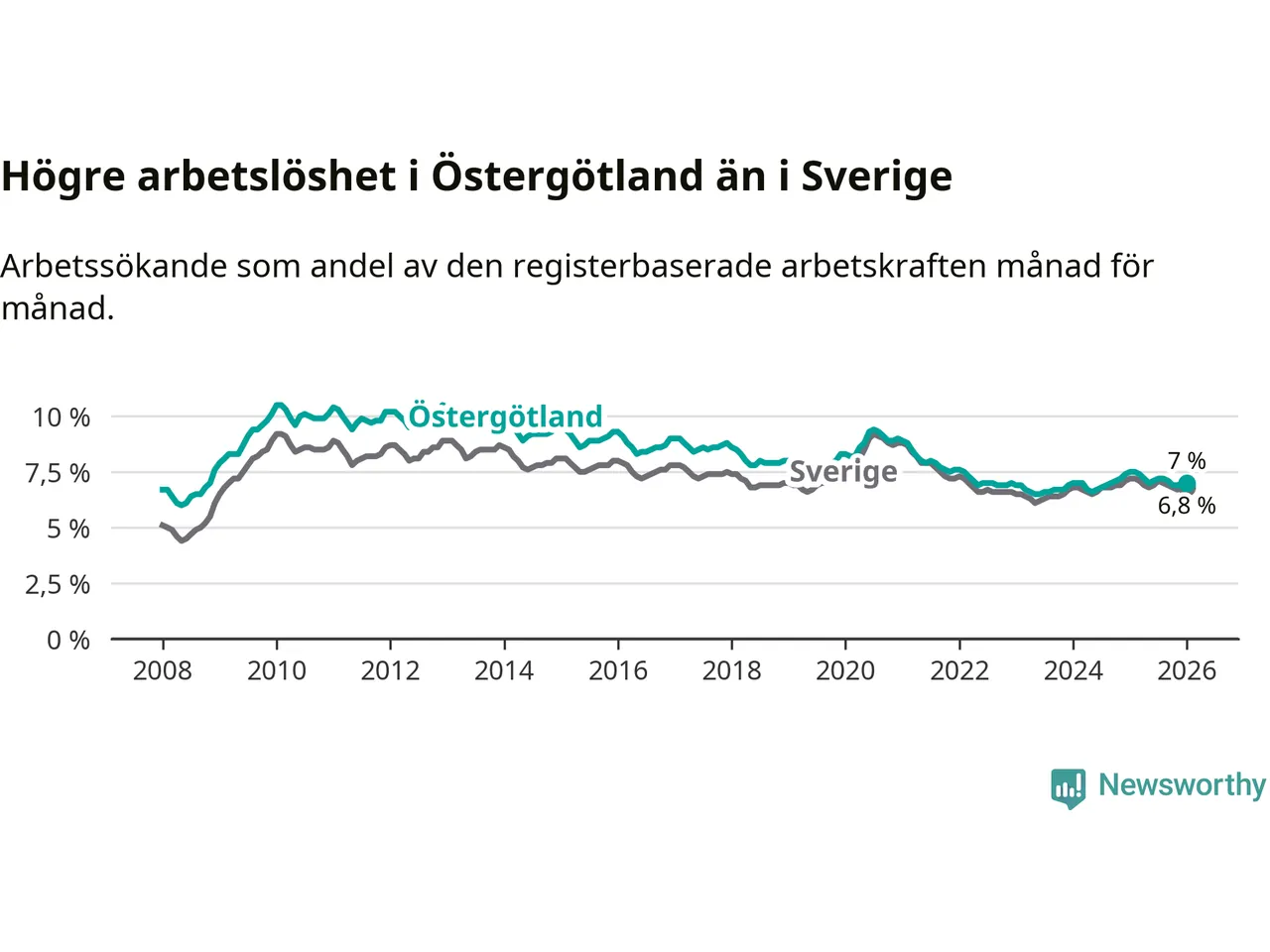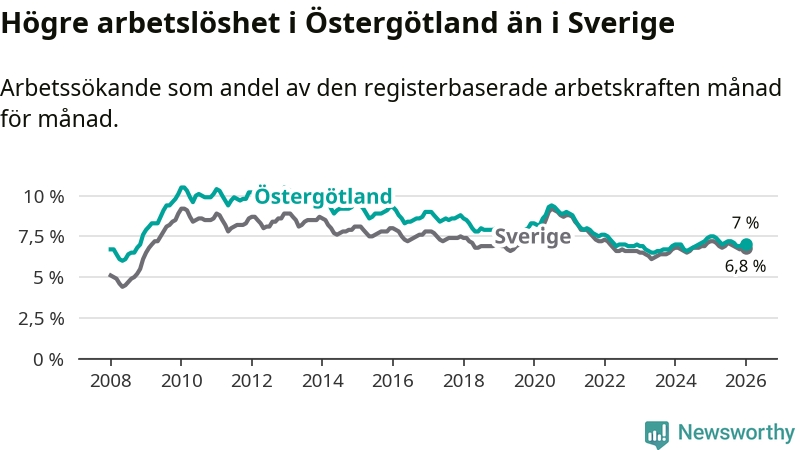 Även om arbetslösheten i Östergötland alltså minskar, så ligger den fortfarande över snittet i hela Sverige (7,0 procent i länet, jämfört med 6,8 procent i hela riket). Norrbotten har den lägsta arbetslösheten i riket (3,9 procent), medan Skåne har den högsta (8,9 procent). För att Östergötland skulle komma ner i samma arbetslöshetsnivå som Norrbotten skulle 7 296 personer behöva sysselsättas.