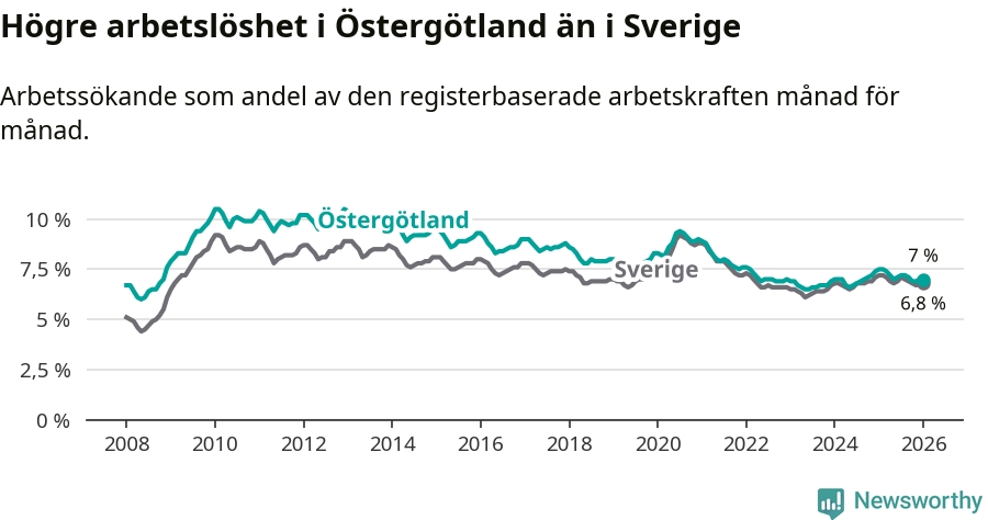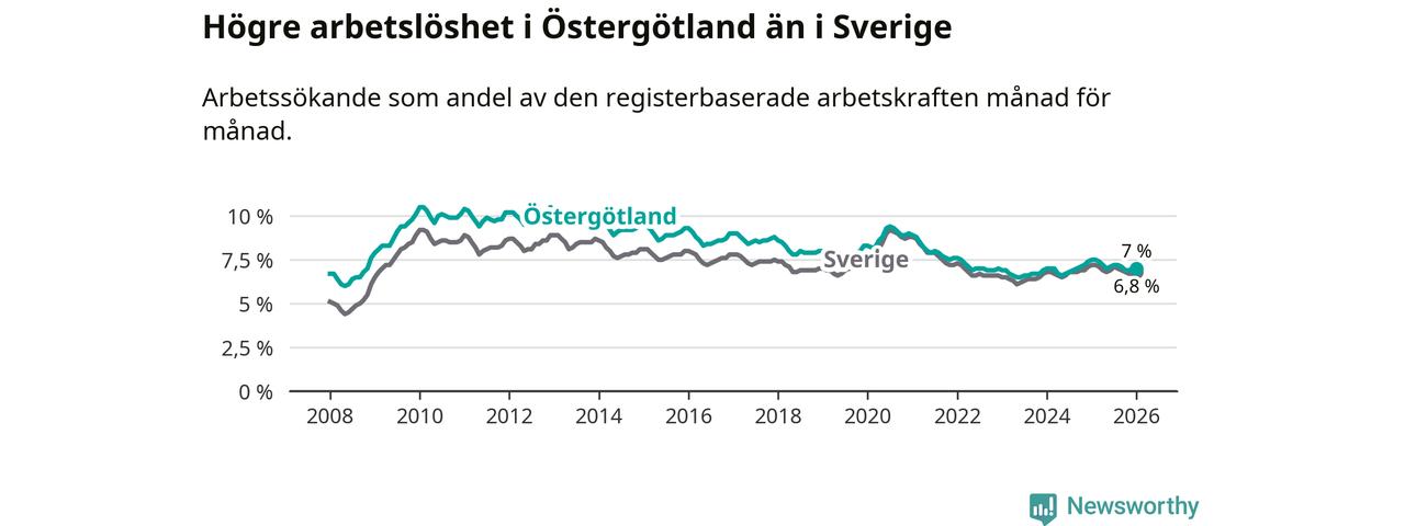 Under januari månad rapporterade Östergötlands län en total arbetslöshet på 7,0 procent. Det är en minskning jämfört med samma tidpunkt i fjol (−0,5 procentenheter). Även i Sverige sjunker arbetslösheten .