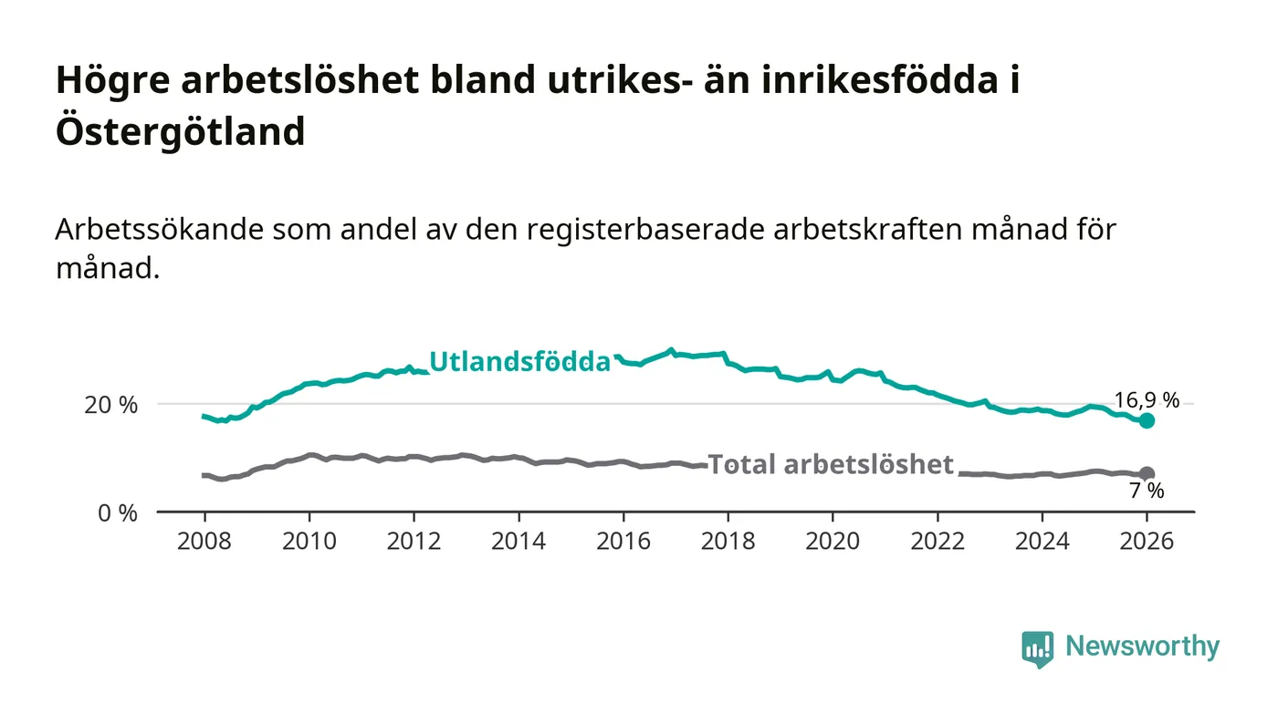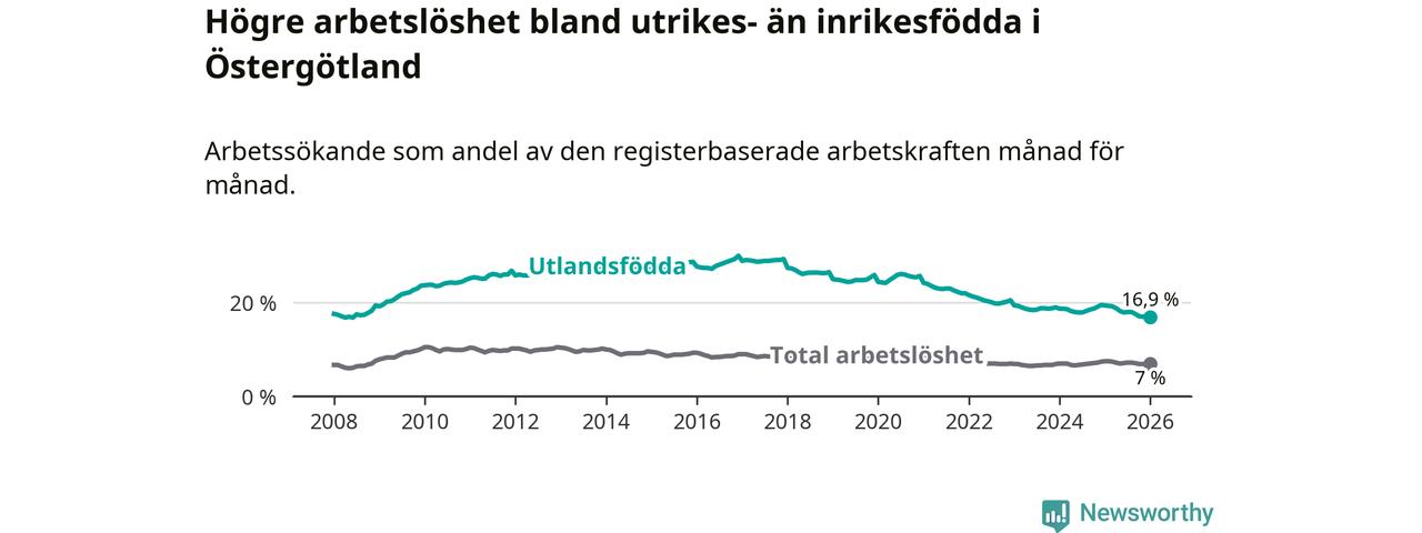 Arbetslösheten bland utlandsfödda var 16,9 procent i Östergötland under januari månad, motsvarande 8 403 av 49 722 personer. Det är 2,5 procentenheter färre än vid samma tidpunkt i fjol (−1 110 om man räknar personer). Därmed är de utlandsföddas arbetslöshet lägre än vid samma tidpunkt i fjol för sjätte månaden i följd. Sedan juli 2025 har arbetslösheten bland utlandsfödda minskat från 18,0 till 16,9 procent. Den nuvarande arbetslöshetsnivån är den lägsta sedan juni 2008.