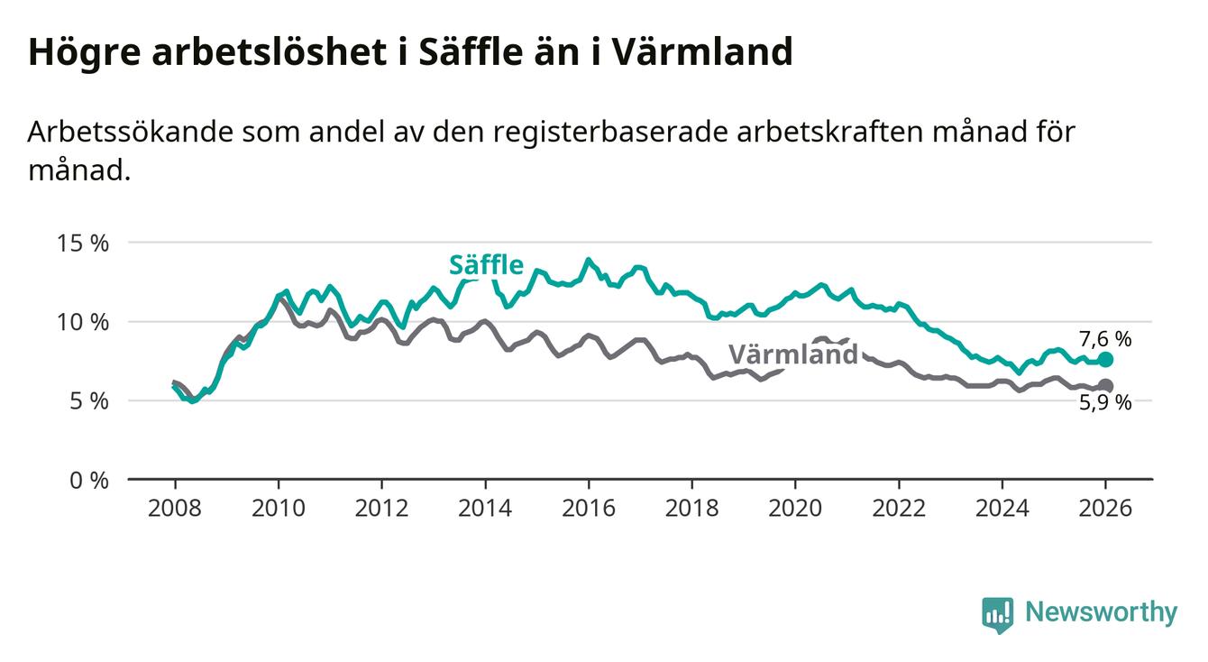 Under januari månad rapporterade Säffle kommun en total arbetslöshet på 7,6 procent. Det är en minskning jämfört med samma tidpunkt i fjol (−0,5 procentenheter). Även i Värmlands län sjunker arbetslösheten .