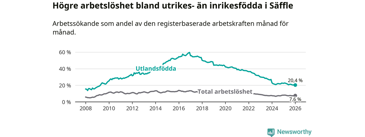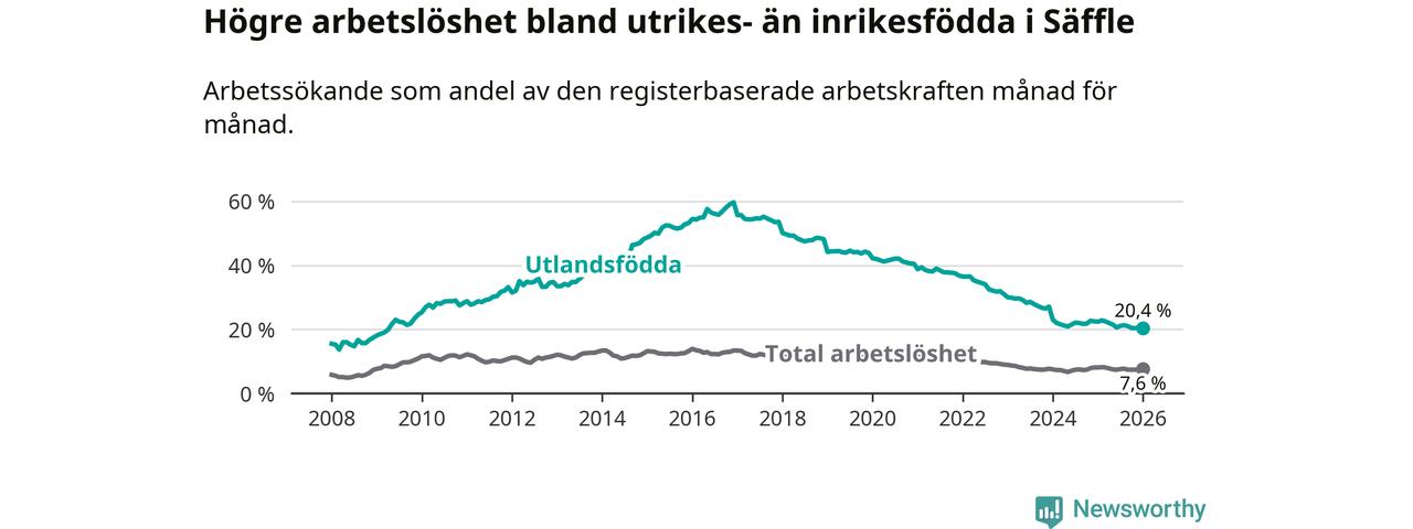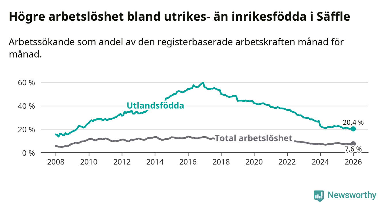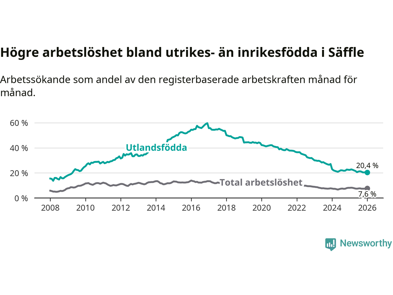 Arbetslösheten bland utlandsfödda var 20,4 procent i Säffle under januari månad, motsvarande 208 av 1 020 personer. Det är 2,0 procentenheter färre än vid samma tidpunkt i fjol (−24 om man räknar personer). Därmed är de utlandsföddas arbetslöshet lägre än vid samma tidpunkt i fjol för åttonde månaden i följd. Sedan maj 2025 har arbetslösheten bland utlandsfödda minskat från 21,5 till 20,4 procent.
