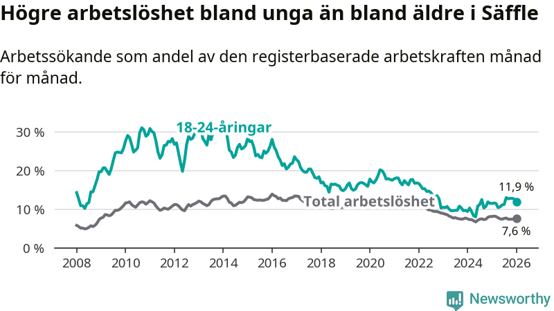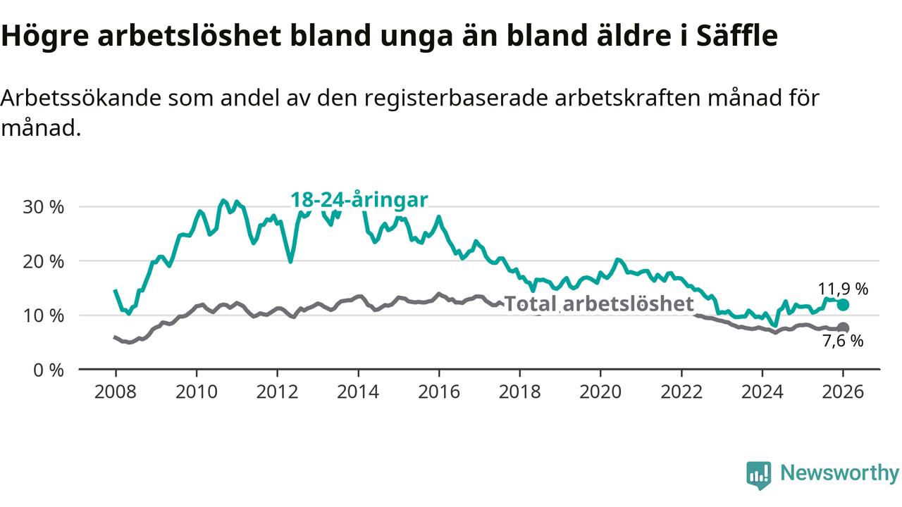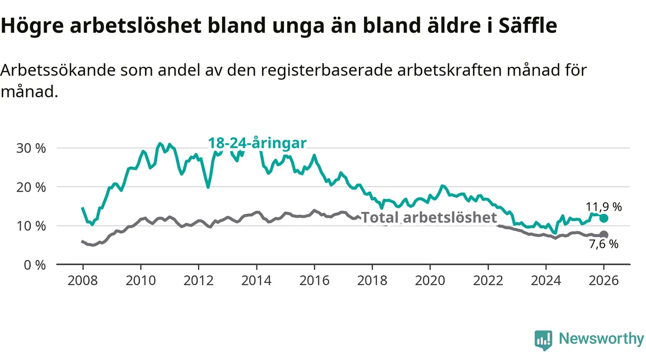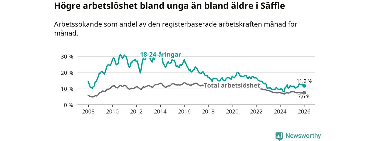 Till skillnad från den totala arbetslösheten stiger arbetslösheten bland unga (+0,4 procentenheter). I januari var 11,9 procent av 18–24-åringarna inskrivna som arbetssökande (motsvarande 75 personer). Mäter vi antalet inskrivna ser vi en ökning med två personer på ett års sikt.