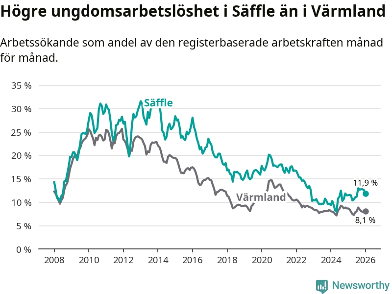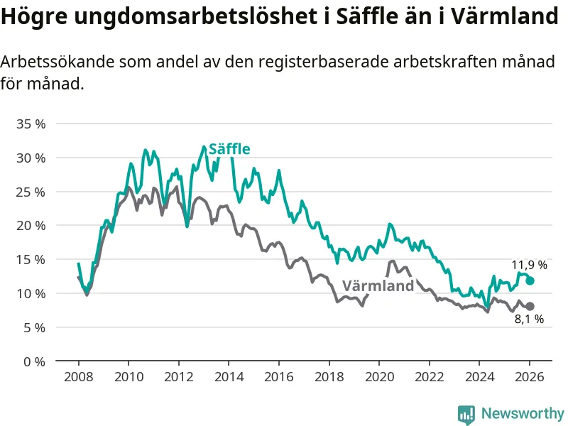 Graf: Arbetslöshet bland unga i Säffle kommun och Värmlands län