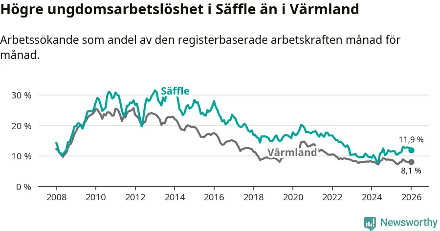 Precis som den totala arbetslösheten ligger ungdomsarbetslösheten i Säffle högre än i Värmland som helhet. Skillnaden mellan kommunen och länet är 3,8 procentenheter.