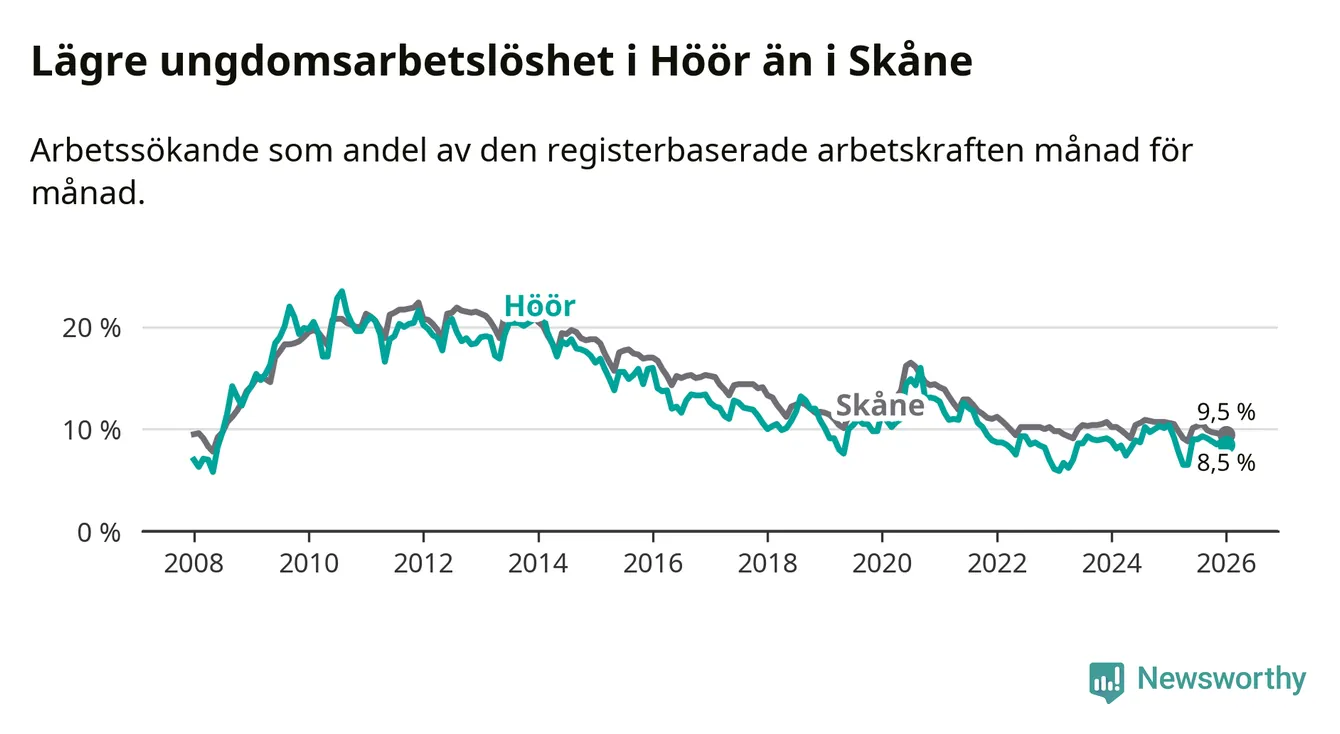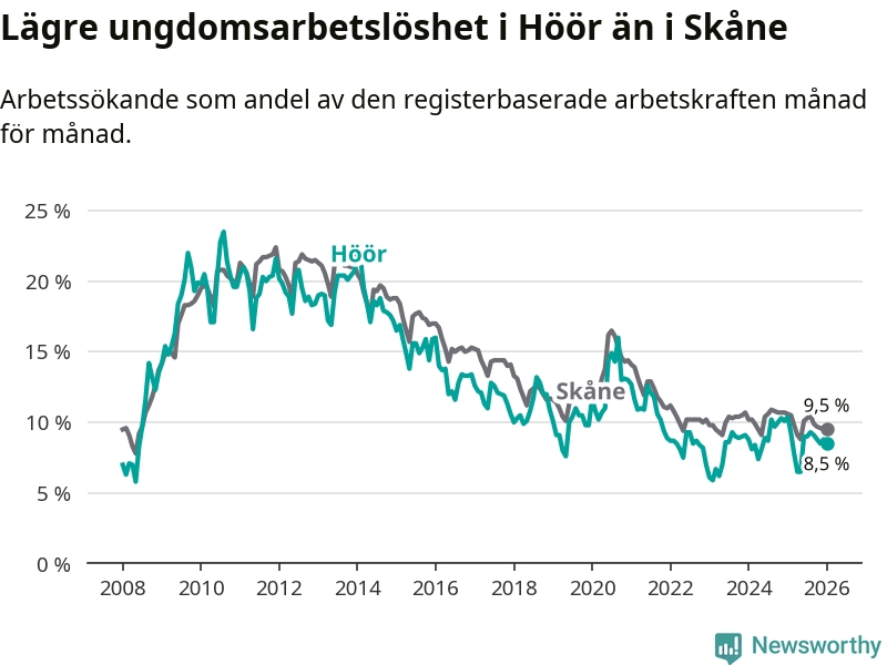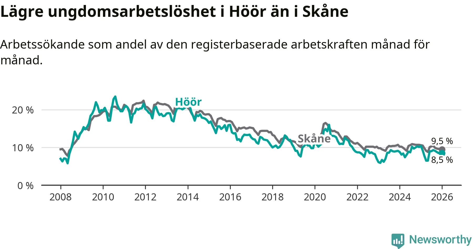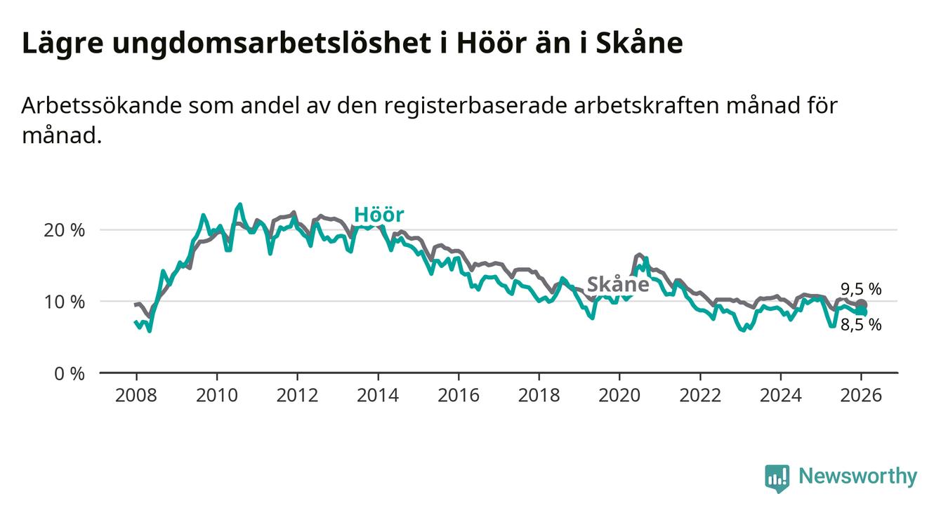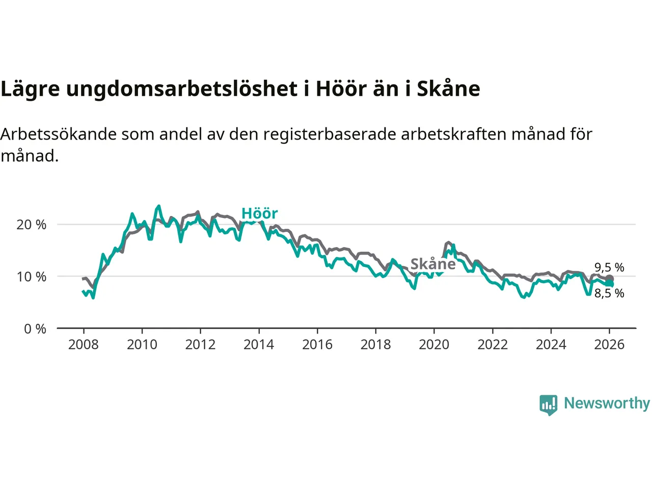 Precis som den totala arbetslösheten ligger ungdomsarbetslösheten i Höör lägre än i Skåne som helhet. Skillnaden mellan kommunen och länet är 1,0 procentenheter.