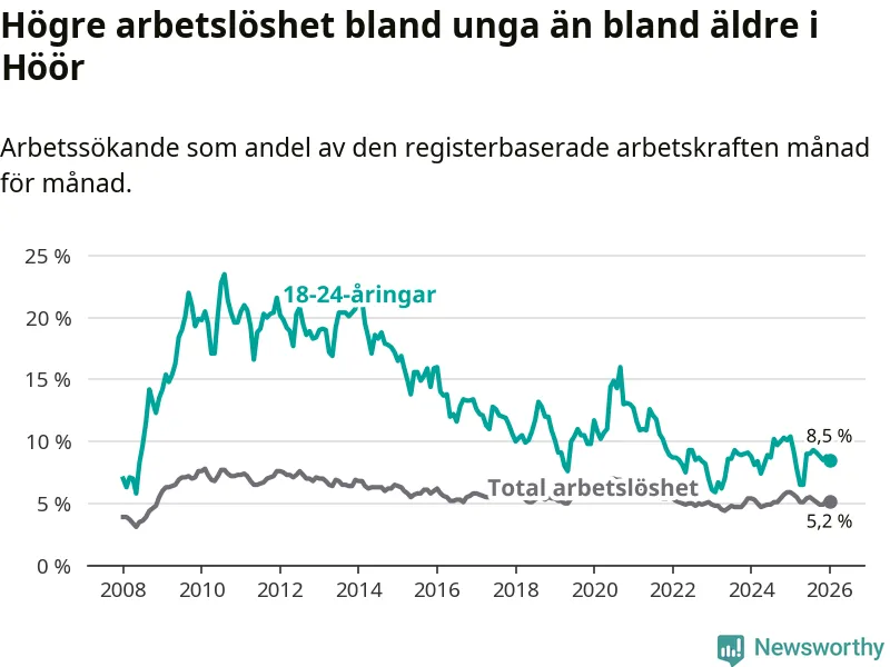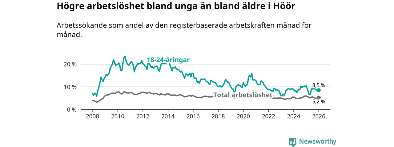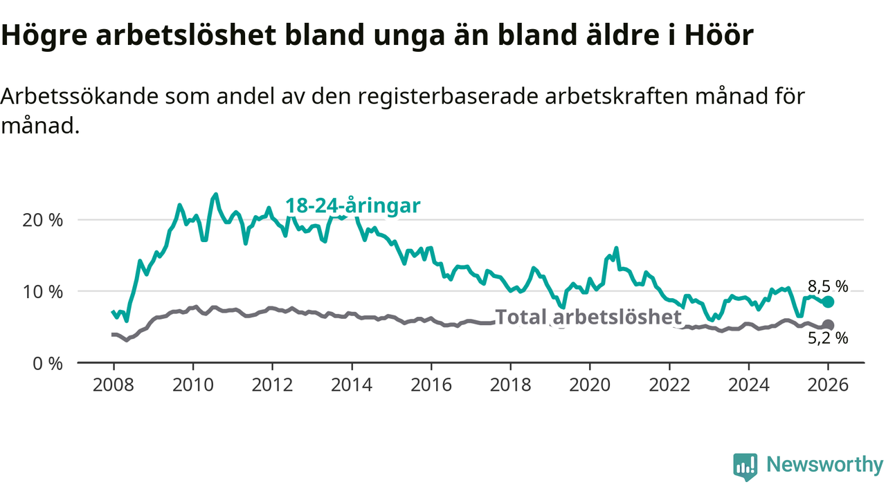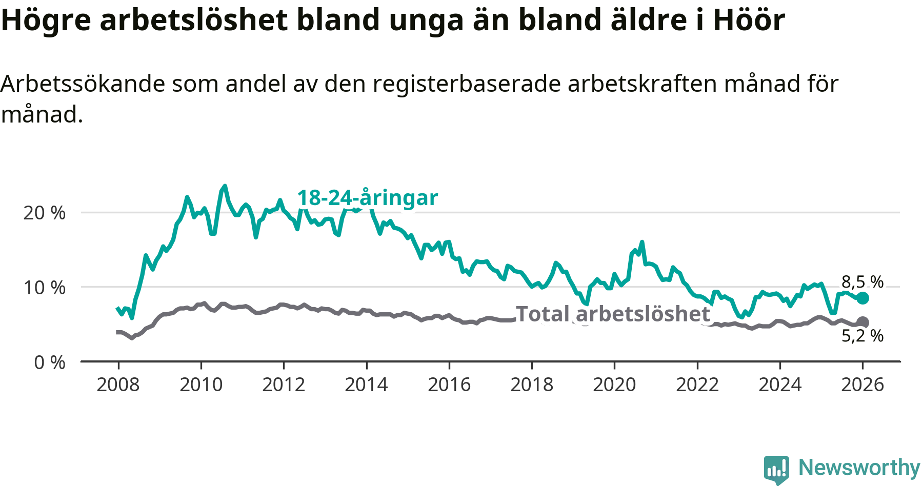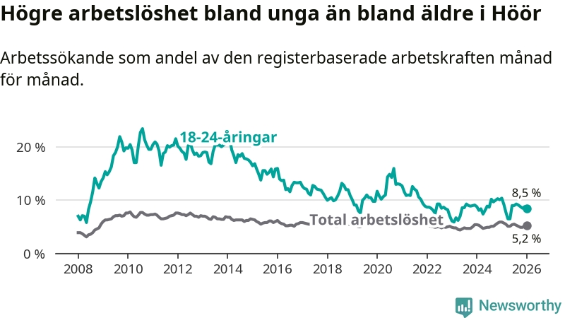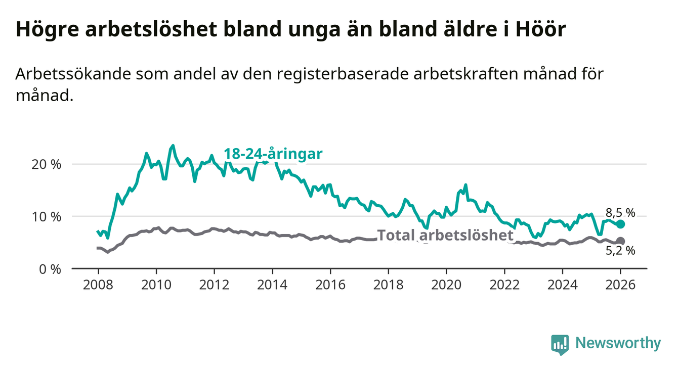 Precis som den totala arbetslösheten ligger ungdomsarbetslösheten i Höör lägre än i Skåne som helhet. Skillnaden mellan kommunen och länet är 1,0 procentenheter.