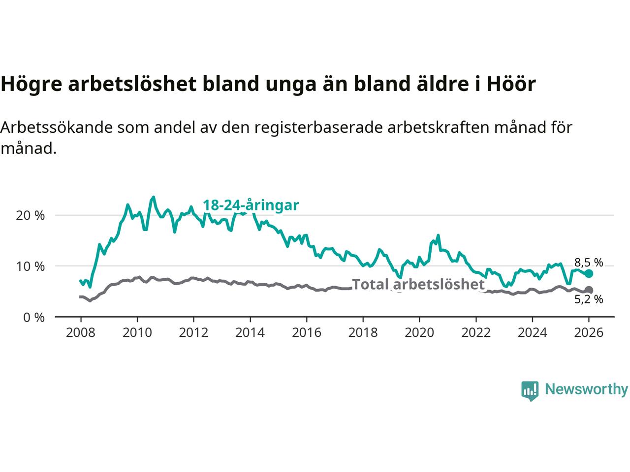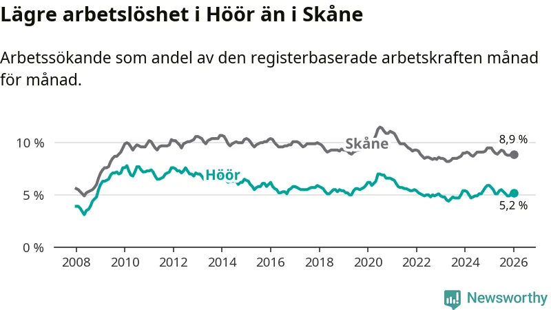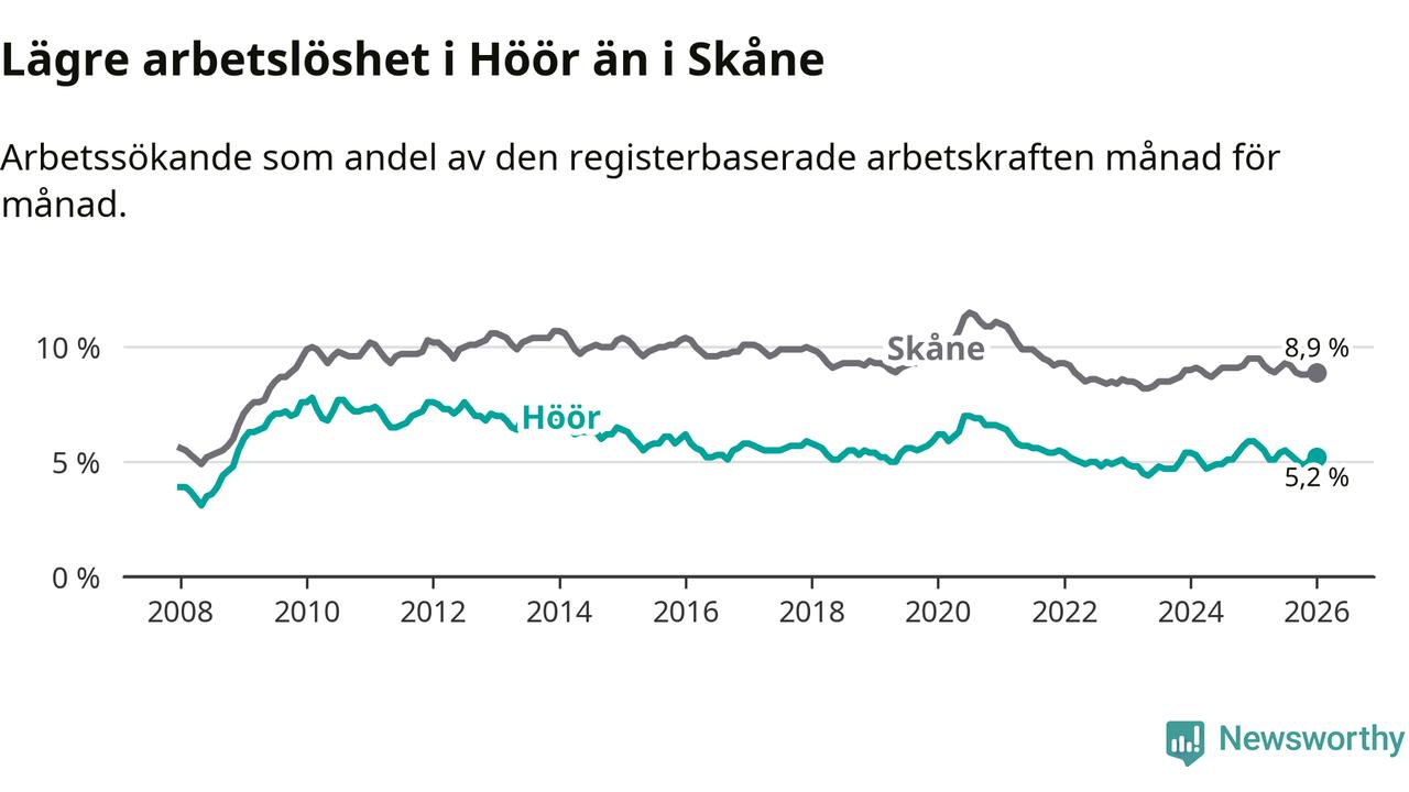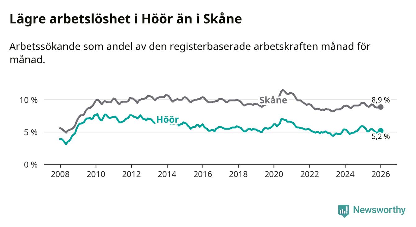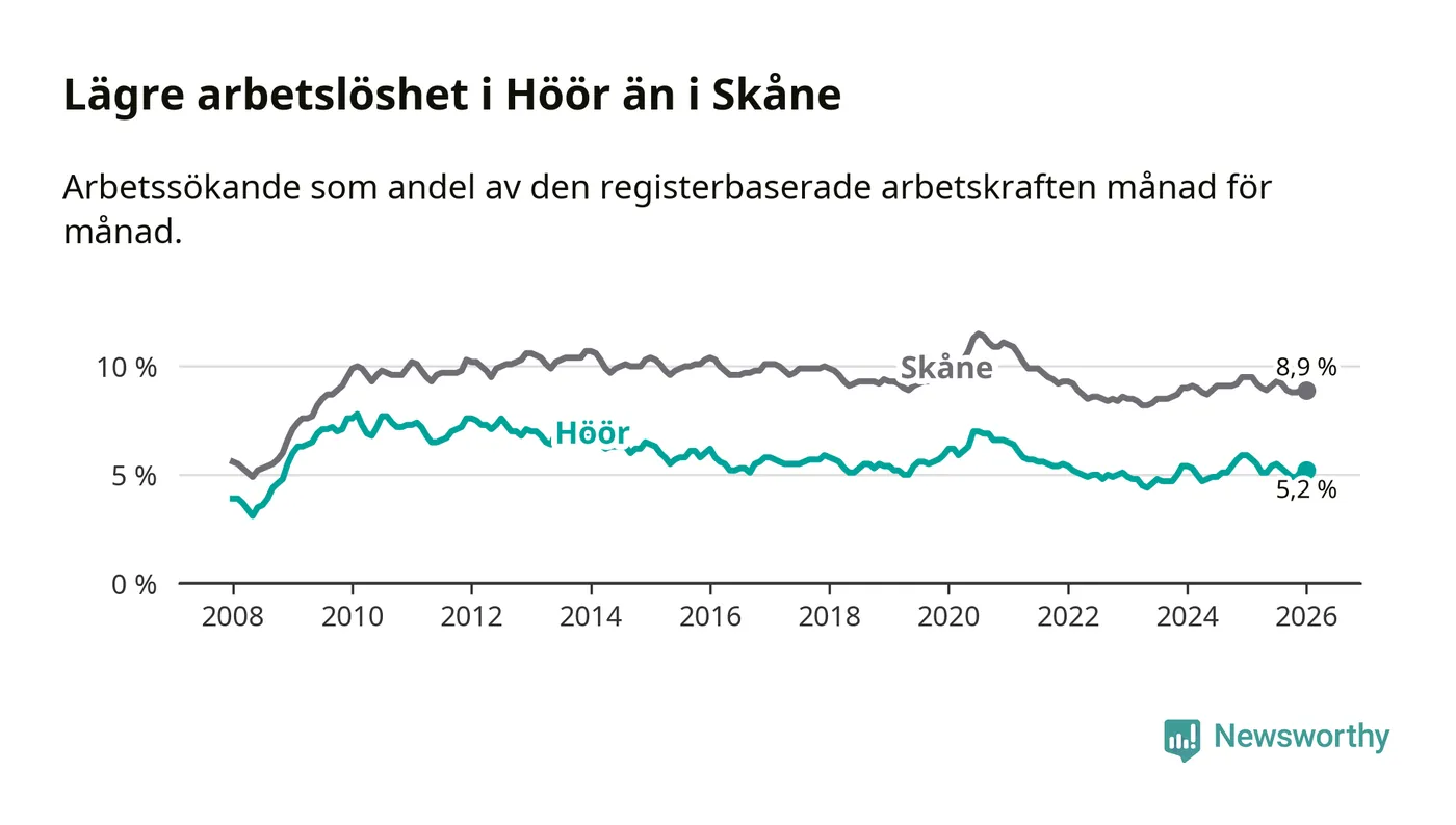 Höör hade redan tidigare lägre arbetslöshet än snittet i hela Skåne län och nu växer klyftan (5,2 procent i kommunen, jämfört med 8,9 procent i hela länet). Lomma har den lägsta arbetslösheten i länet (3,9 procent), medan Perstorp har den högsta (13,4 procent). För att Höör skulle komma ner i samma arbetslöshetsnivå som Lomma skulle 111 personer behöva sysselsättas.