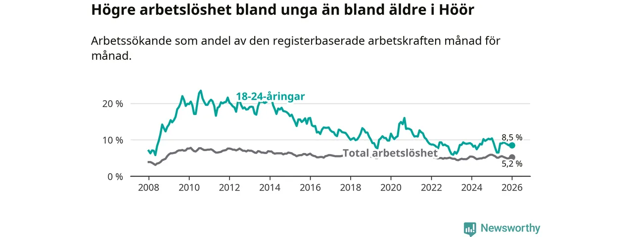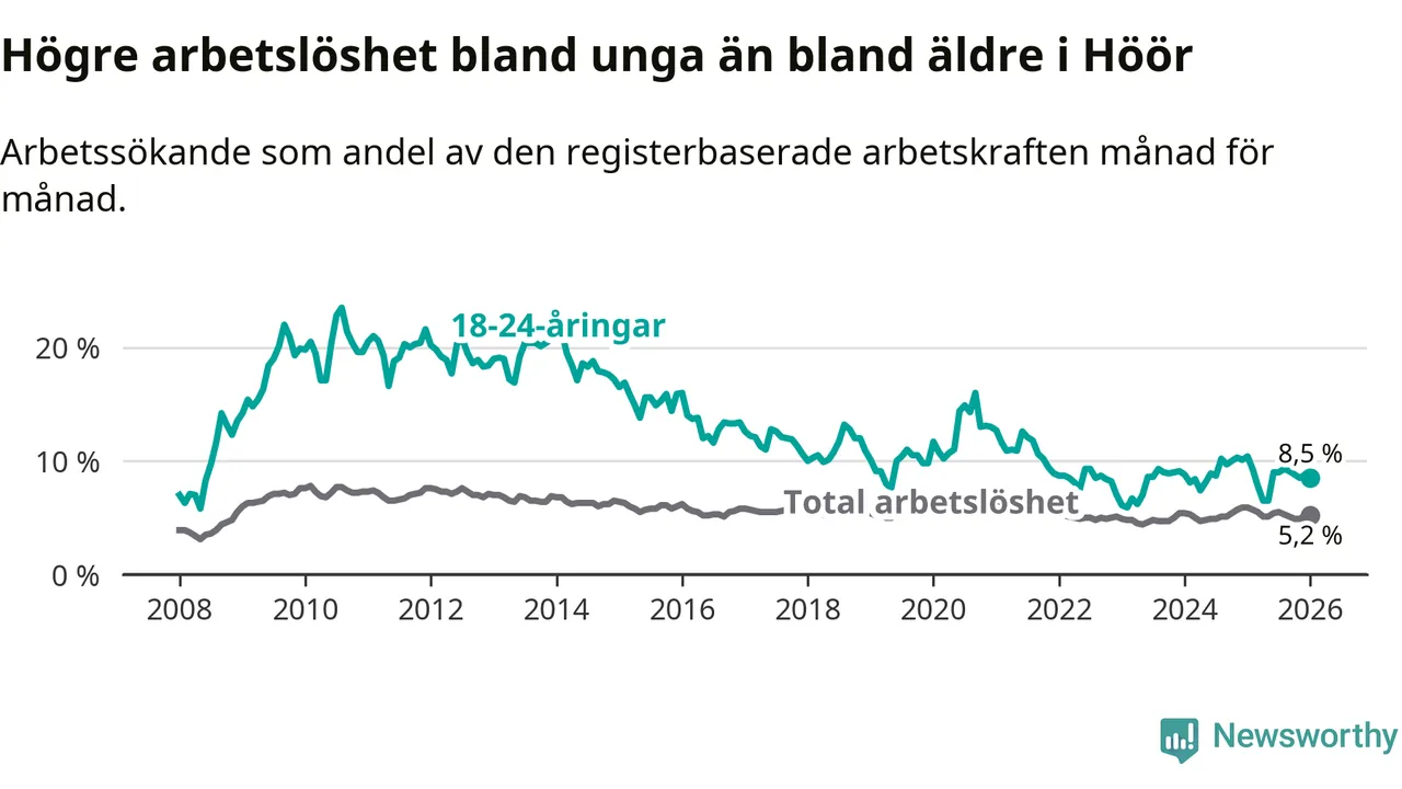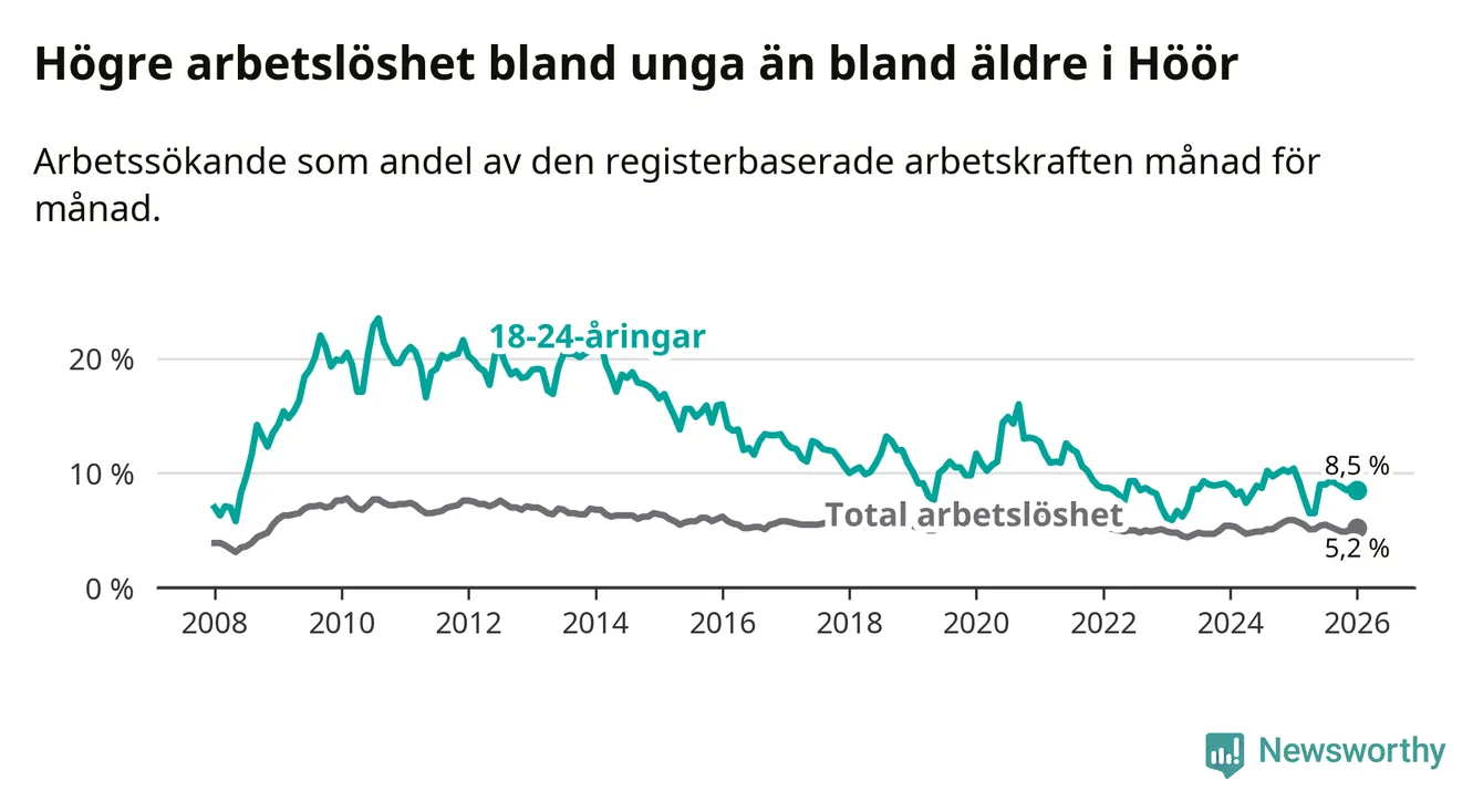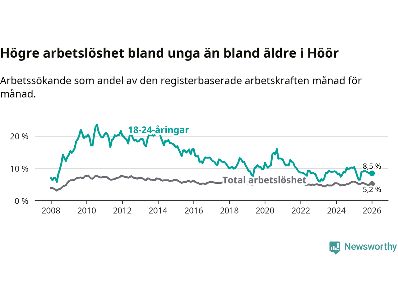 Höör hade redan tidigare lägre arbetslöshet än snittet i hela Skåne län och nu växer klyftan (5,2 procent i kommunen, jämfört med 8,9 procent i hela länet). Lomma har den lägsta arbetslösheten i länet (3,9 procent), medan Perstorp har den högsta (13,4 procent). För att Höör skulle komma ner i samma arbetslöshetsnivå som Lomma skulle 111 personer behöva sysselsättas.