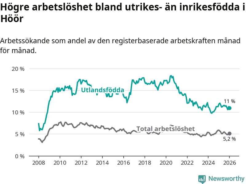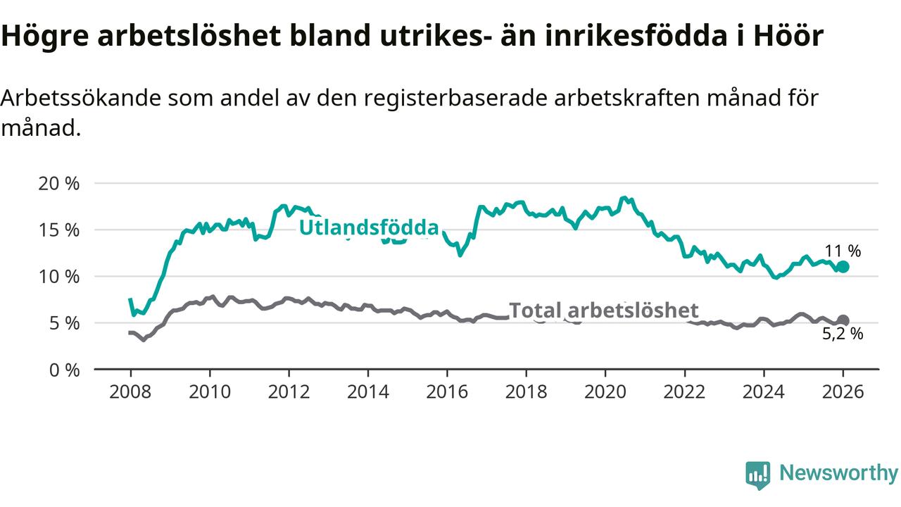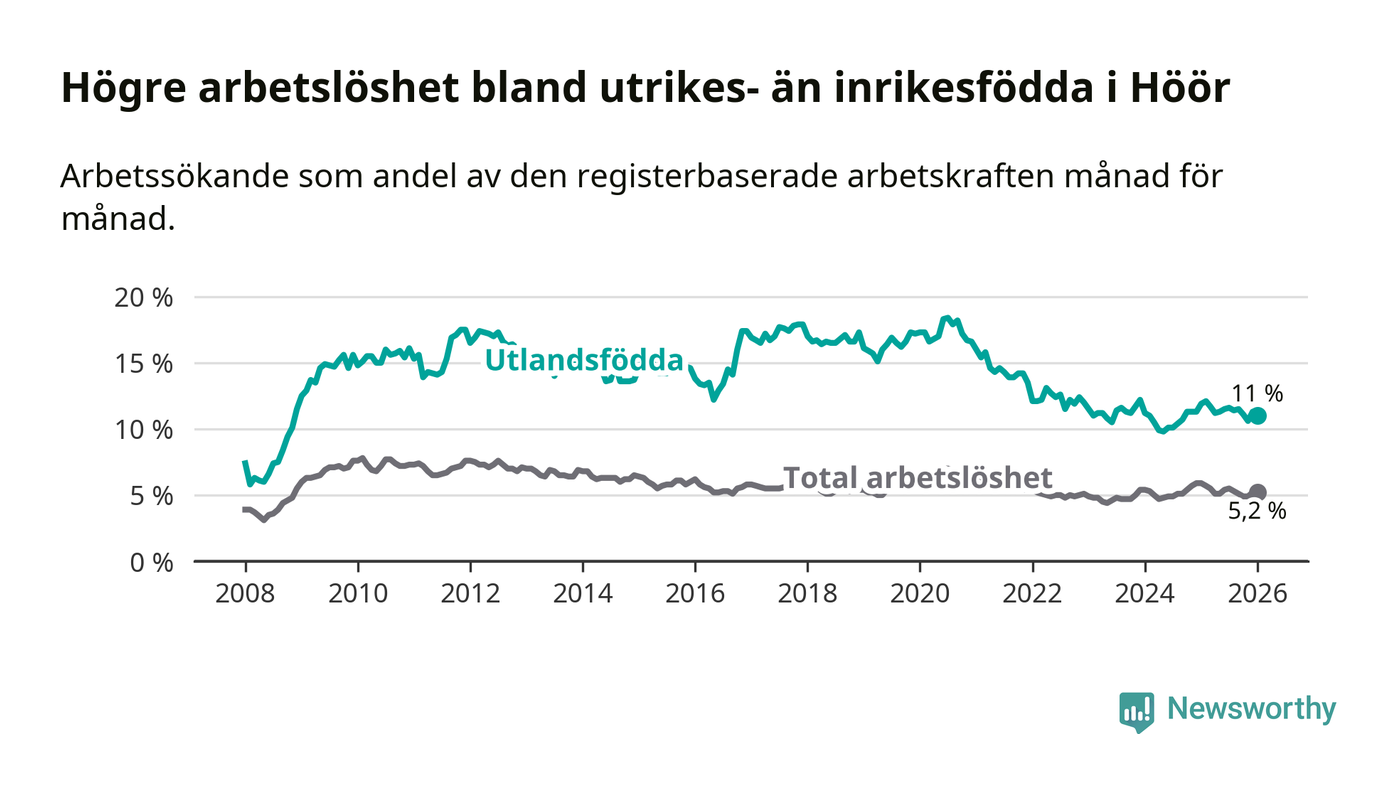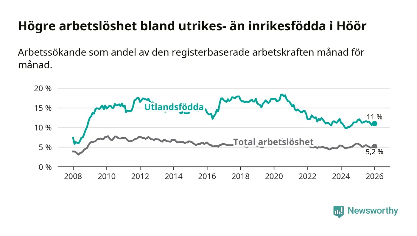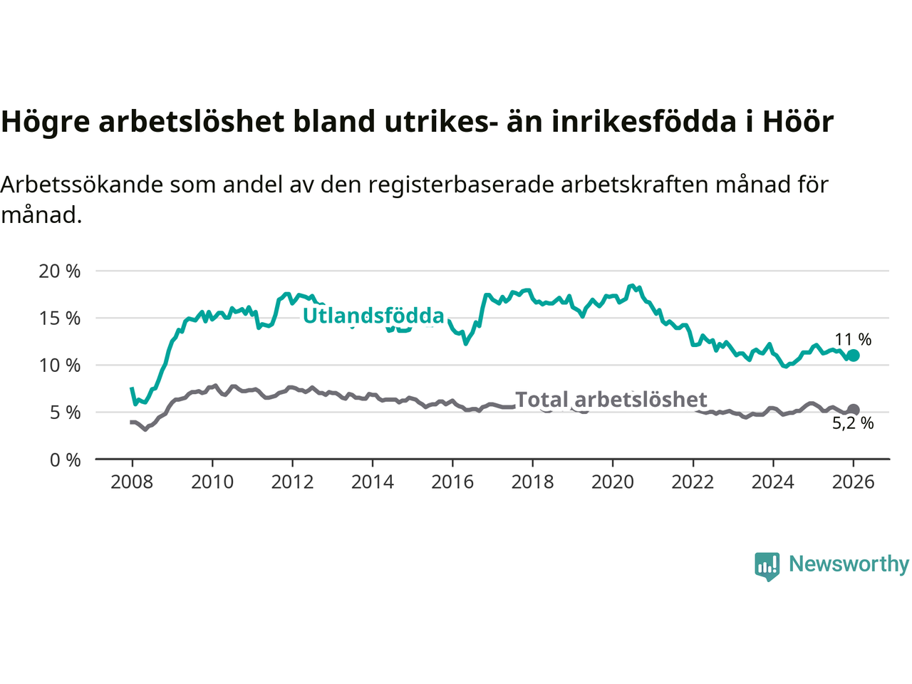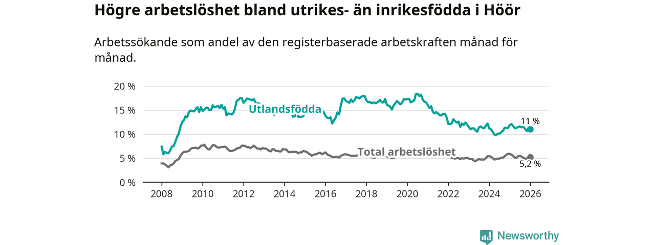 Arbetslösheten bland utlandsfödda var 11,0 procent i Höör under januari månad, motsvarande 127 av 1 155 personer. Det är 0,9 procentenheter färre än vid samma tidpunkt i fjol (−8 om man räknar personer). Den senaste månadens nedgång innebär ett trendbrott. Under de ett föregående månaderna hade arbetslösheten bland utlandsfödda varit högre än motsvarande tidpunkt året innan.