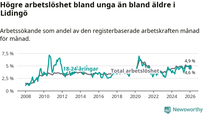Till skillnad från den totala arbetslösheten sjunker arbetslösheten bland unga (−0,1 procentenheter). I januari var 4,6 procent av 18–24-åringarna inskrivna som arbetssökande (motsvarande 93 personer). Mäter vi antalet inskrivna ser vi en minskning med tre personer på ett års sikt.
