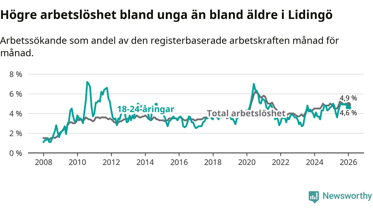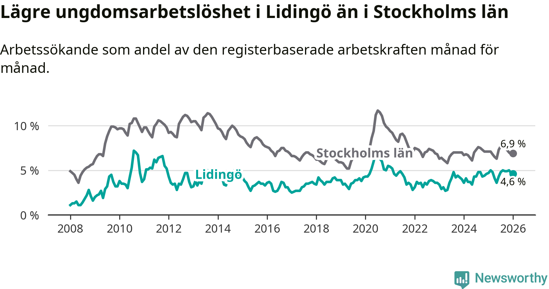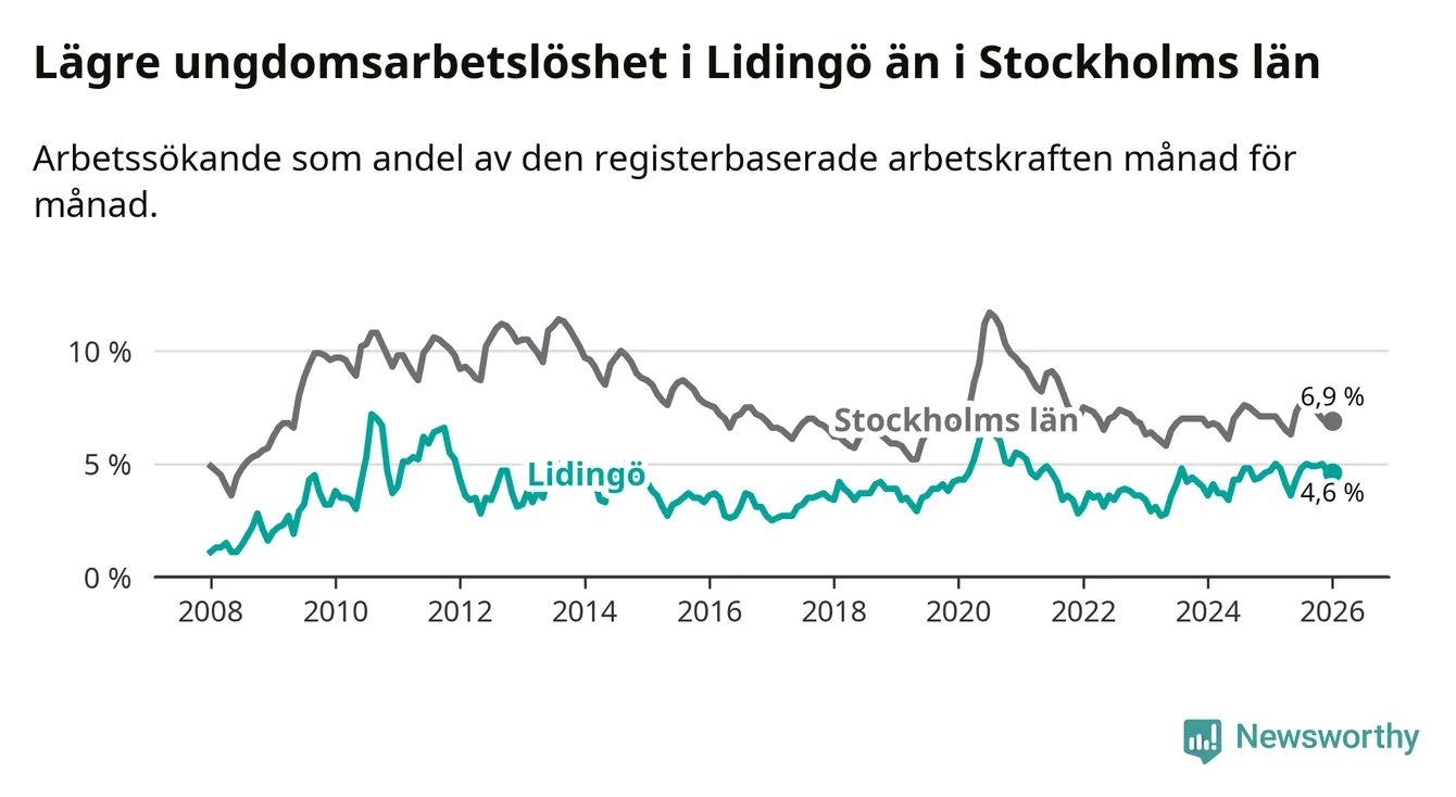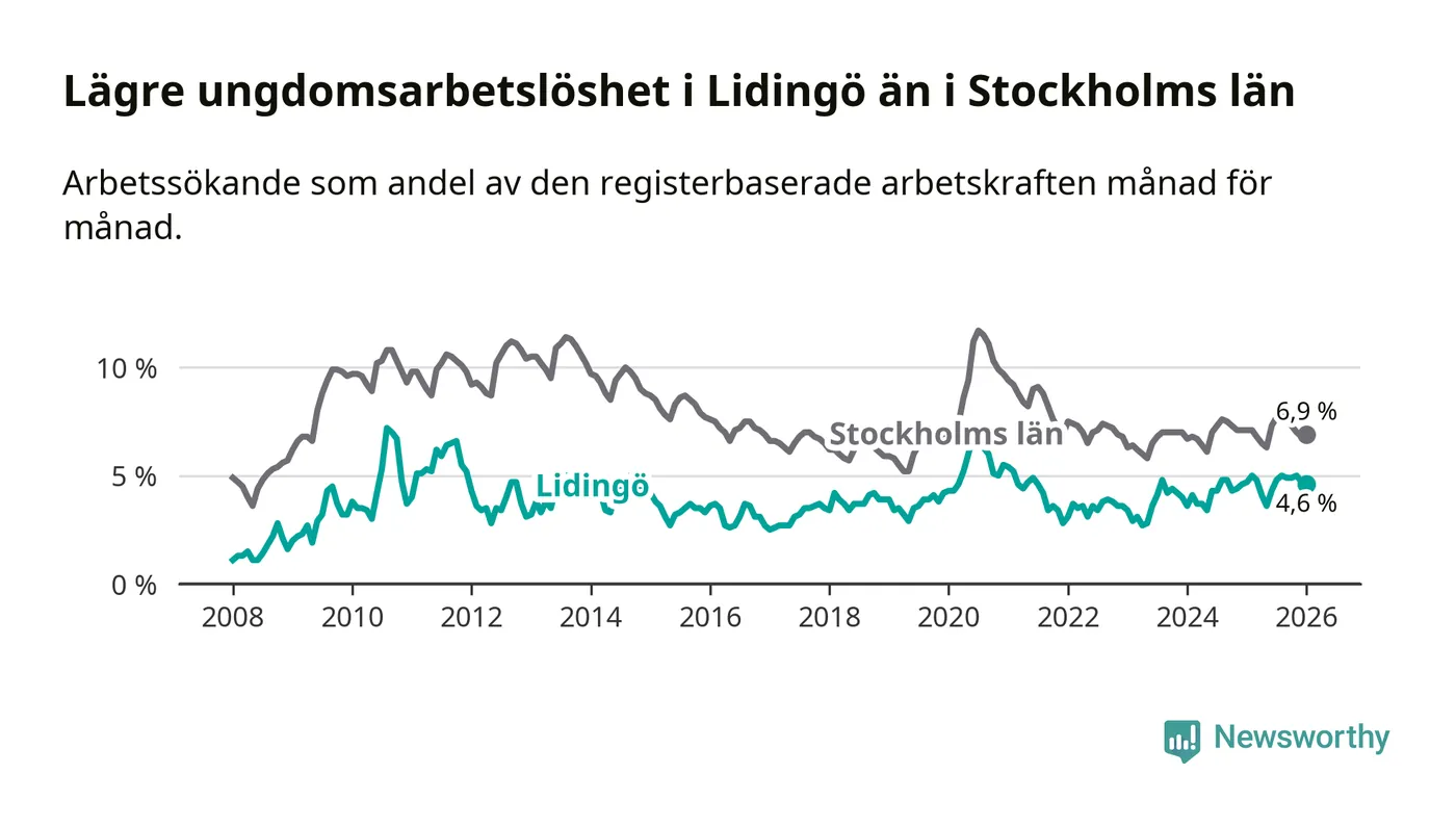 Graf: Arbetslöshet bland unga i Lidingö kommun och Stockholms län