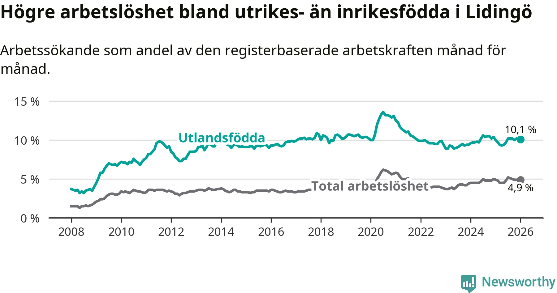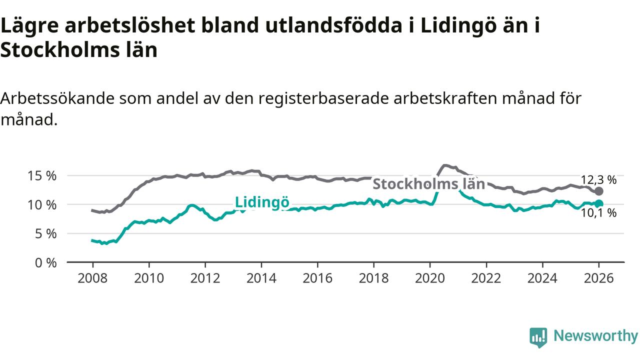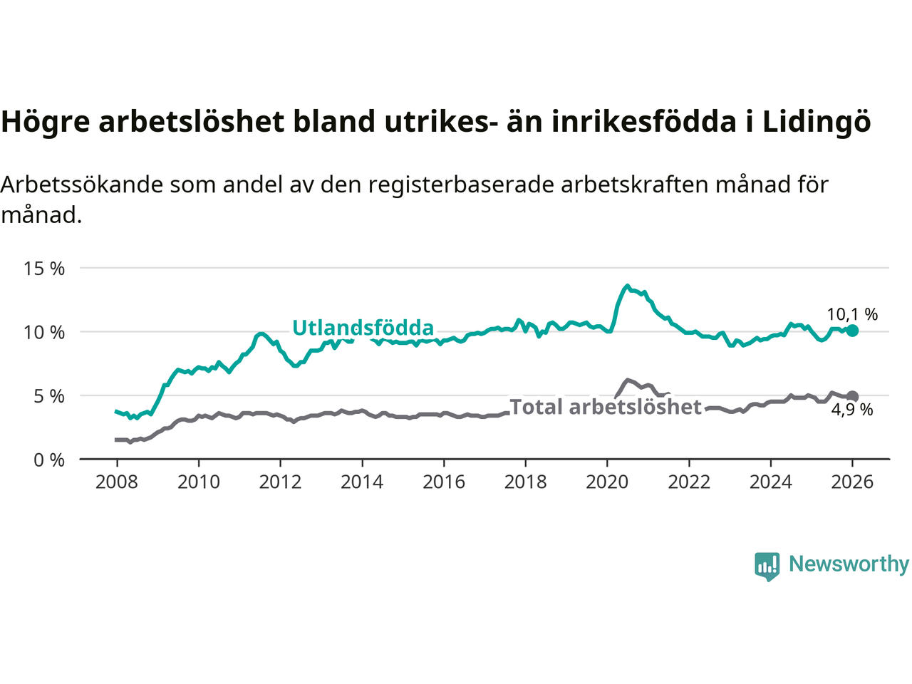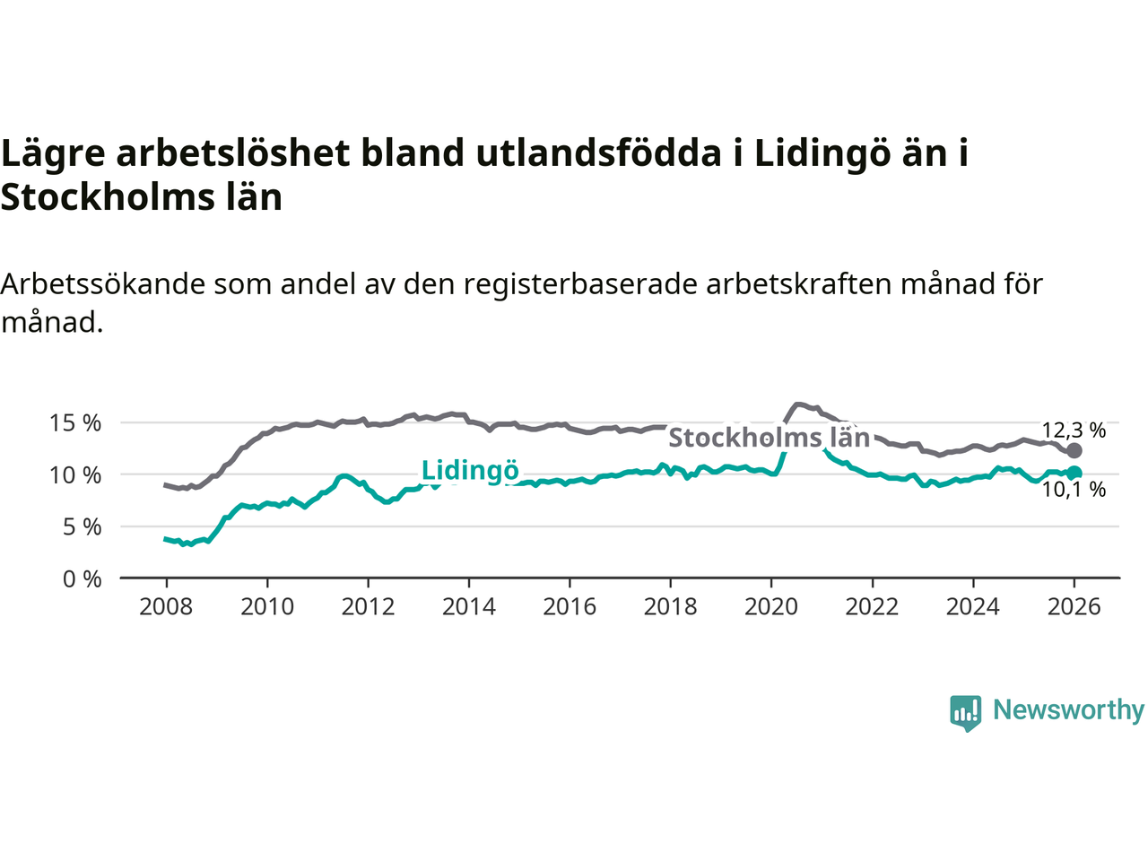 Arbetslösheten bland utlandsfödda var 10,1 procent på Lidingö under januari månad, motsvarande 507 av 5 020 personer. Det är 0,1 procentenheter fler än vid samma tidpunkt i fjol (+17 om man räknar personer). Den senaste månadens uppgång innebär ett trendbrott. Under de ett föregående månaderna hade arbetslösheten bland utlandsfödda varit lägre än motsvarande tidpunkt året innan.