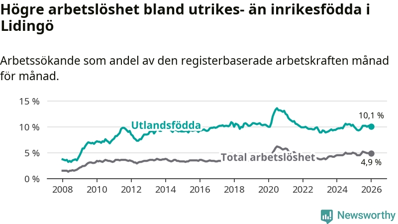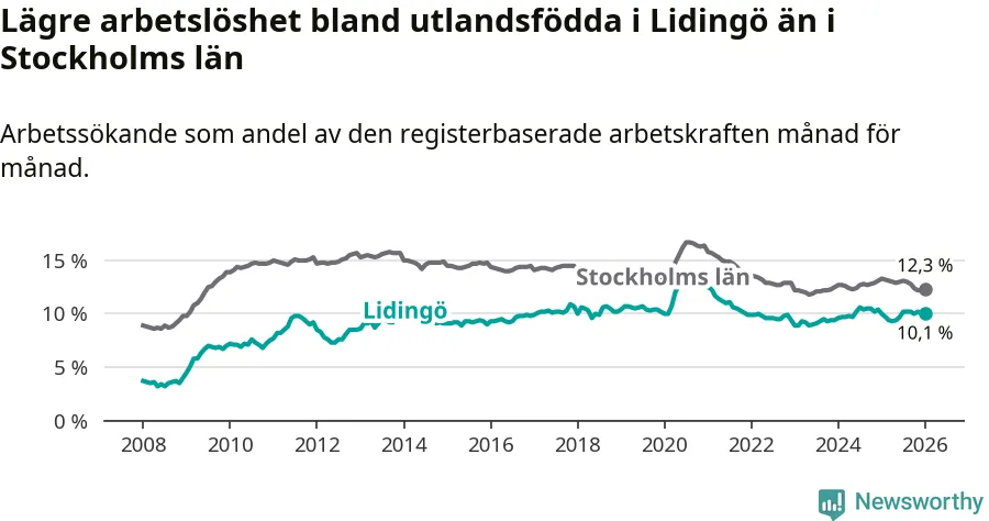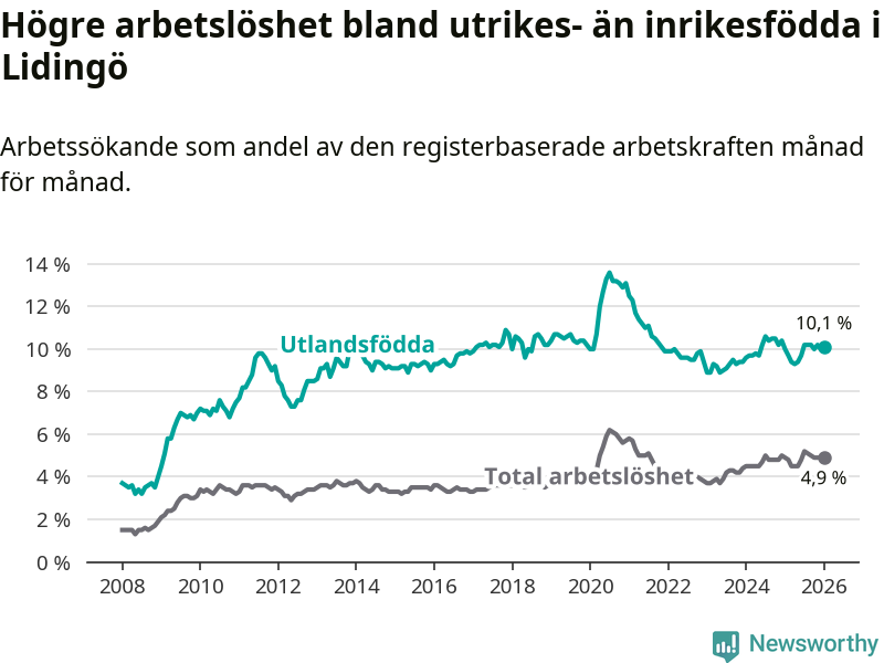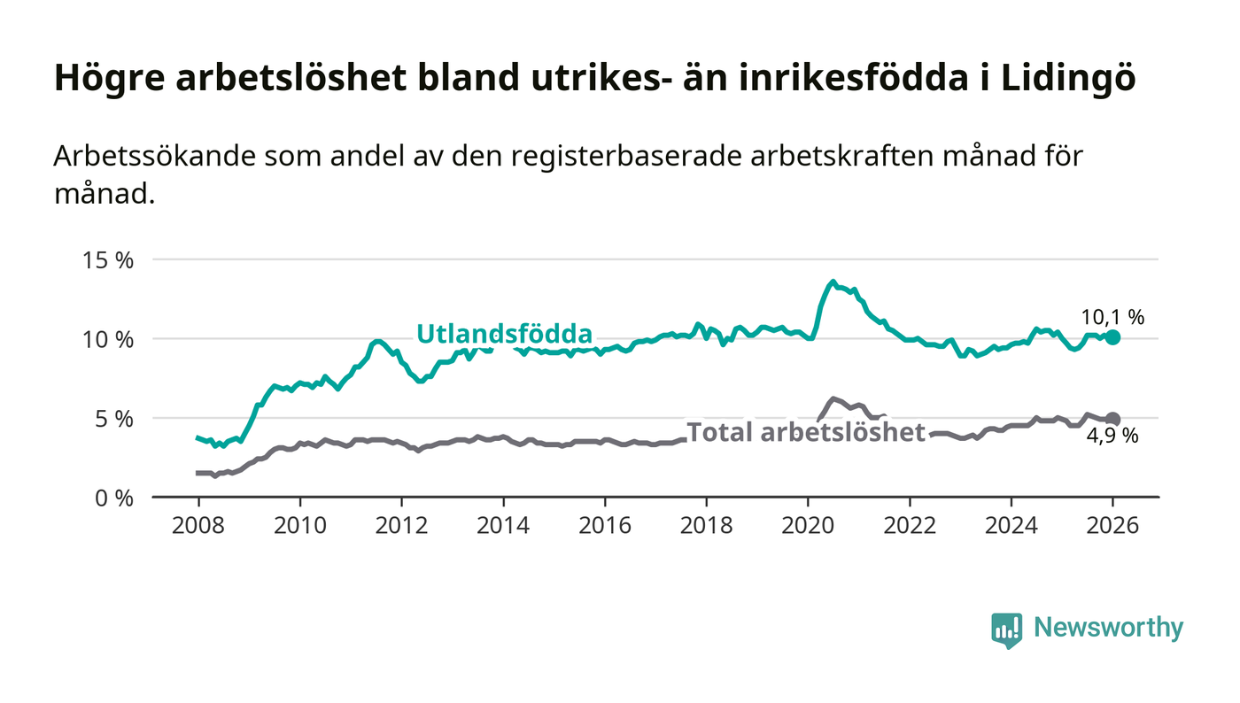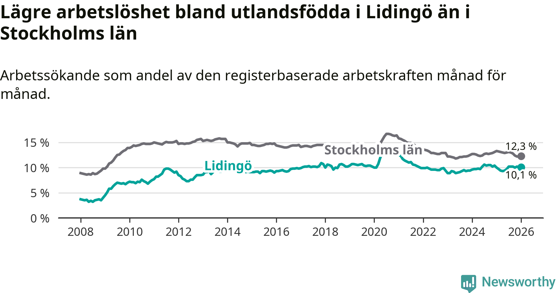 Arbetslösheten bland utlandsfödda var 10,1 procent på Lidingö under januari månad, motsvarande 507 av 5 020 personer. Det är 0,1 procentenheter fler än vid samma tidpunkt i fjol (+17 om man räknar personer). Den senaste månadens uppgång innebär ett trendbrott. Under de ett föregående månaderna hade arbetslösheten bland utlandsfödda varit lägre än motsvarande tidpunkt året innan.