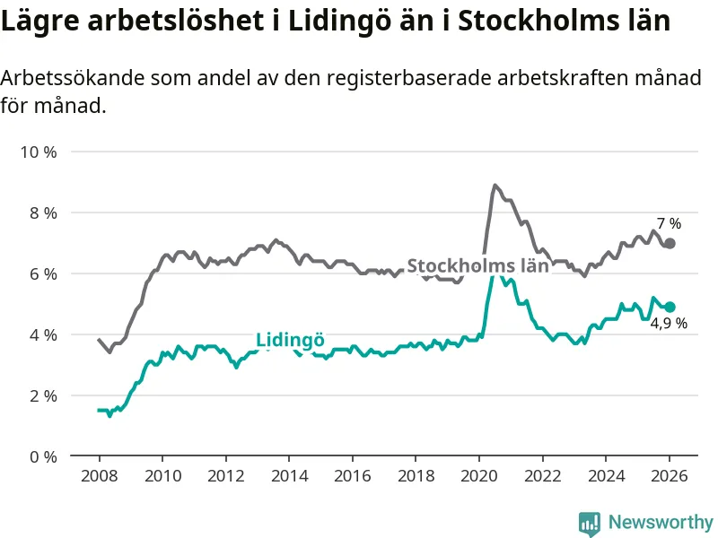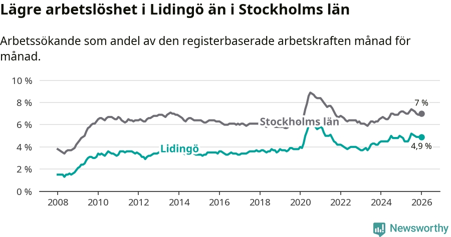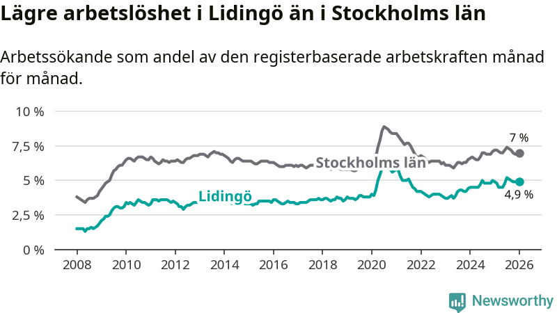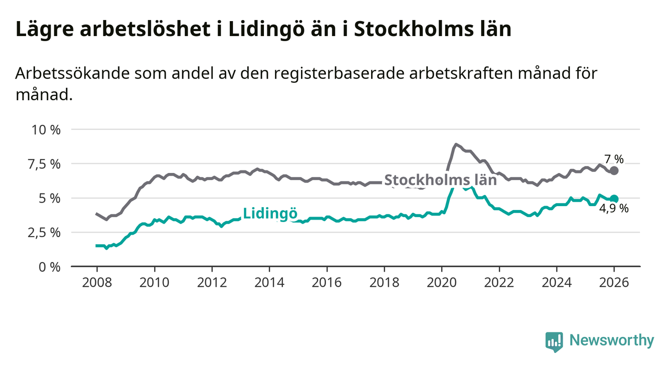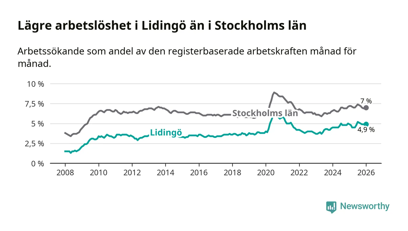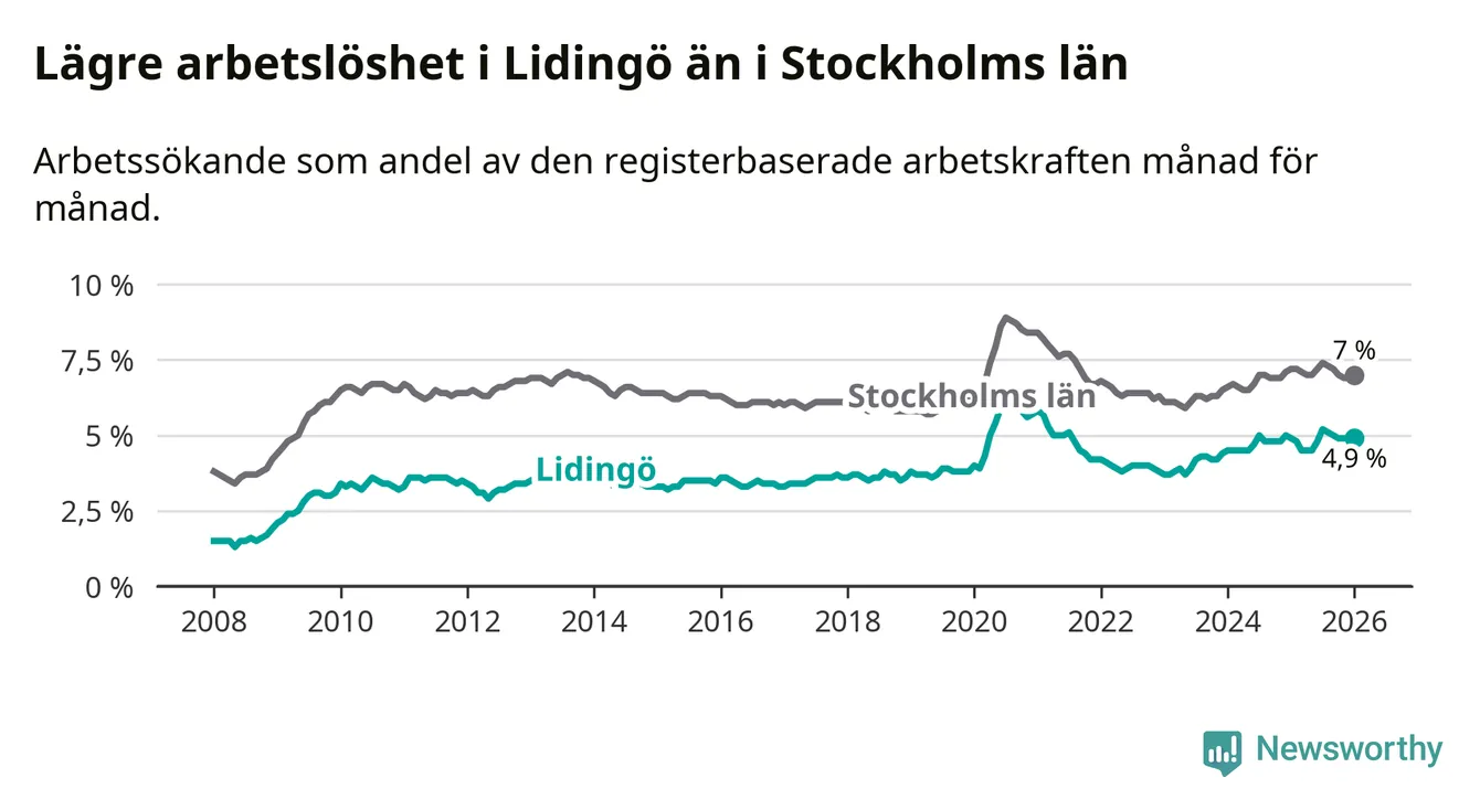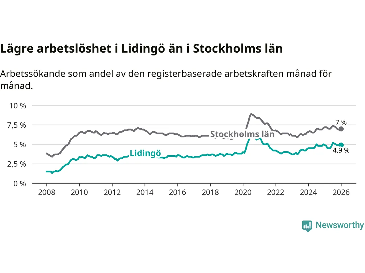 Lidingö går därmed mot strömmen i förhållande till andra kommuner i Stockholms län. I de flesta andra kommuner i länet går arbetslösheten nedåt. Störst är minskningen i Upplands-Bro, där arbetslösheten sjunker med 1,0 procentenheter. I tabellen längre ner ser du utvecklingen i samtliga kommuner i länet.