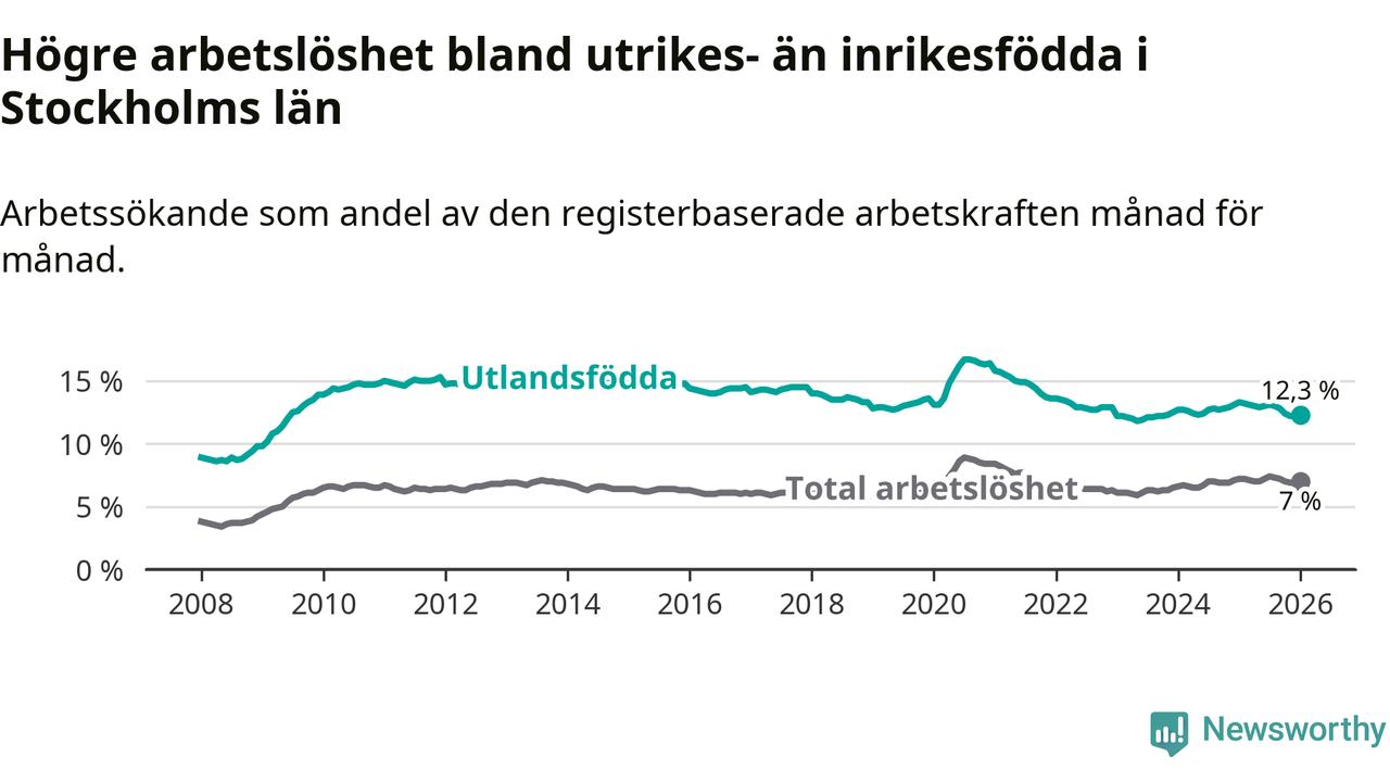 Arbetslösheten bland utlandsfödda var 12,3 procent i Stockholm under januari månad, motsvarande 51 640 av 419 837 personer. Det är 1,0 procentenheter färre än vid samma tidpunkt i fjol (−3 130 om man räknar personer).