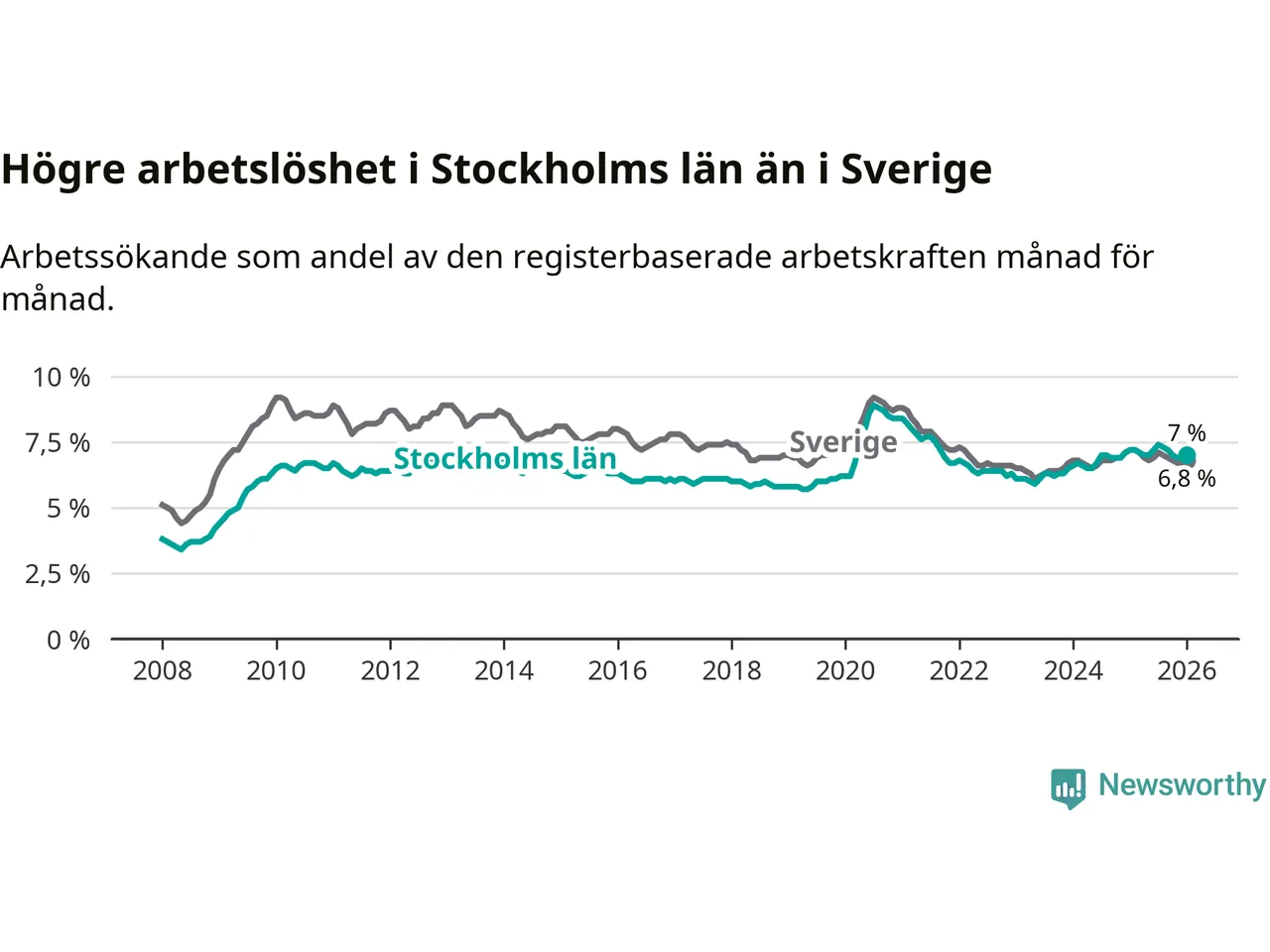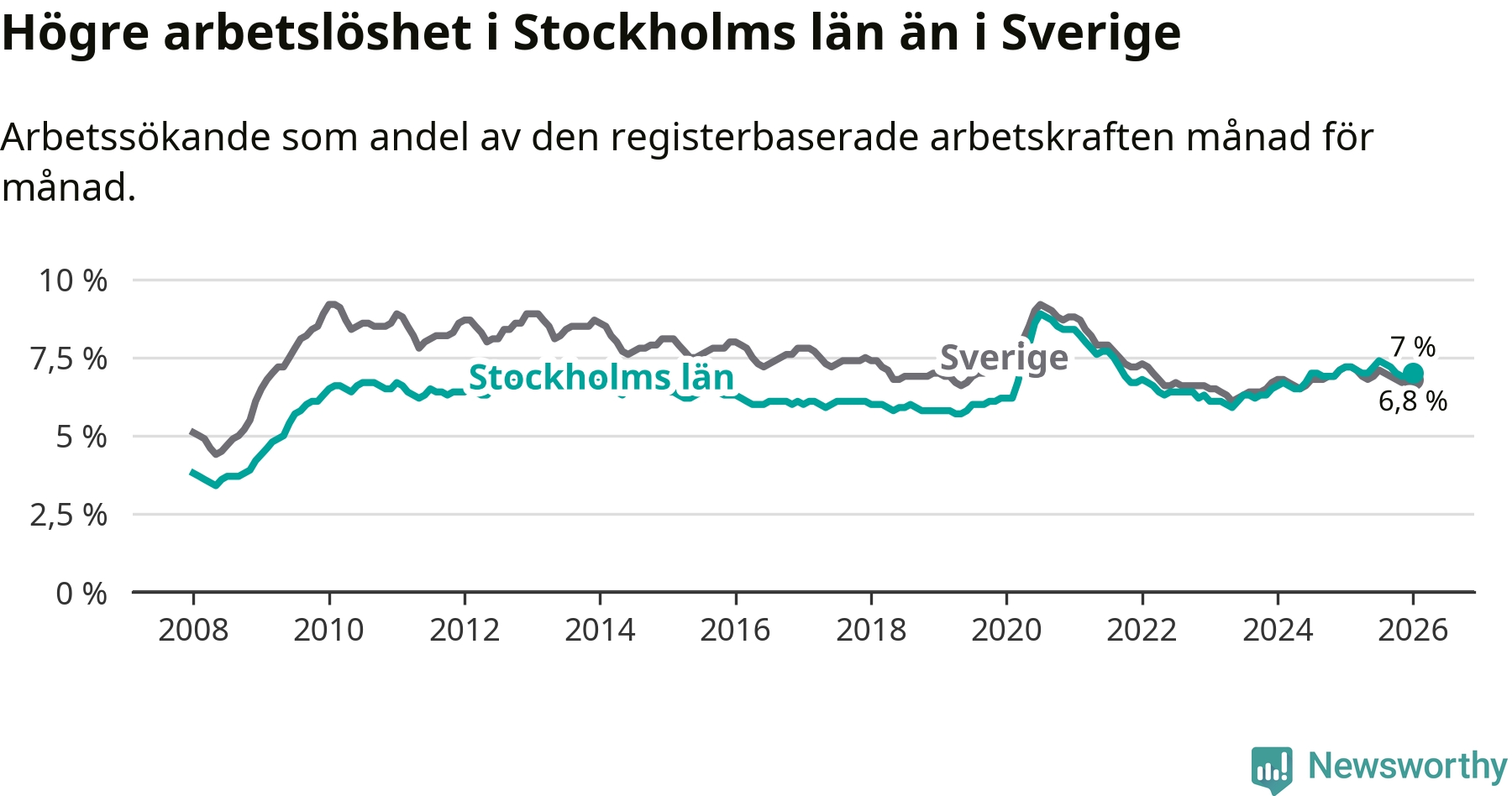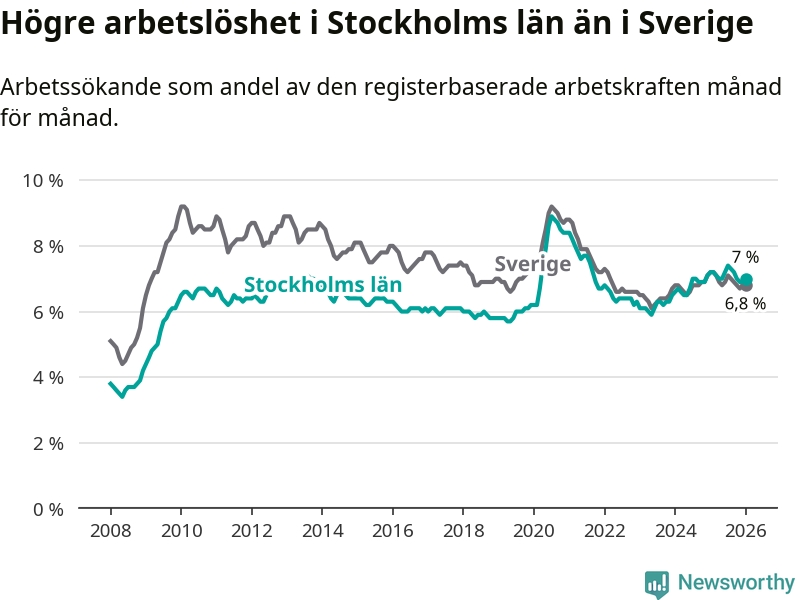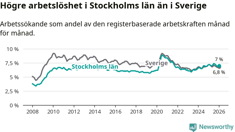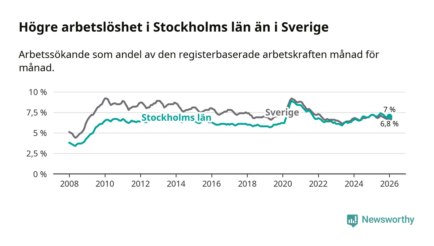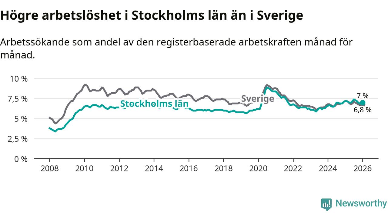 Även om arbetslösheten i Stockholm alltså minskar, så ligger den fortfarande över snittet i hela Sverige (7,0 procent i länet, jämfört med 6,8 procent i hela riket). Norrbotten har den lägsta arbetslösheten i riket (3,9 procent), medan Skåne har den högsta (8,9 procent). För att Stockholms län skulle komma ner i samma arbetslöshetsnivå som Norrbotten skulle 40 209 personer behöva sysselsättas.
