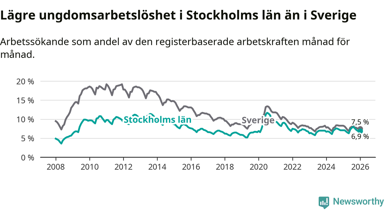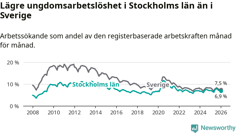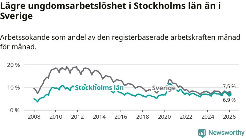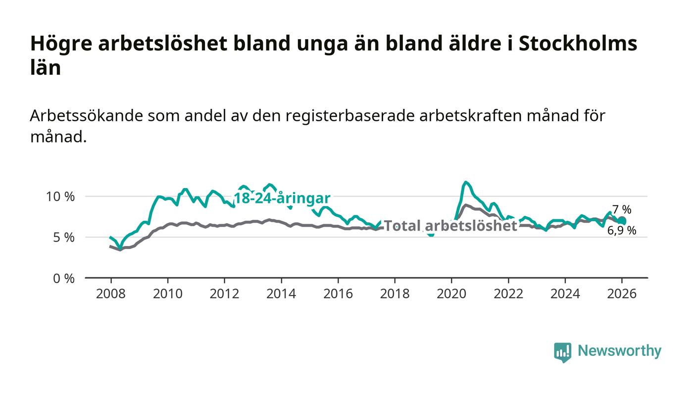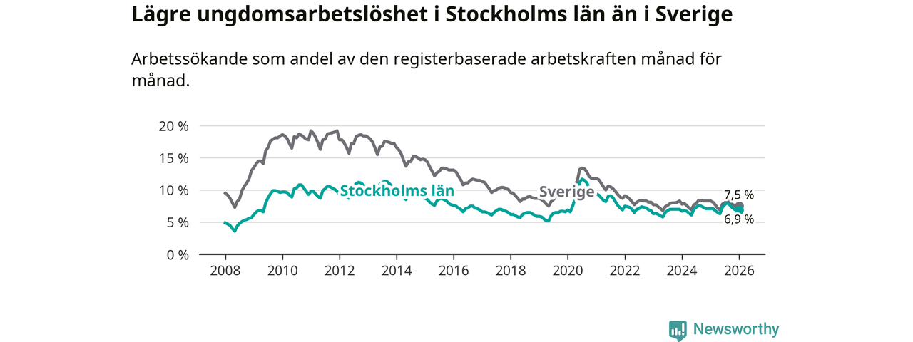 Medan Stockholms län har högre total arbetslöshet än Sverige, ligger ungdomsarbetslösheten 0,6 procentenheter lägre i Stockholm.