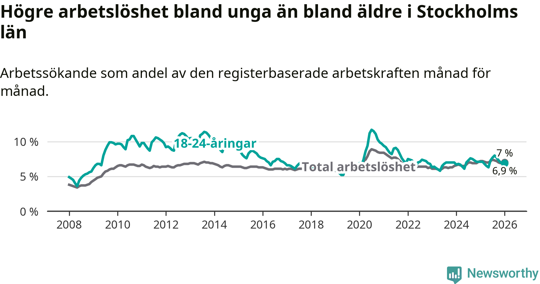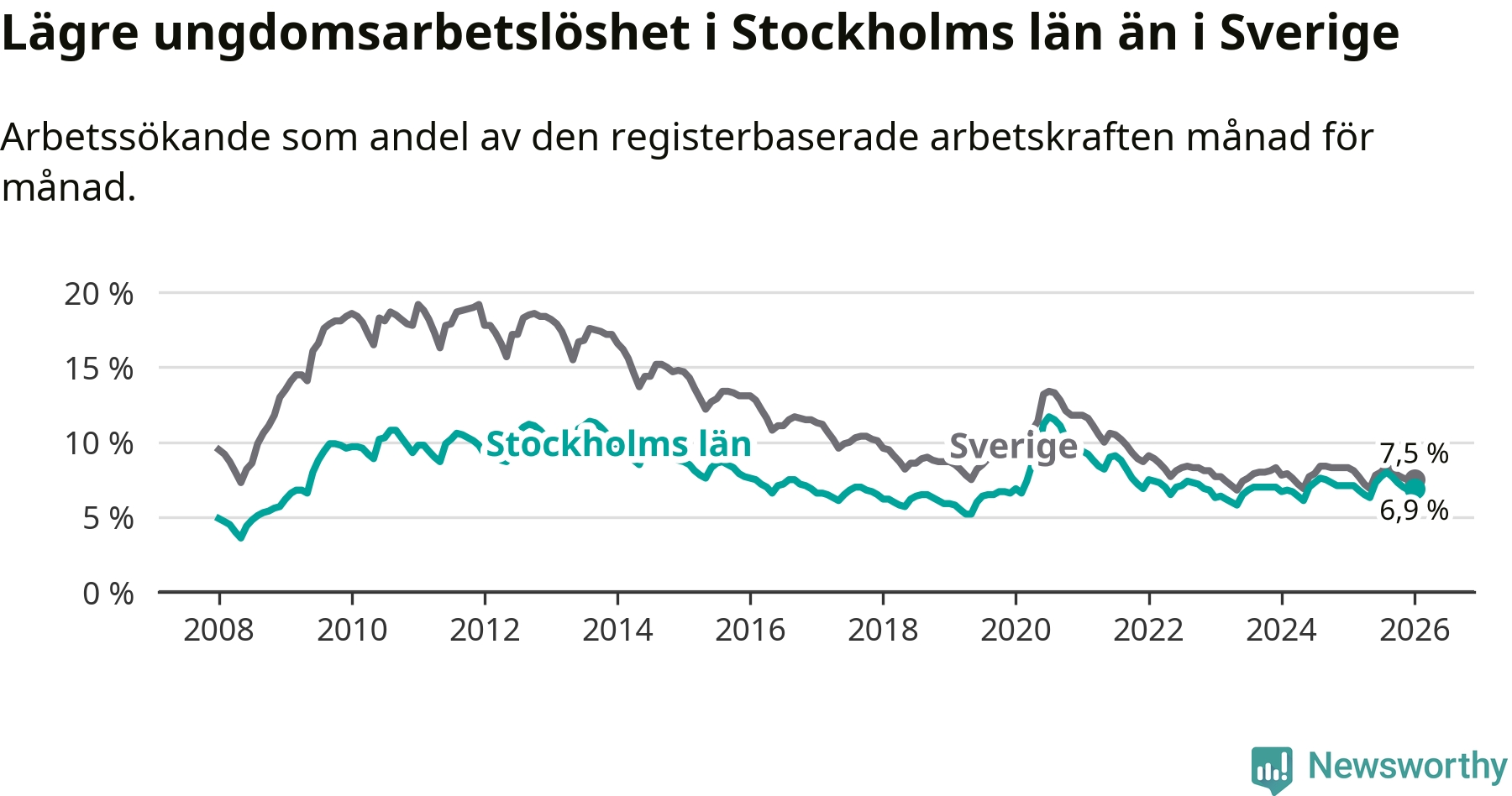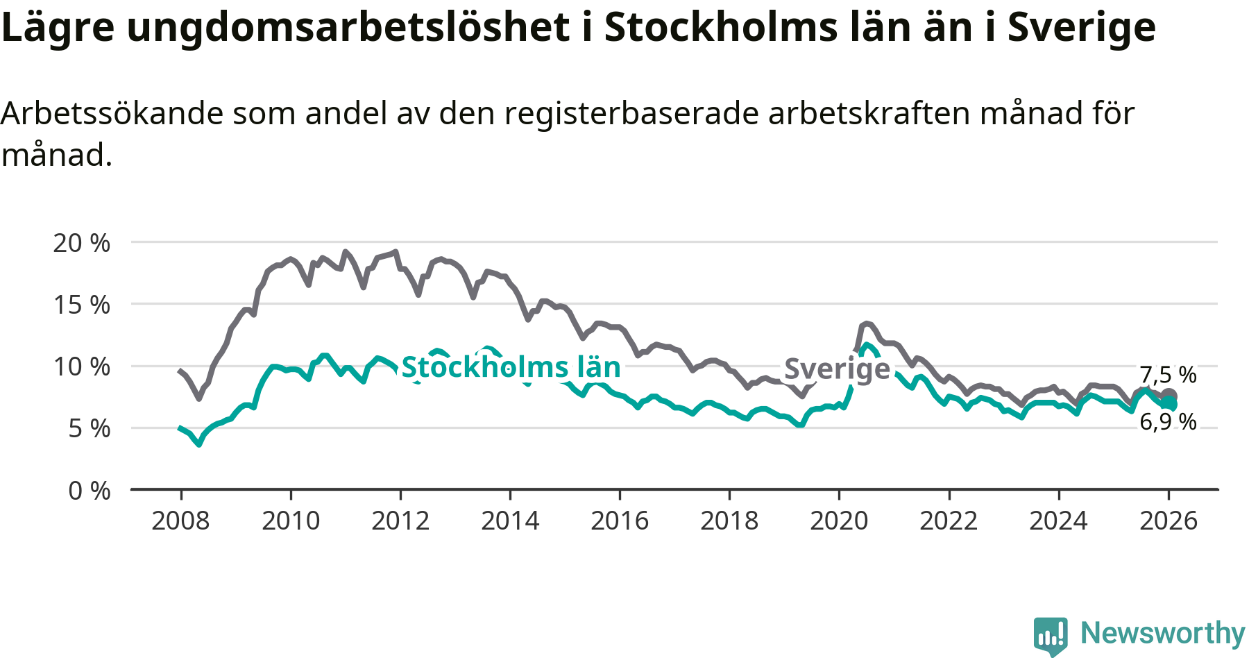 Medan Stockholms län har högre total arbetslöshet än Sverige, ligger ungdomsarbetslösheten 0,6 procentenheter lägre i Stockholm.