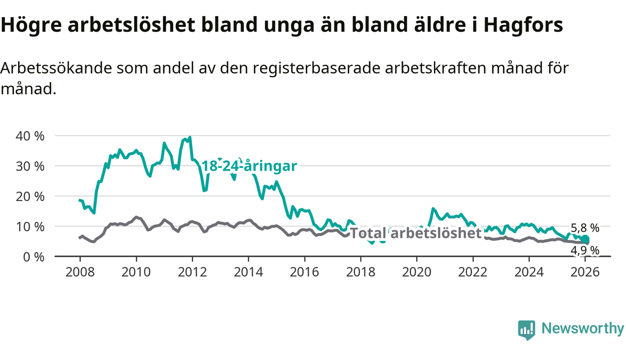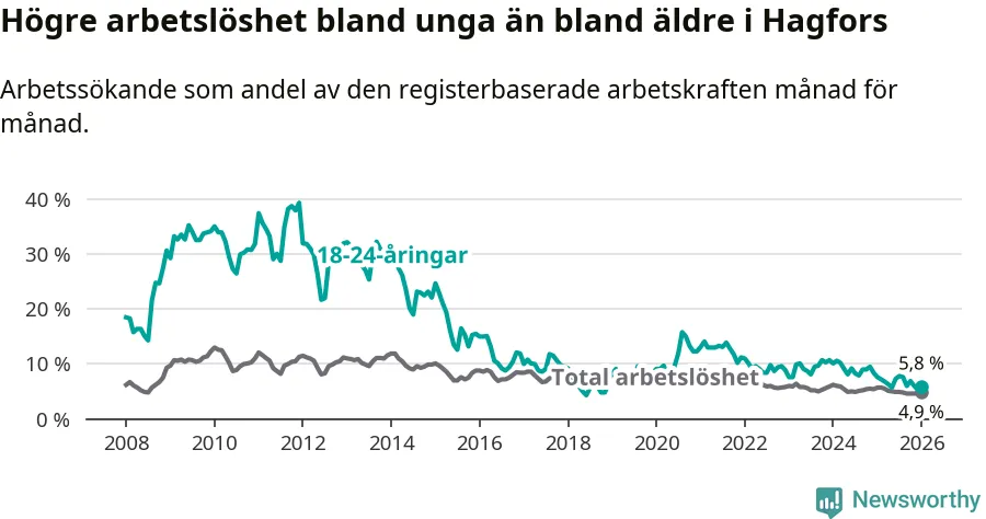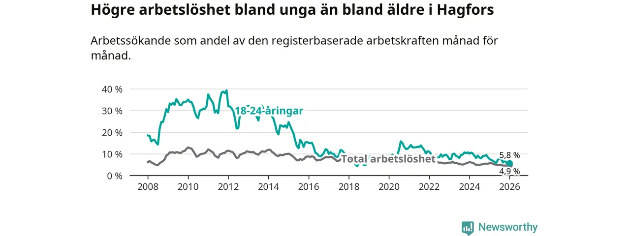 I och med den senaste månadens nedgång har de ungas arbetslöshet i Hagfors sjunkit 18 månader i följd (ner från 8,3 procent i juli 2024 till 5,8 procent nu).
