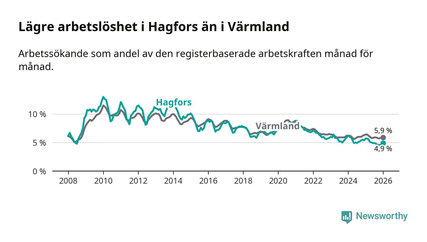 Hagfors hade redan tidigare lägre arbetslöshet än snittet i hela Värmlands län och nu växer klyftan (4,9 procent i kommunen, jämfört med 5,9 procent i hela länet). Torsby har den lägsta arbetslösheten i länet (3,6 procent), medan Filipstad har den högsta (8,5 procent). För att Hagfors skulle komma ner i samma arbetslöshetsnivå som Torsby skulle 63 personer behöva sysselsättas.