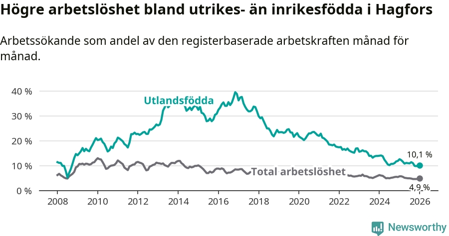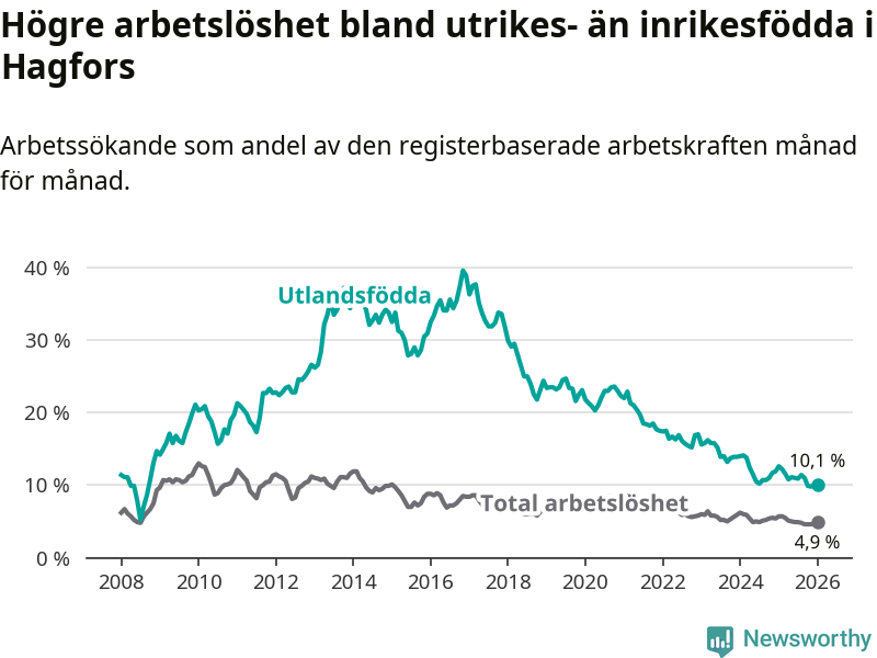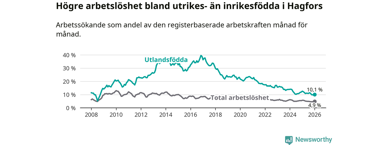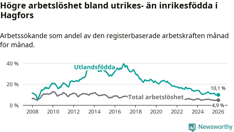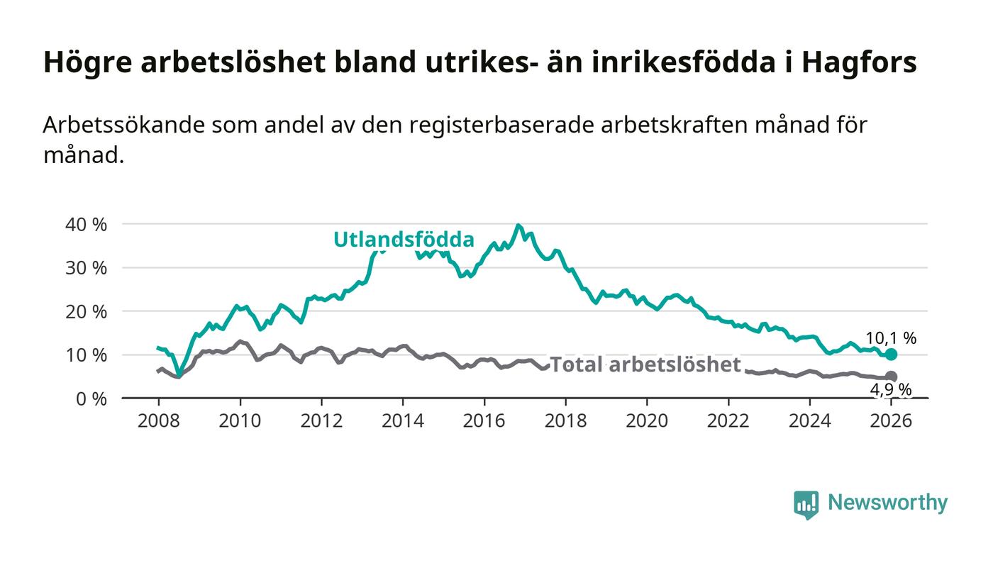 Arbetslösheten bland utlandsfödda var 10,1 procent i Hagfors under januari månad, motsvarande 84 av 832 personer. Det är 2,5 procentenheter färre än vid samma tidpunkt i fjol (−20 om man räknar personer).