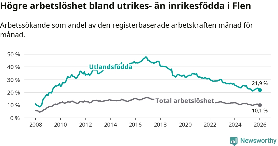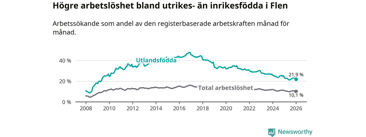 Arbetslösheten bland utlandsfödda var 21,9 procent i Flen under januari månad, motsvarande 385 av 1 758 personer. Det är 1,3 procentenheter färre än vid samma tidpunkt i fjol (−31 om man räknar personer). Därmed har de utlandsföddas arbetslöshet varit lägre än vid samma tidpunkt i fjol i över fyra år i sträck. Sedan februari 2021 har arbetslösheten bland utlandsfödda minskat från 32,1 till 21,9 procent.