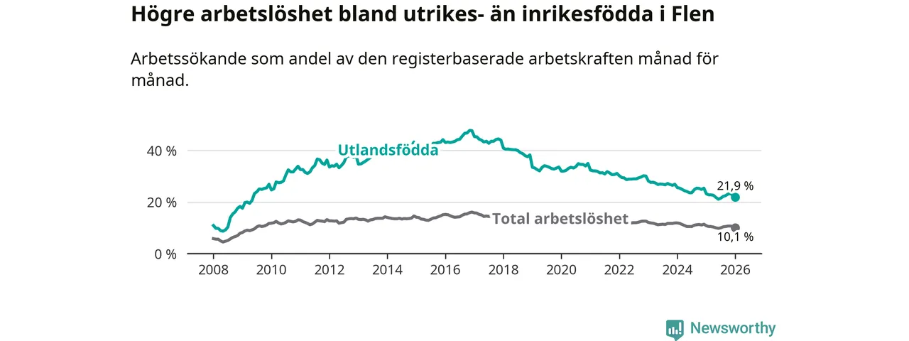 Skillnaden i arbetslöshet mellan utrikesfödda och hela befolkningen är 11,8 procentenheter i Flen. Det är en mindre skillnad än för ett år sedan (−0,6 procentenheter).