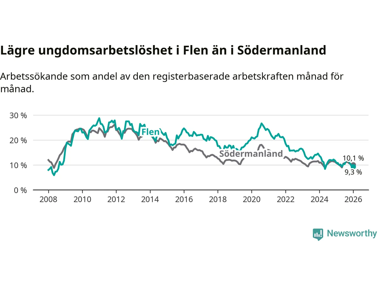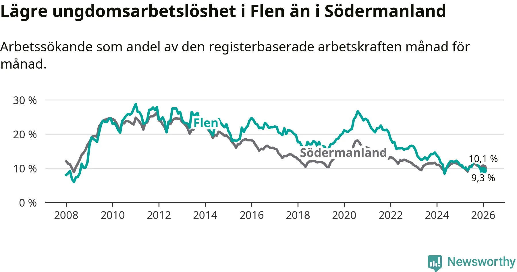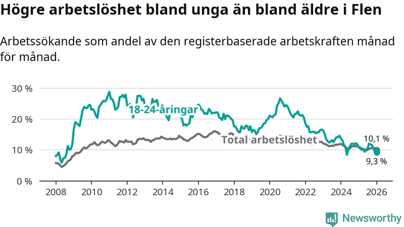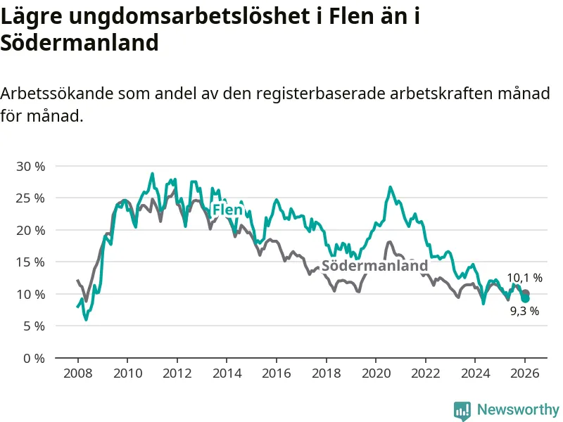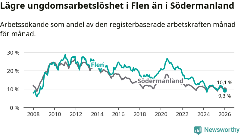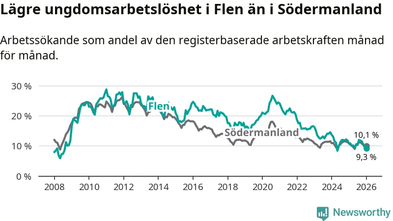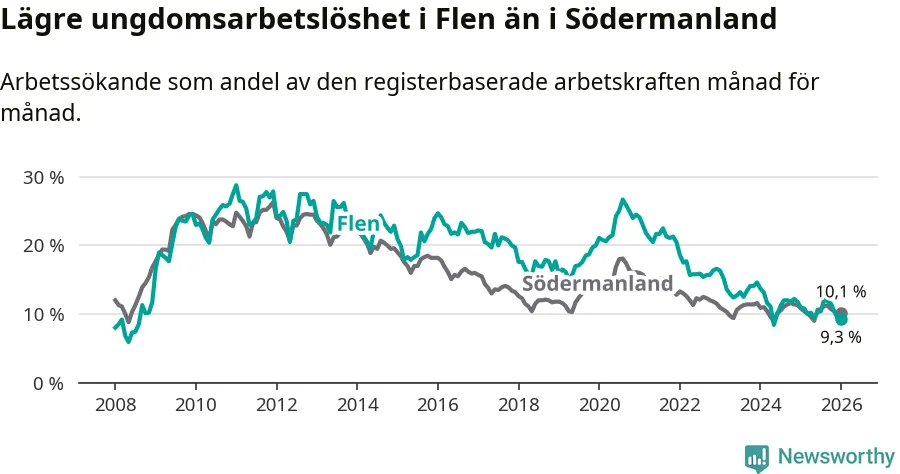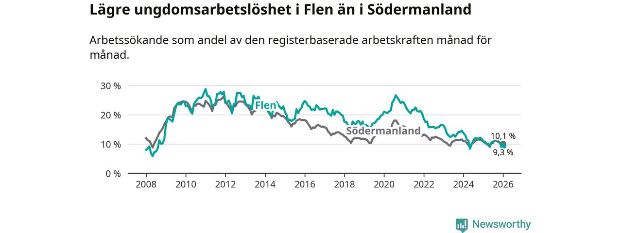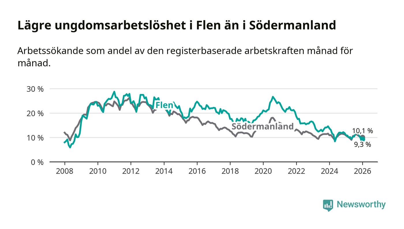 Medan Flen har högre total arbetslöshet än Södermanland, ligger ungdomsarbetslösheten 0,8 procentenheter lägre i Flen.
