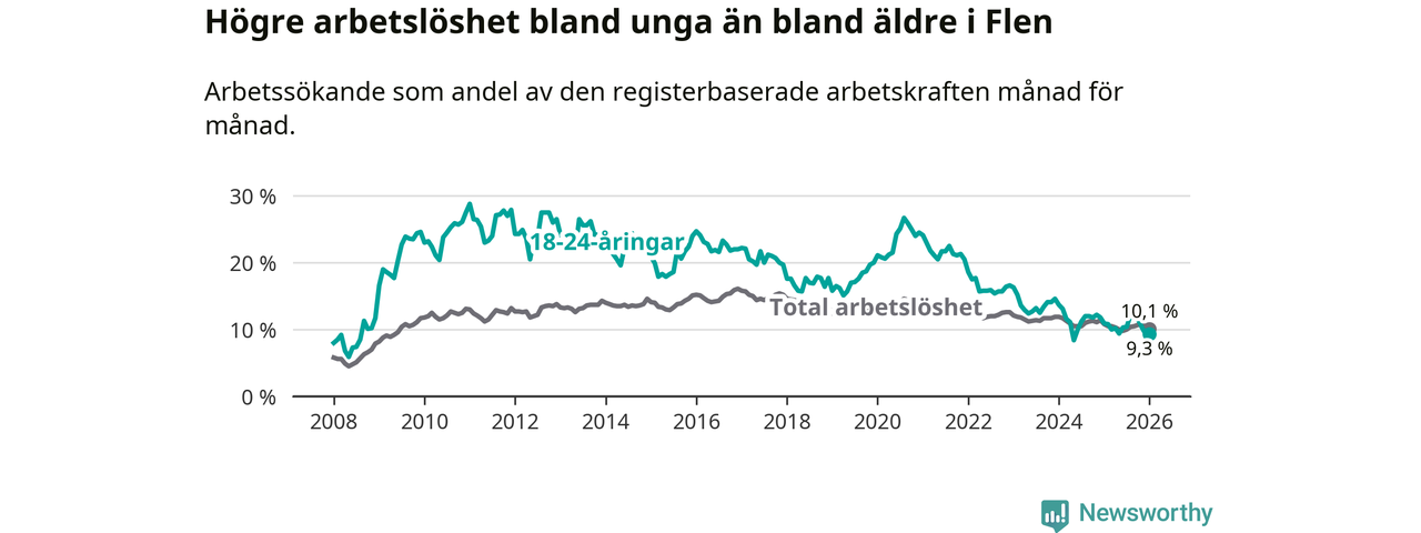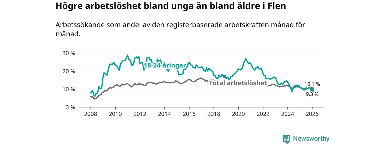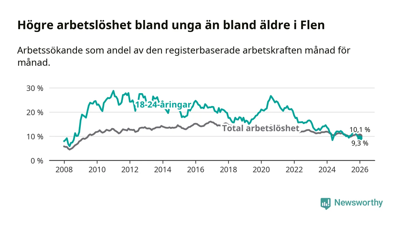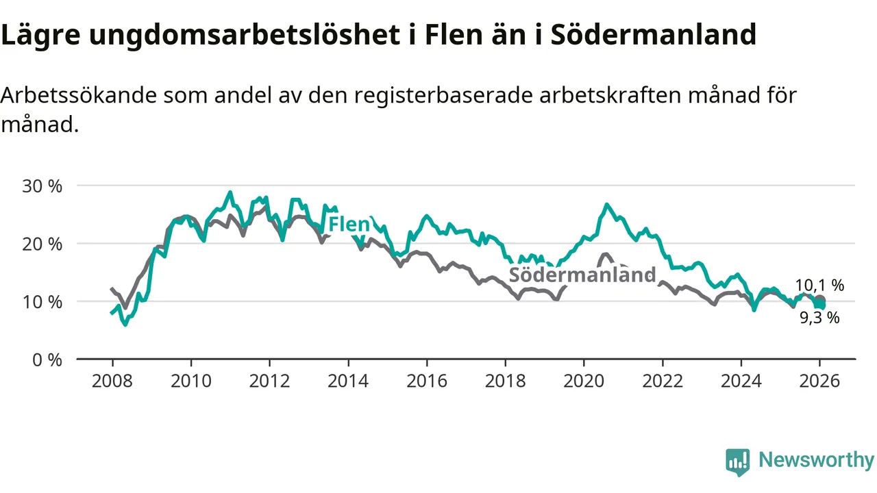 Graf: Arbetslöshet bland unga i Flens kommun och Södermanlands län